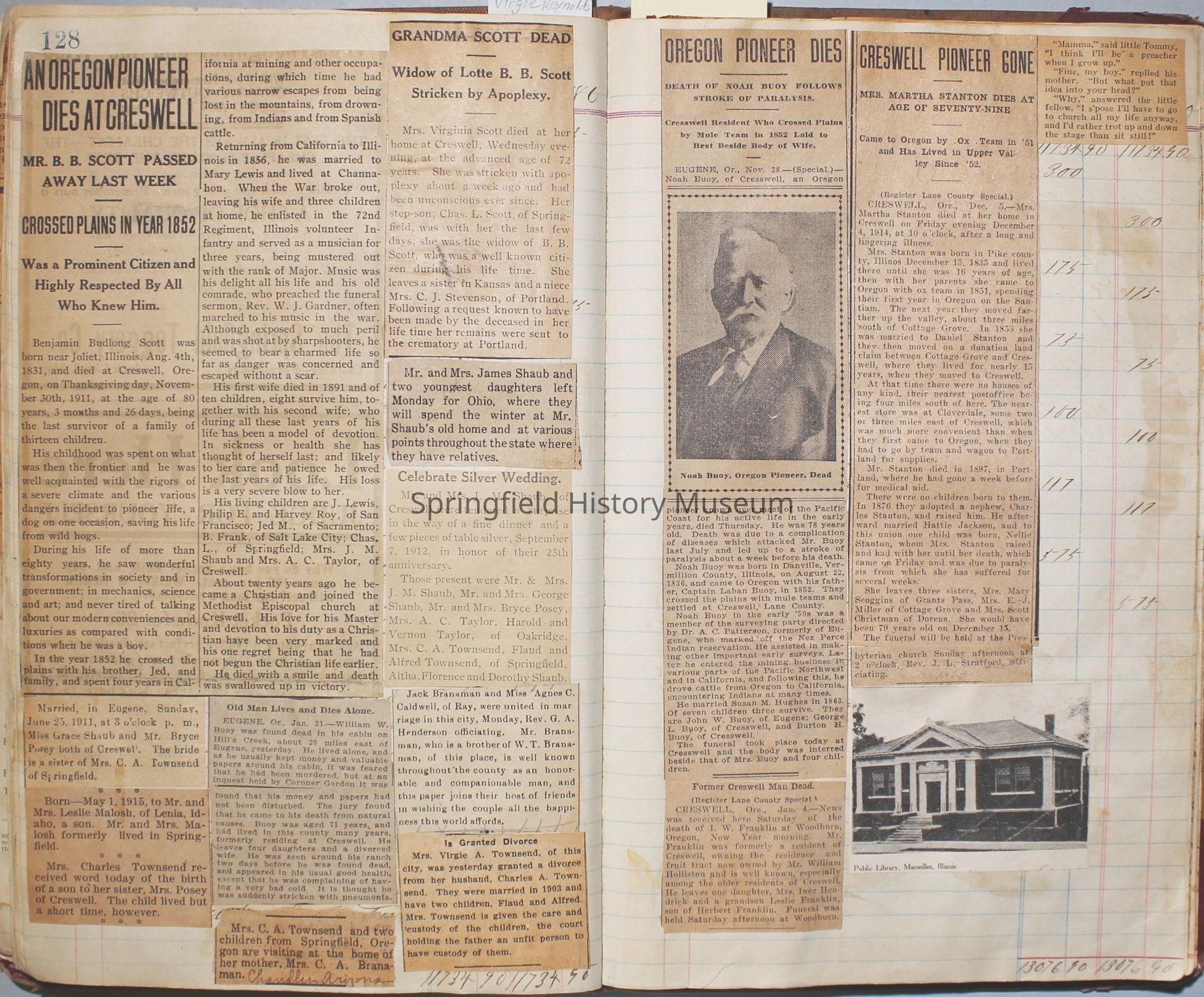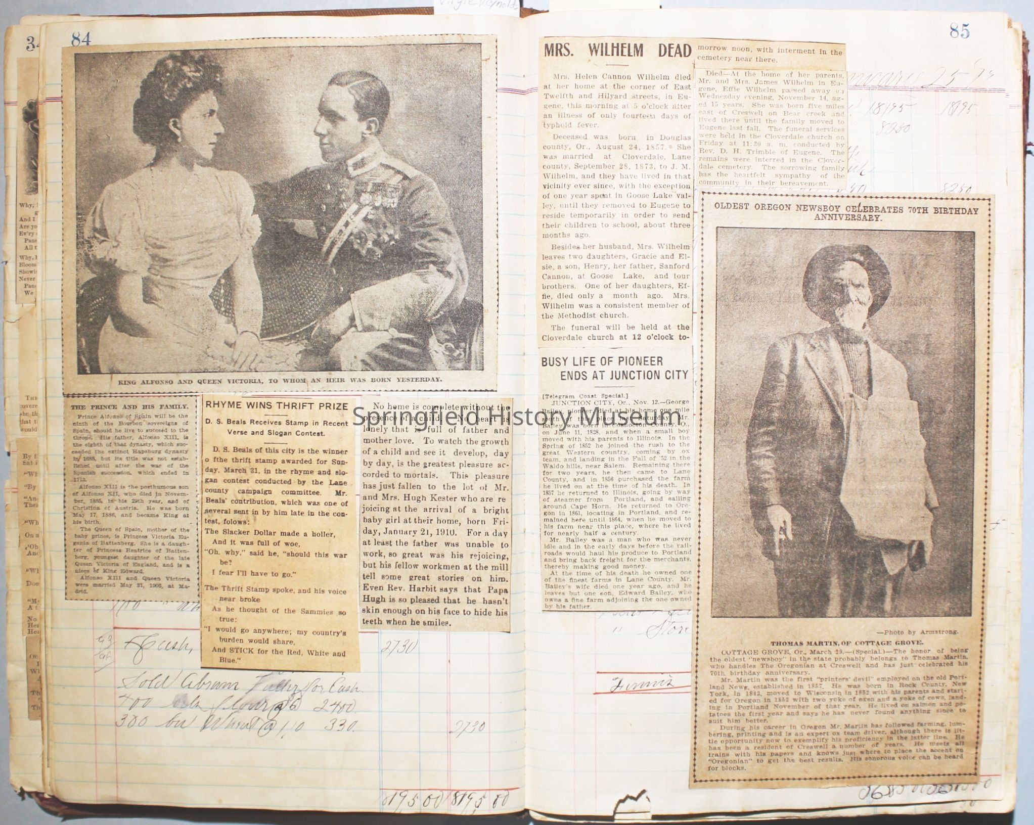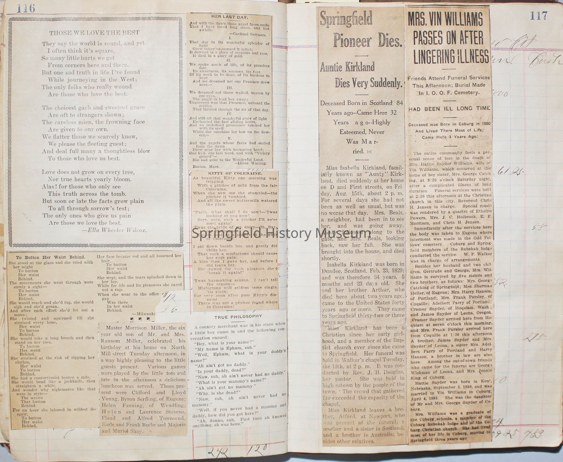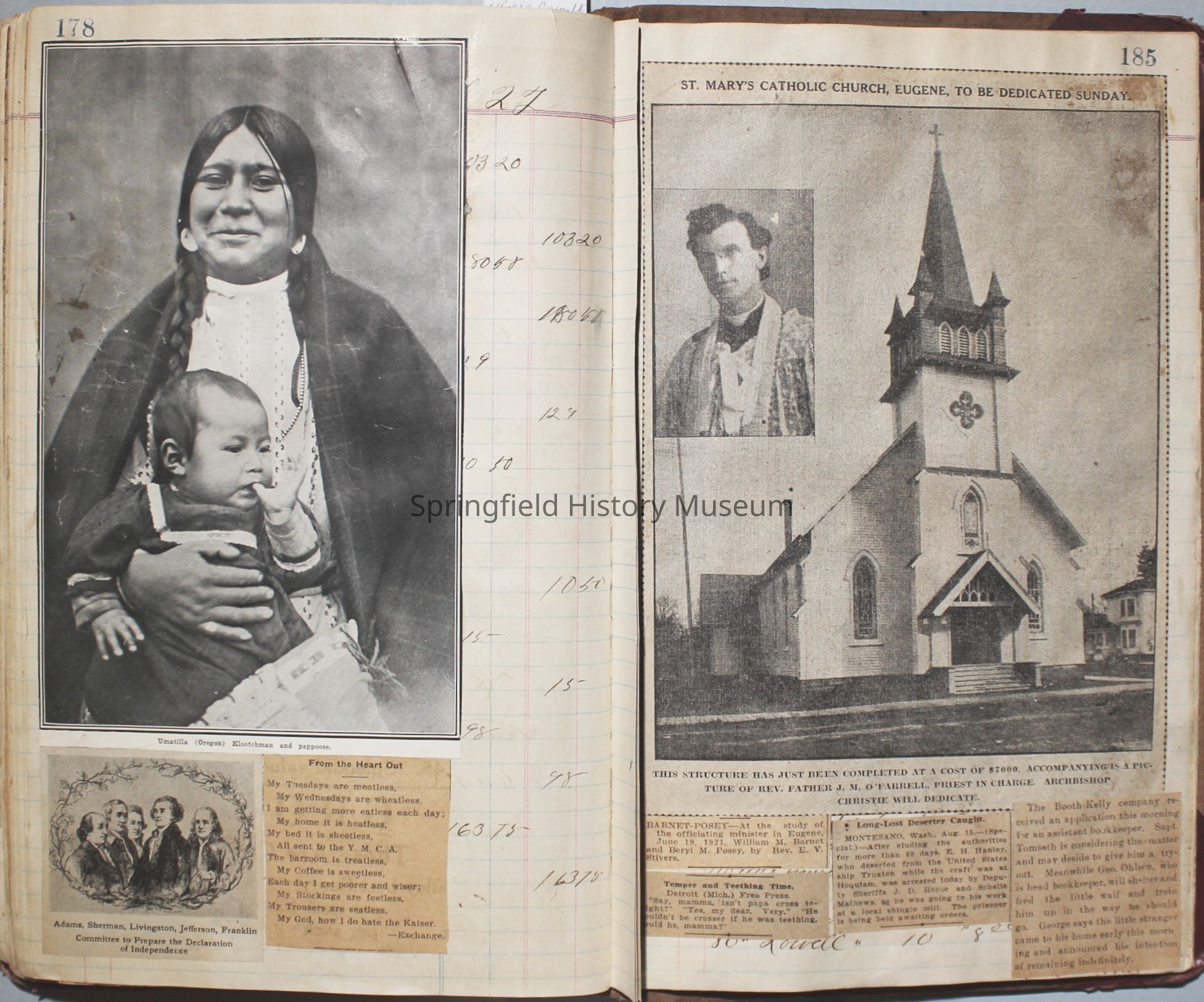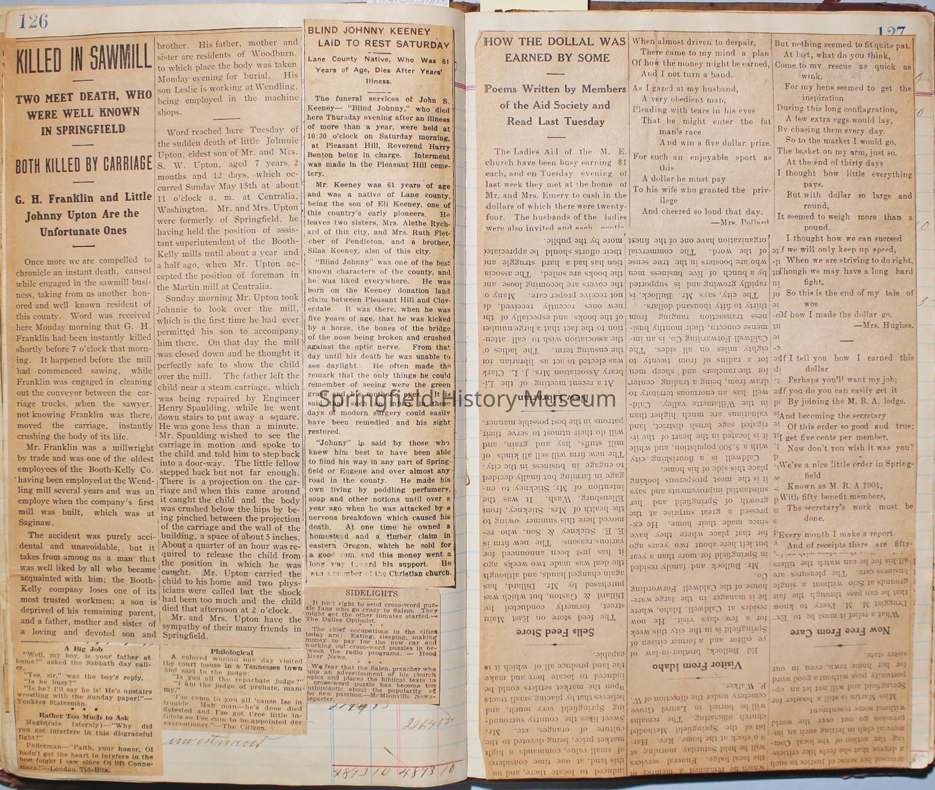 Content highlights: newspaper clippings about Cresswell, Springfield and surrounding area, Portland and a few national level articles (weddings, babies, obituaries, events, announcements, poems, songs, sayings, advertisements etc.). Many clippings about Townsend and Shaub families (family history resource). Also contains quilting and embroidery pattern clippings.