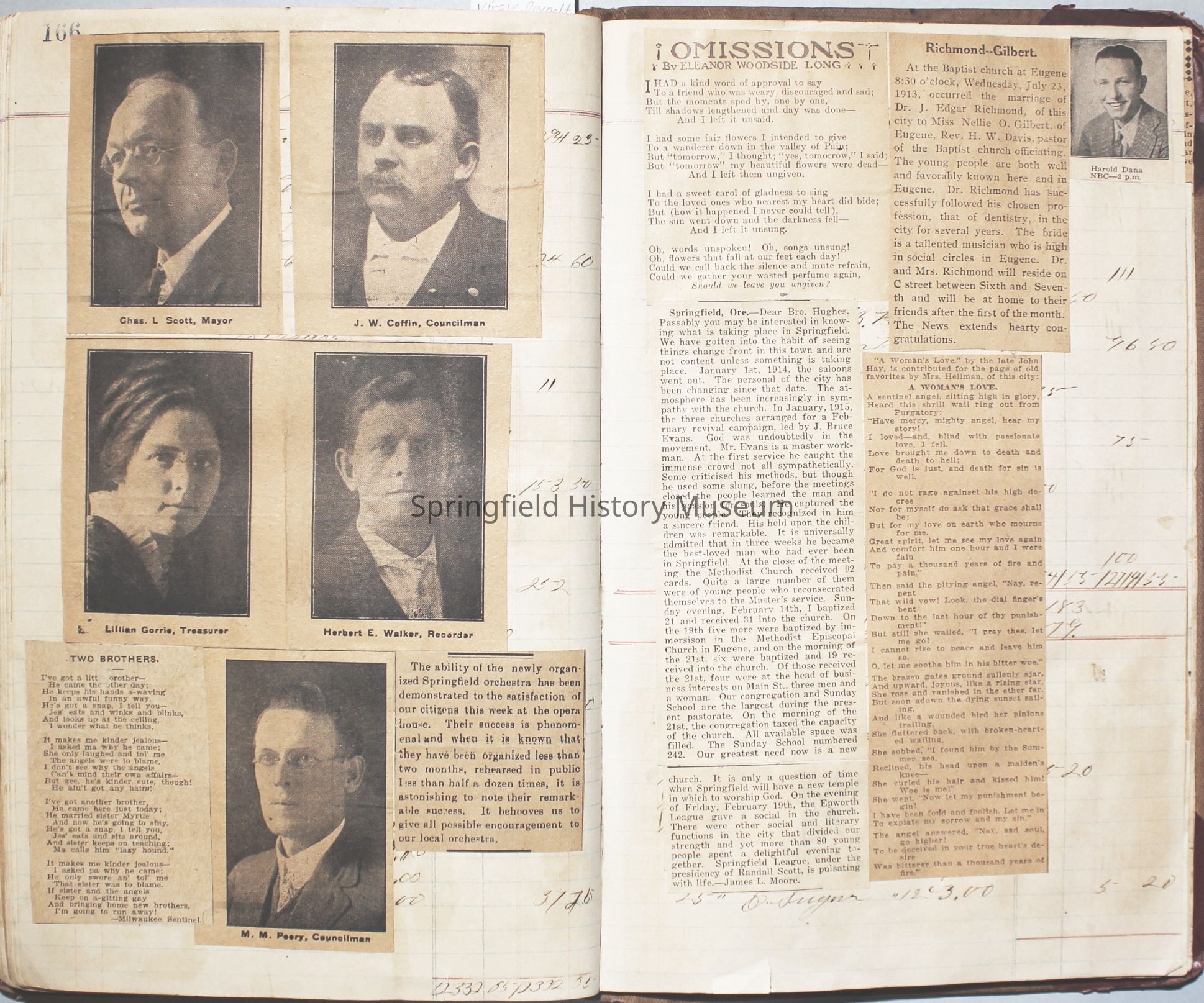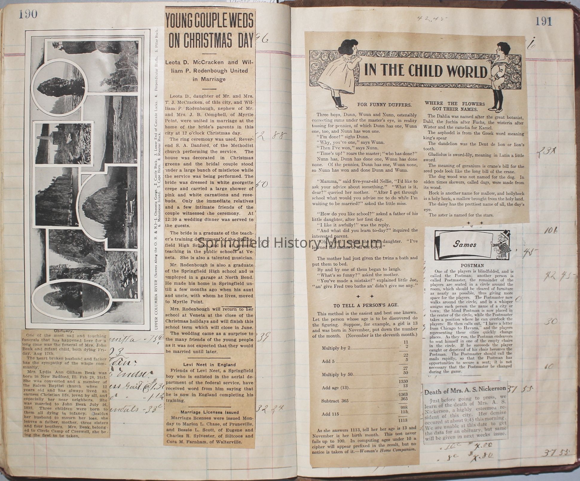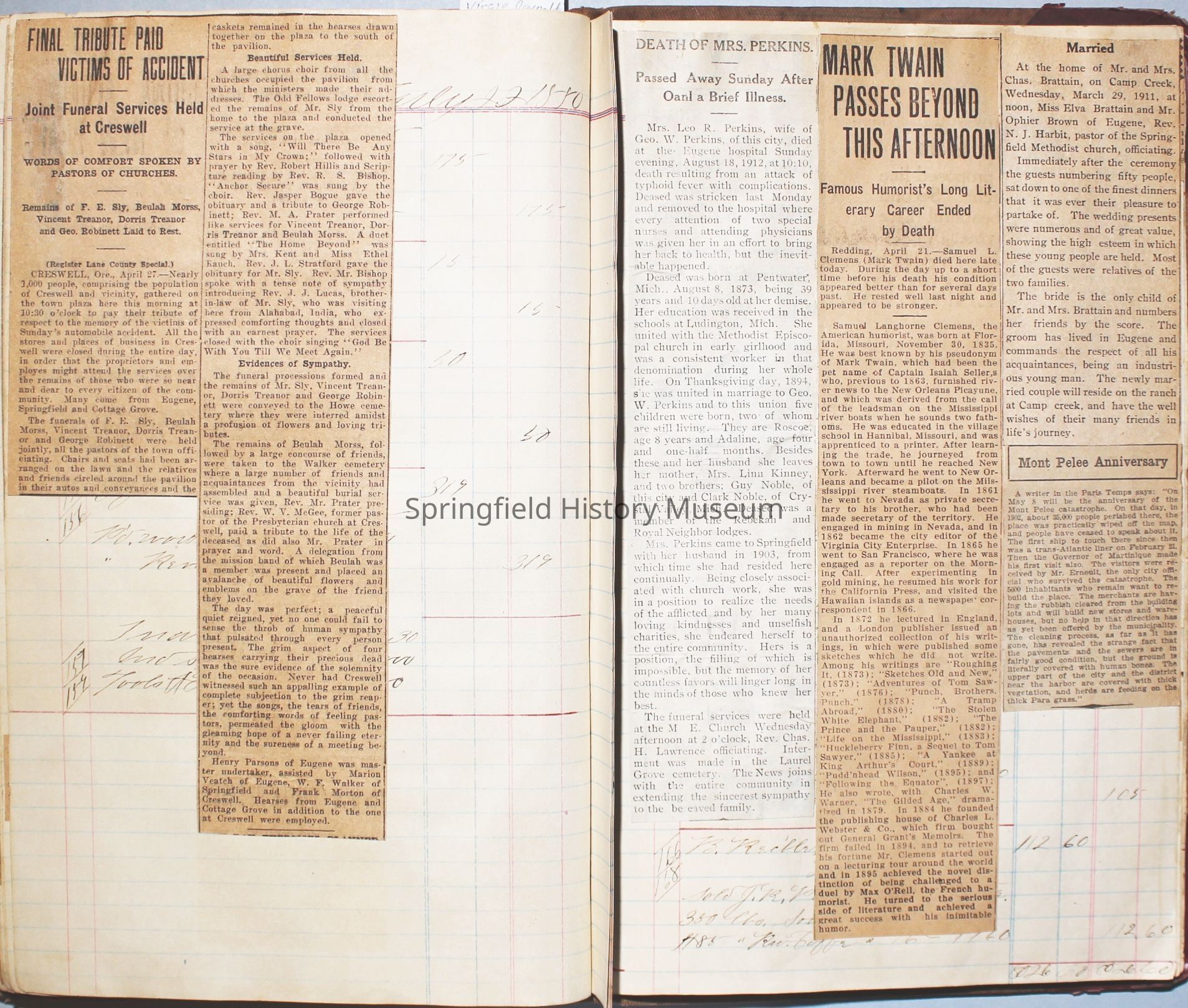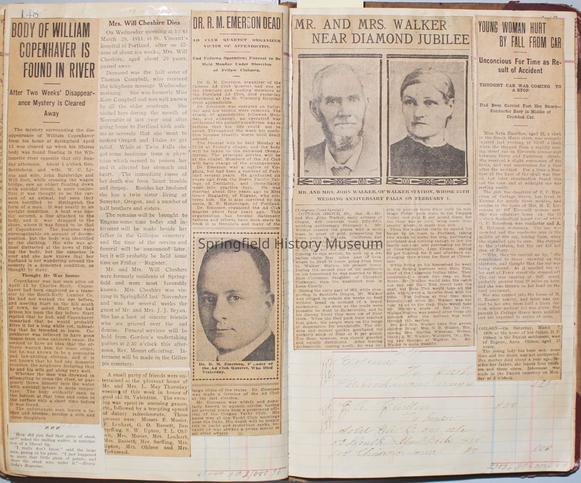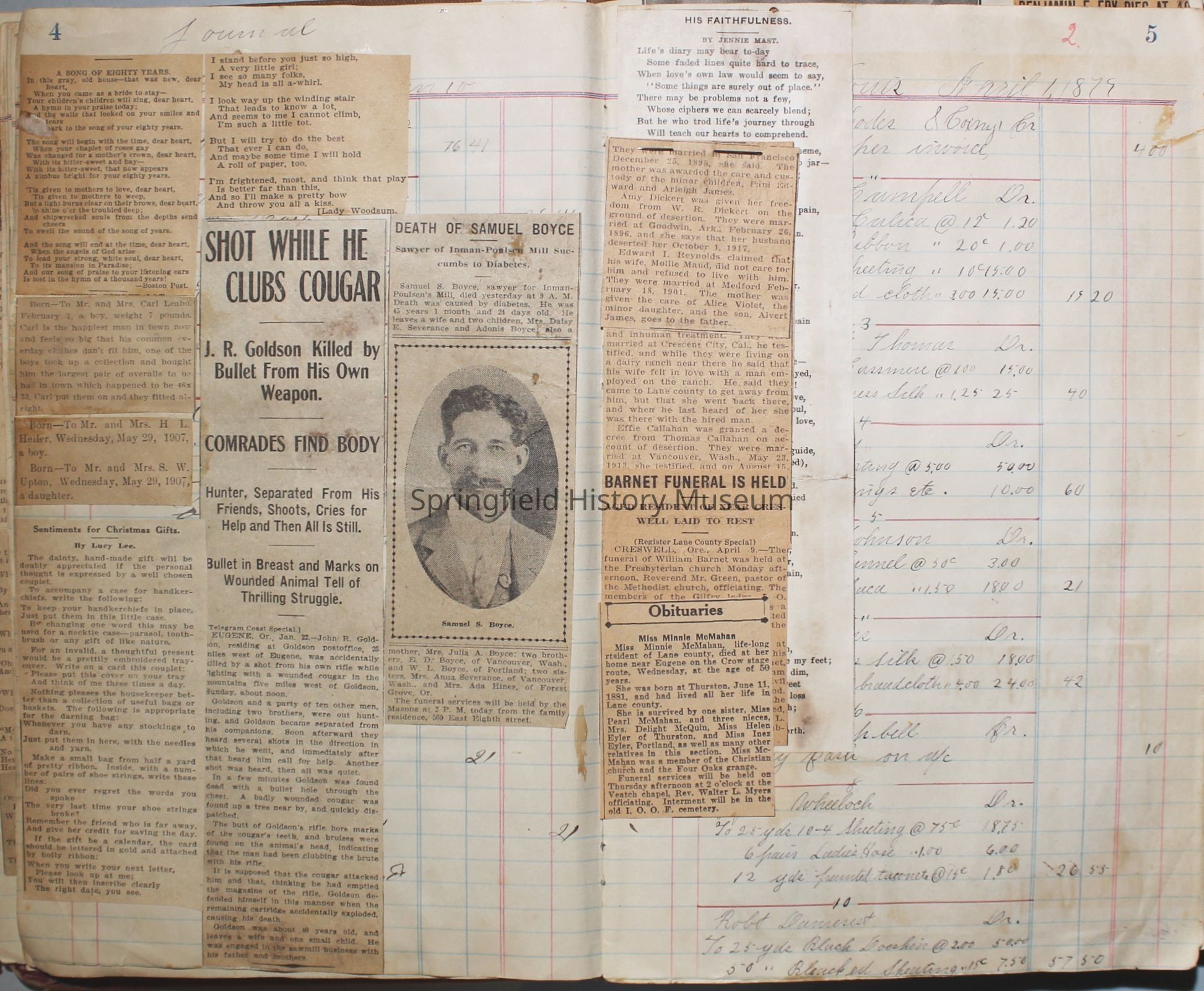 Content highlights: newspaper clippings about Cresswell, Springfield and surrounding area, Portland and a few national level articles (weddings, babies, obituaries, events, announcements, poems, songs, sayings, advertisements etc.). Many clippings about Townsend and Shaub families (family history resource). Also contains quilting and embroidery pattern clippings.