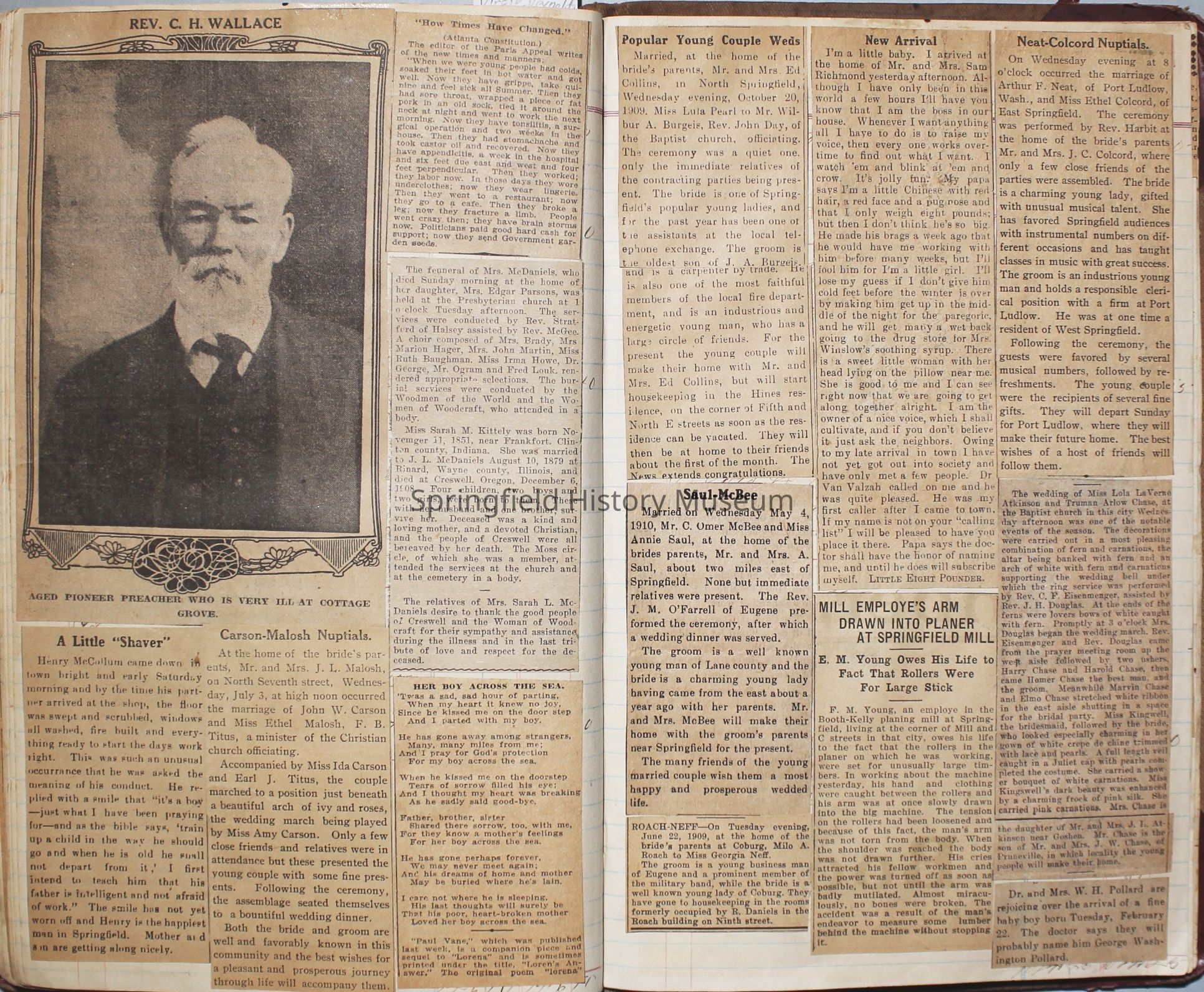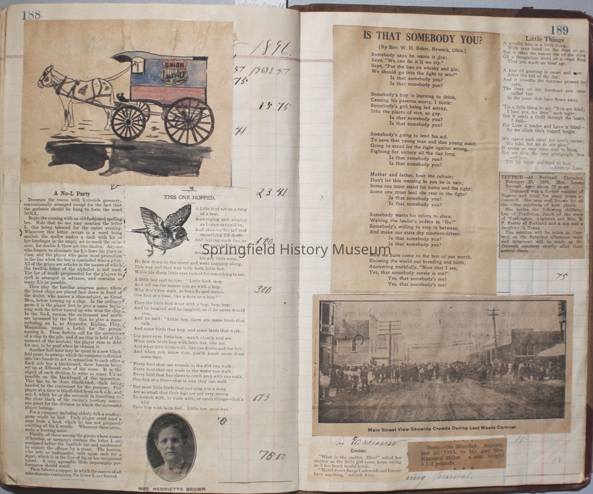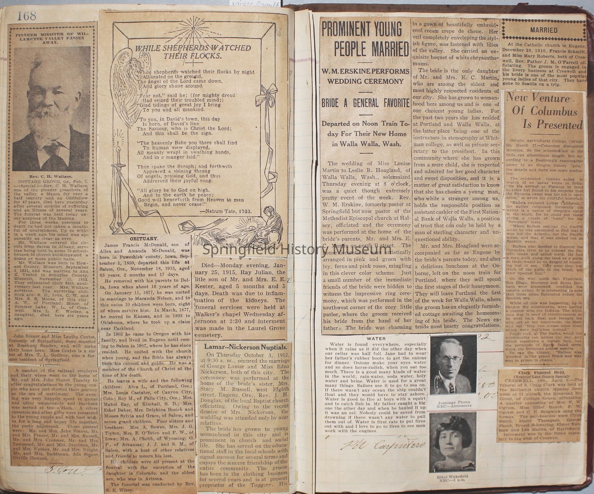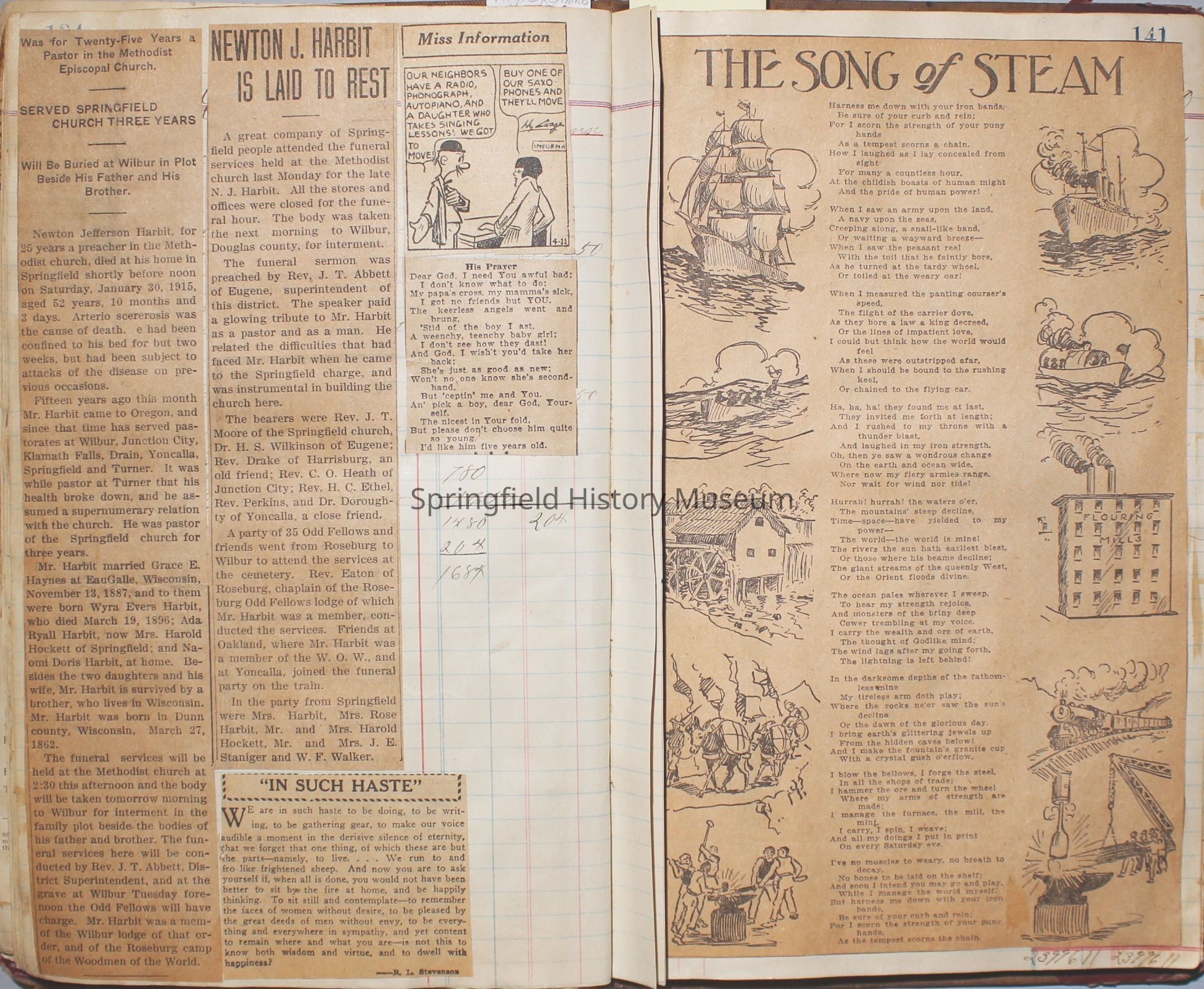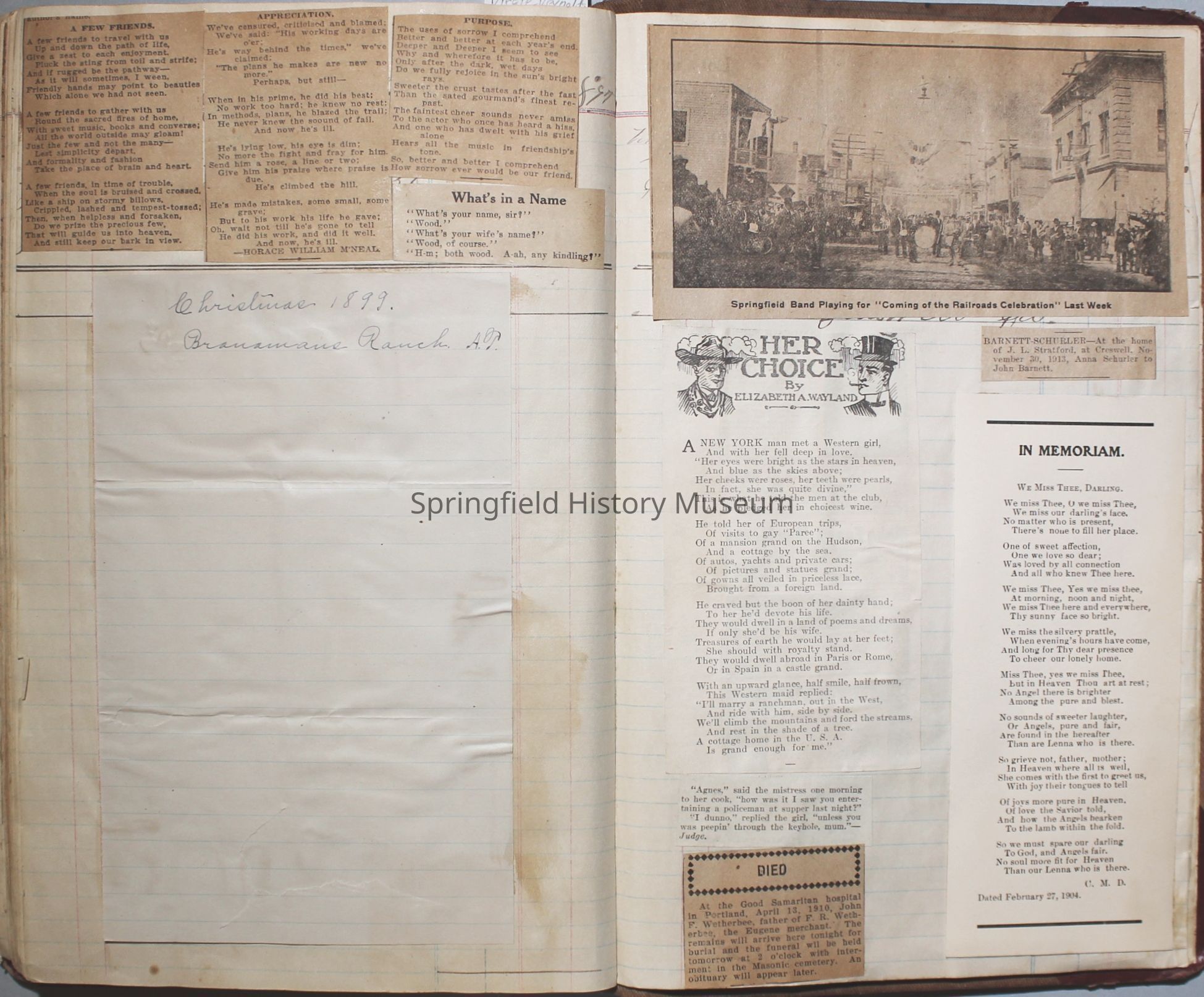 Content highlights: newspaper clippings about Cresswell, Springfield and surrounding area, Portland and a few national level articles (weddings, babies, obituaries, events, announcements, poems, songs, sayings, advertisements etc.). Many clippings about Townsend and Shaub families (family history resource). Also contains quilting and embroidery pattern clippings.