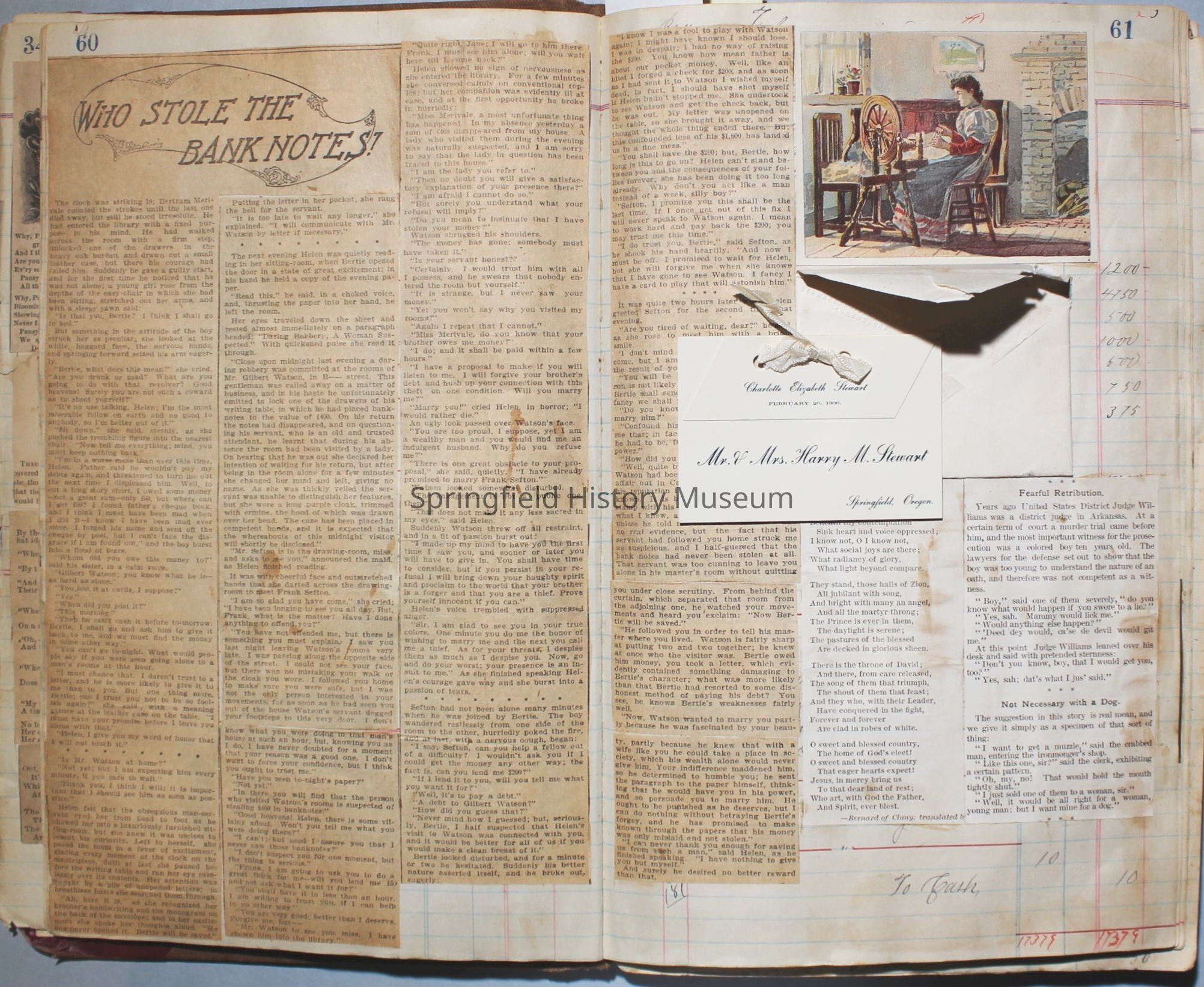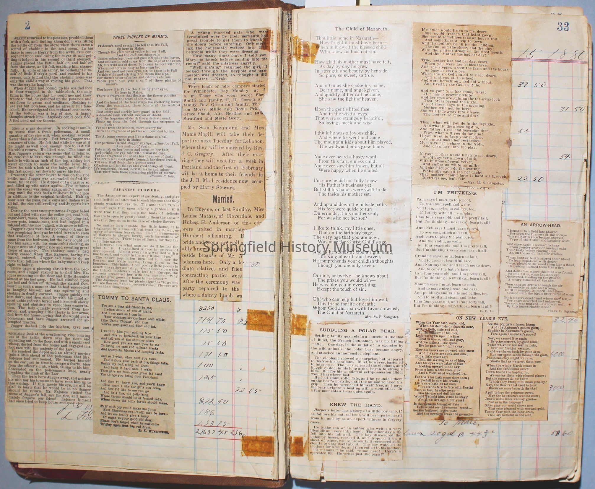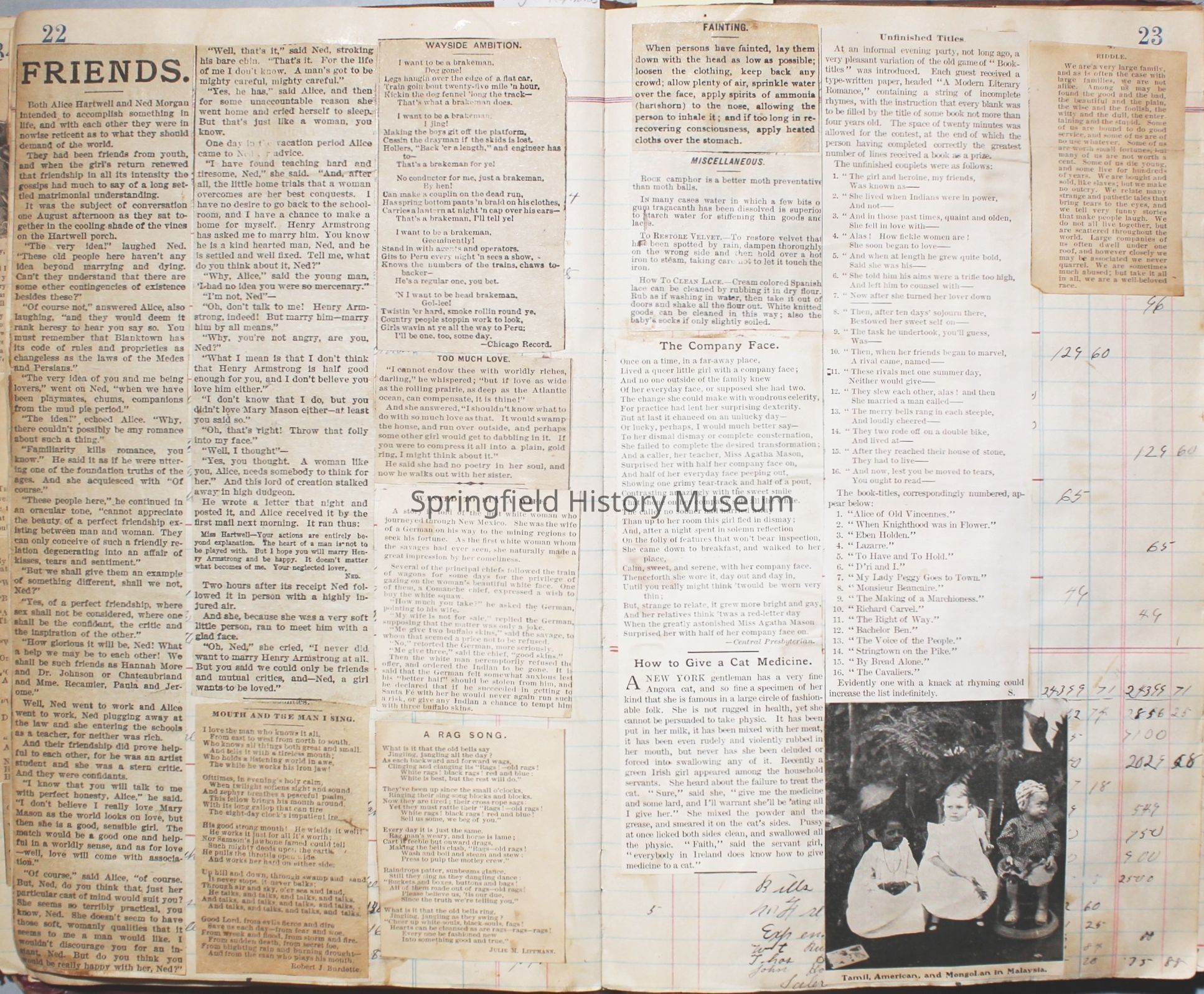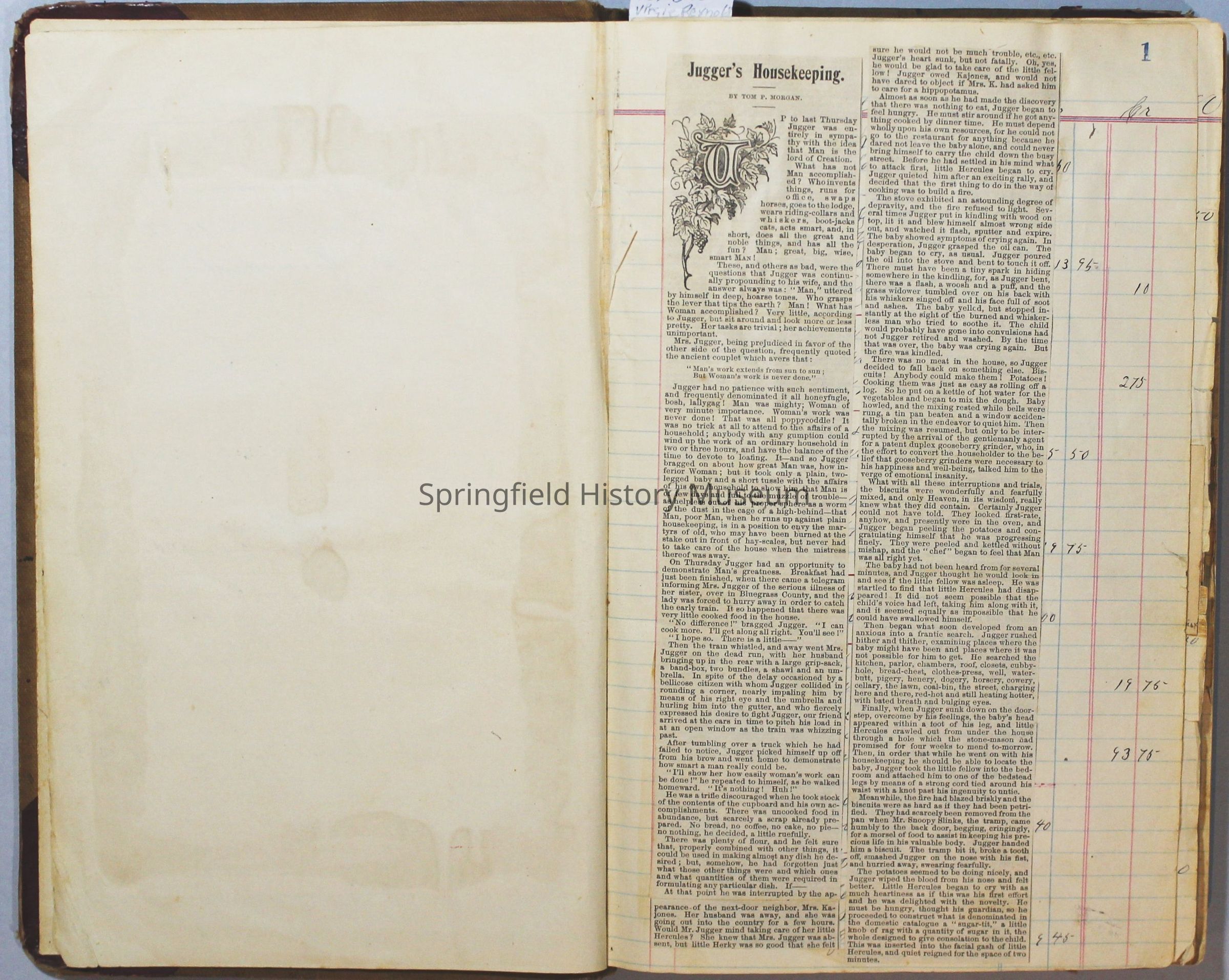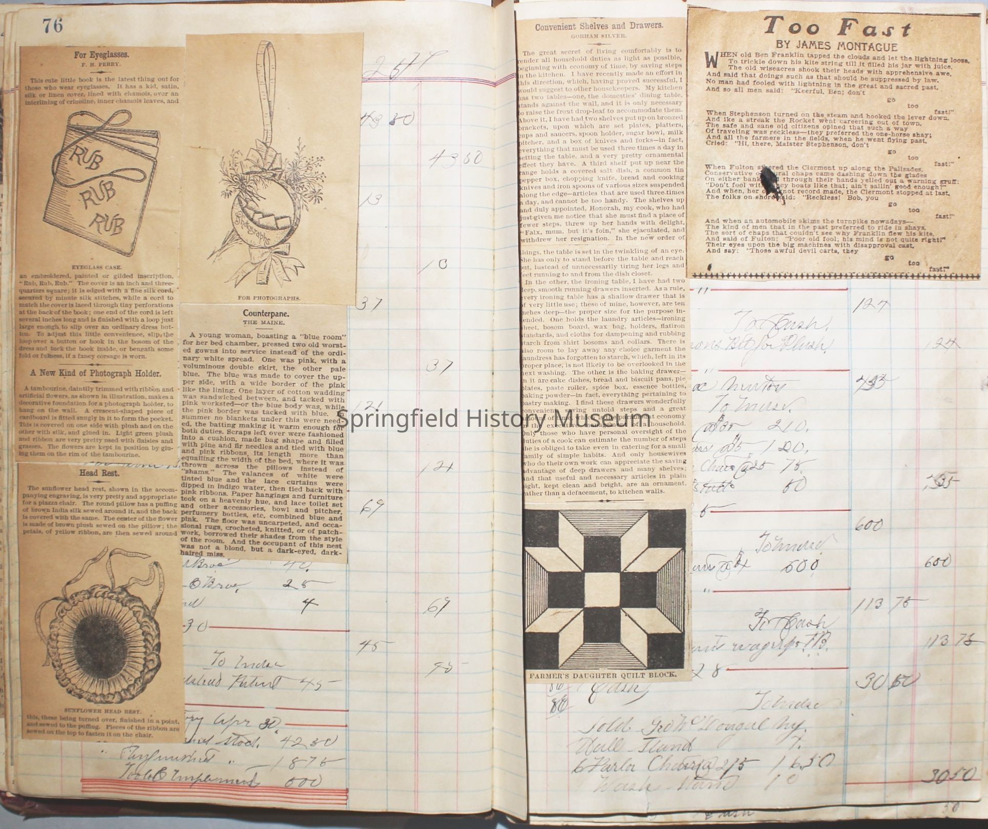 The scrapbook is made from an old ledger (circa 1899) containing furniture orders and/or money transactions (Cresswell).Collection