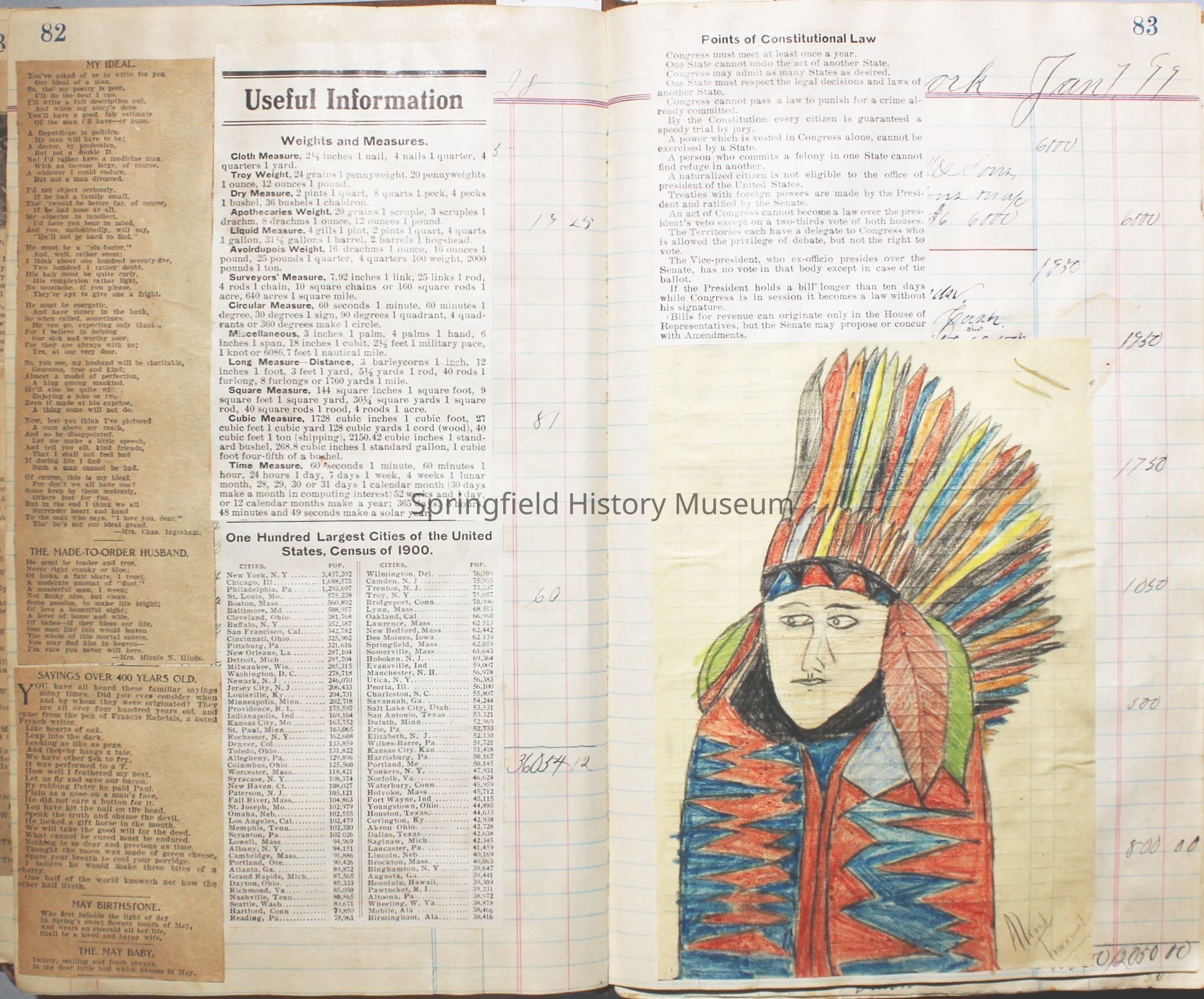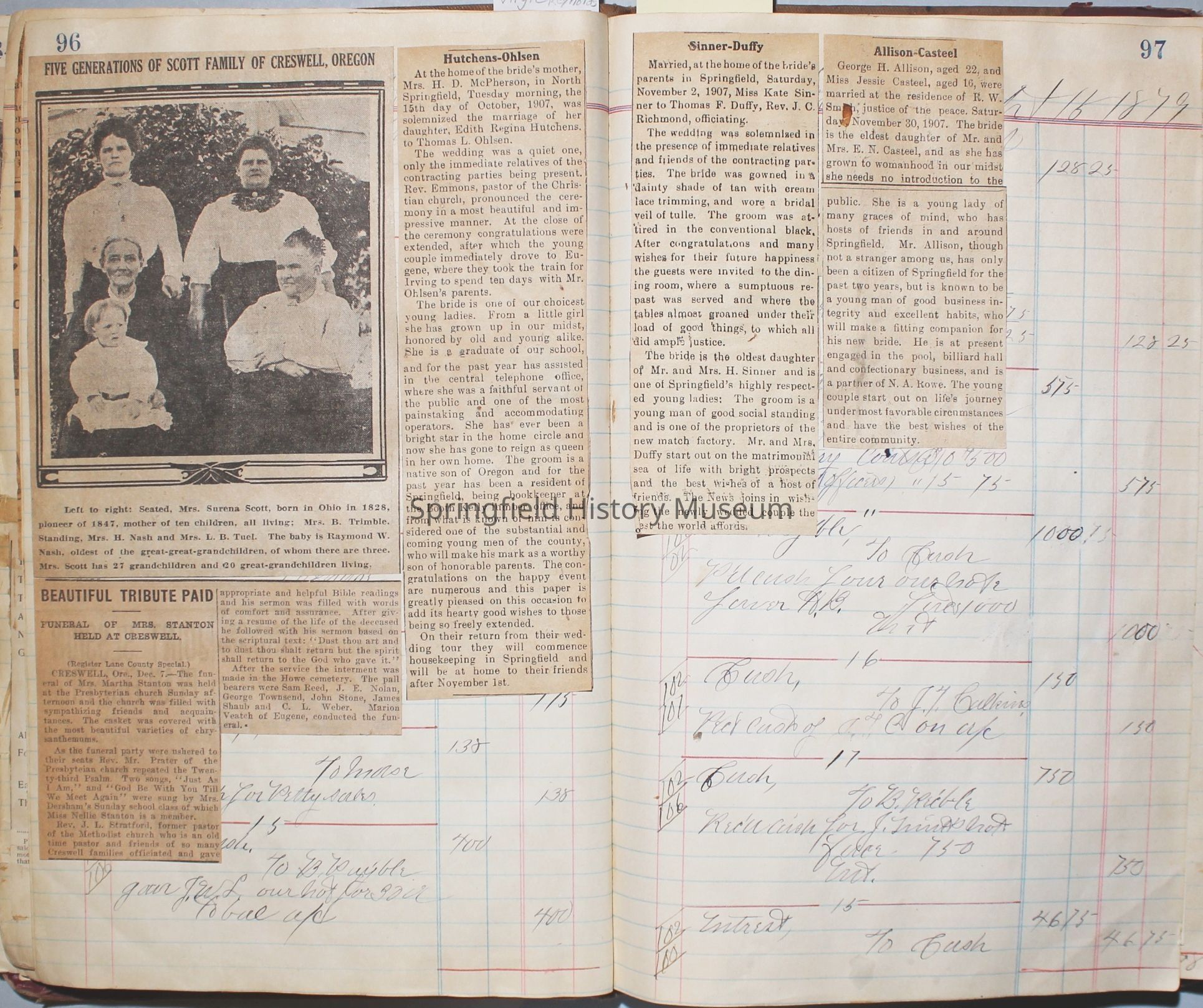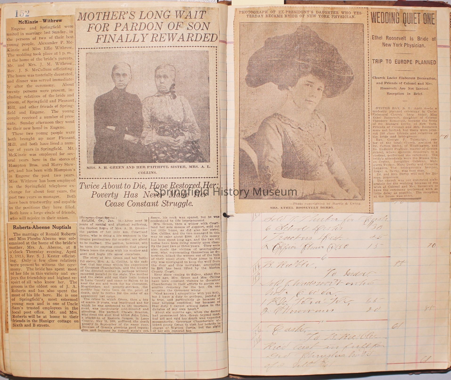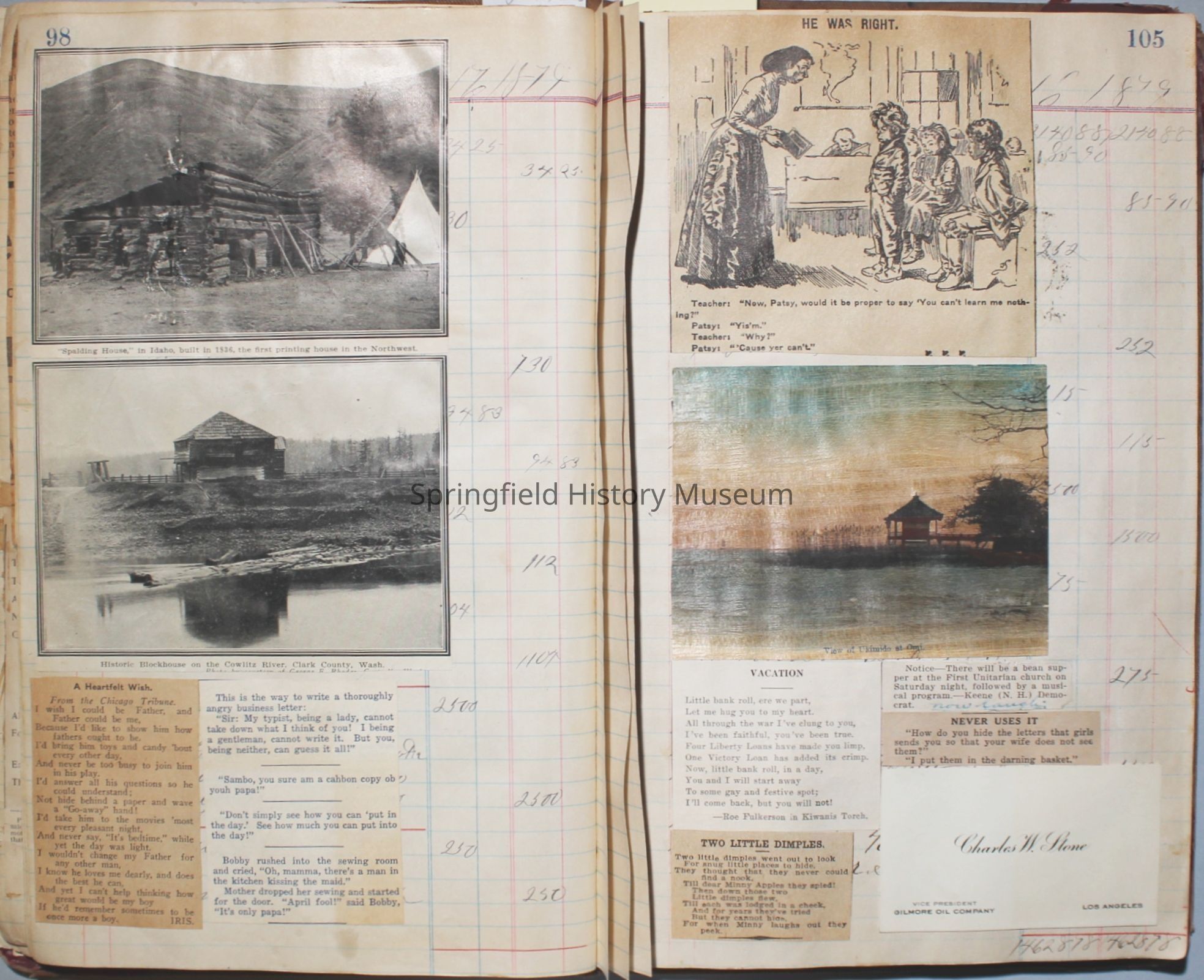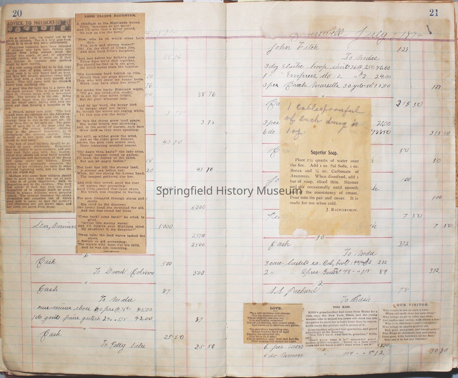 The scrapbook is made from an old ledger (circa 1899) containing furniture orders and/or money transactions (Cresswell).Collection