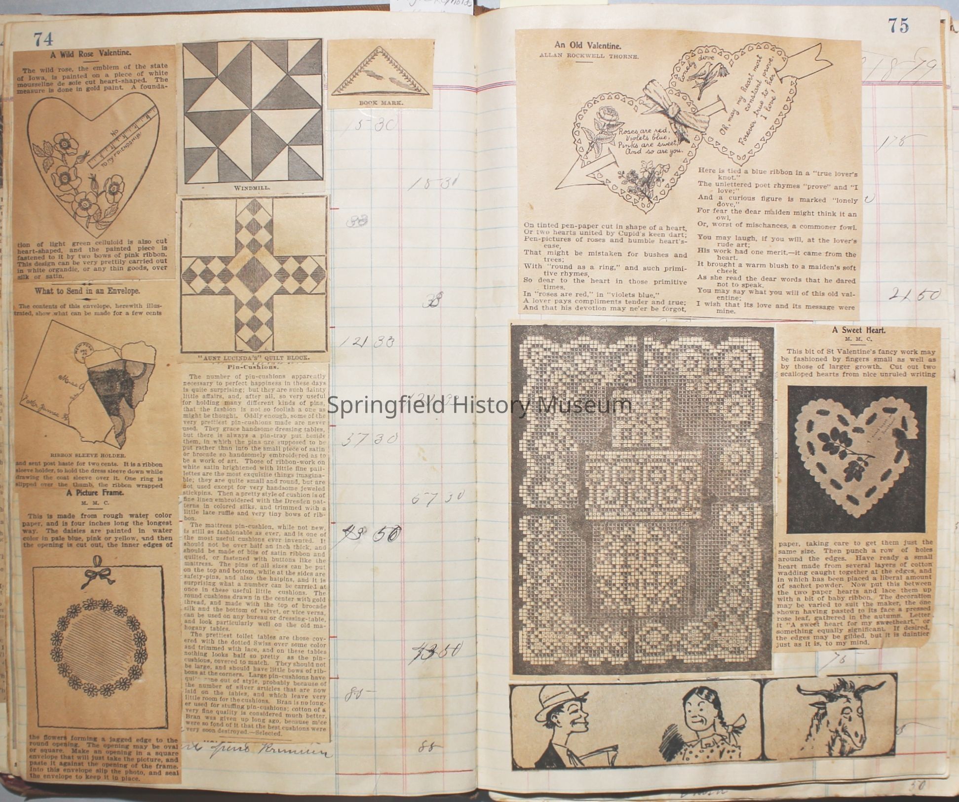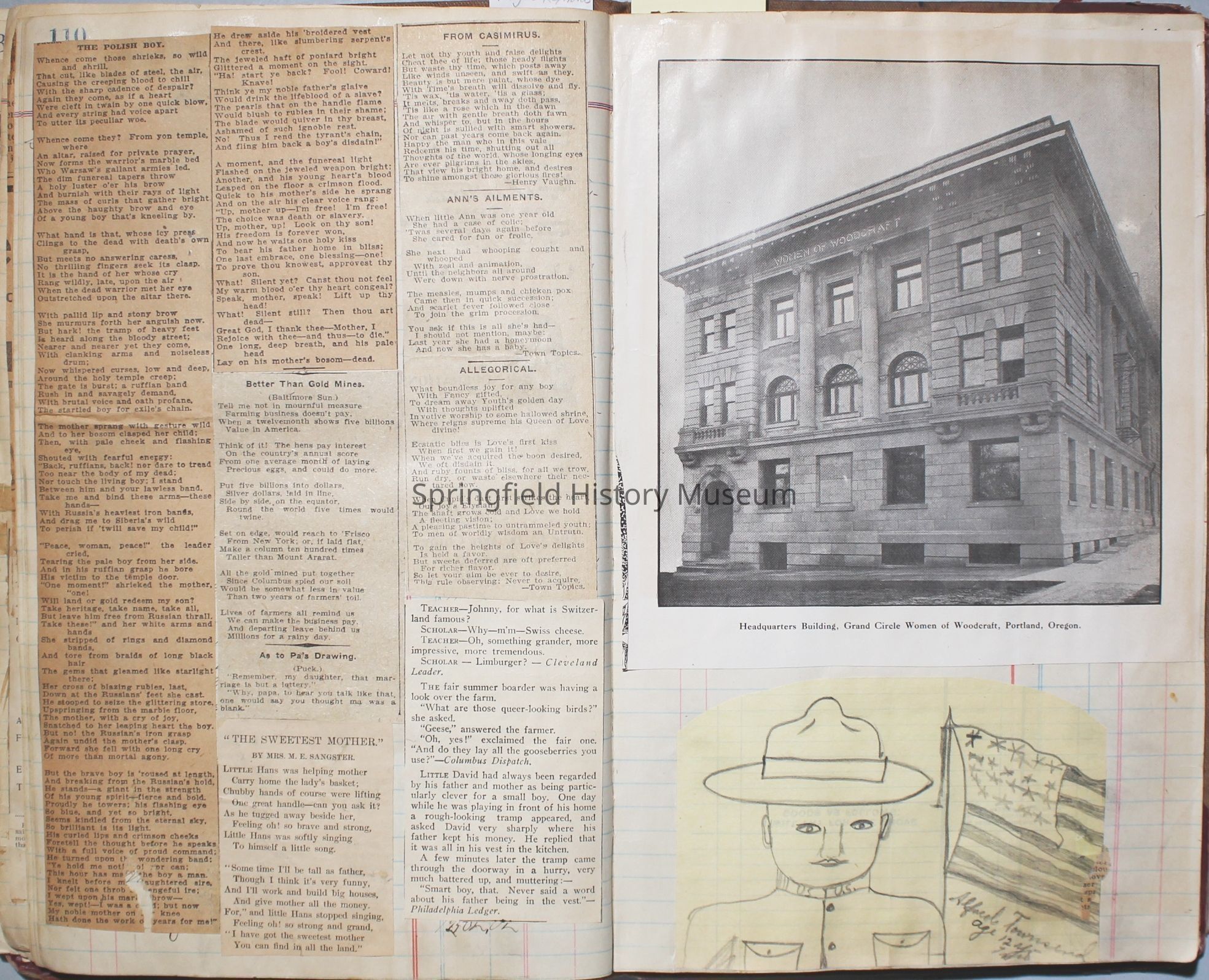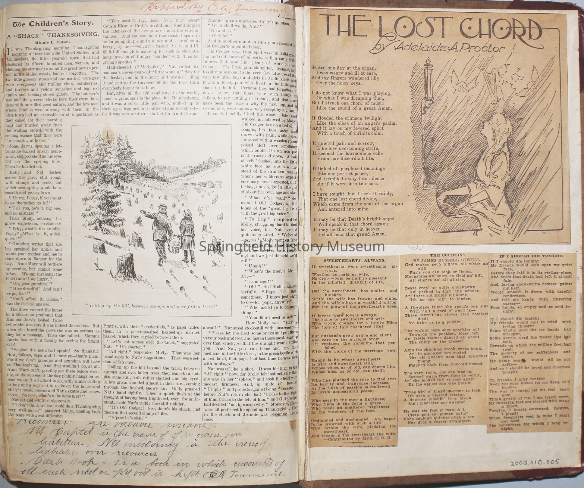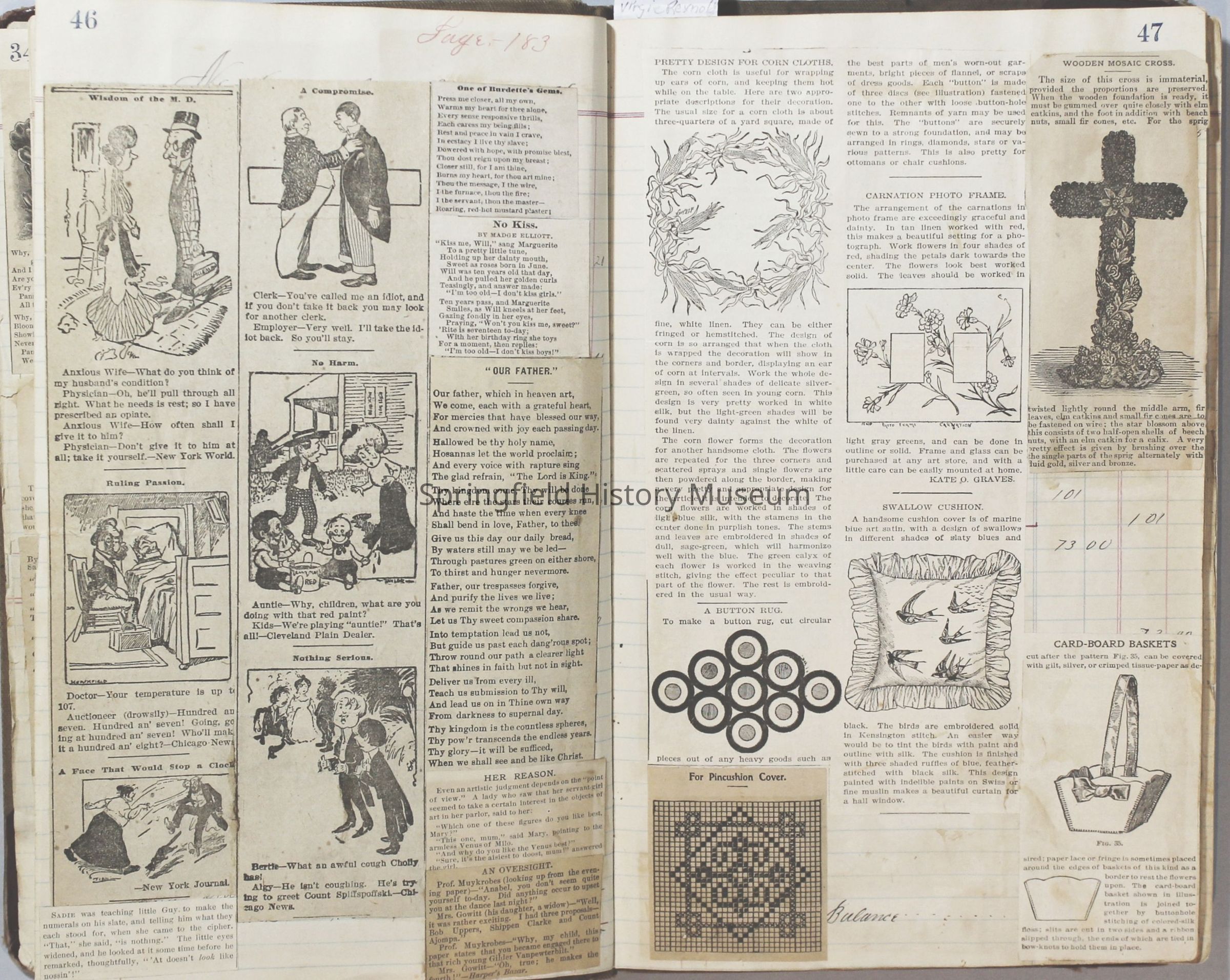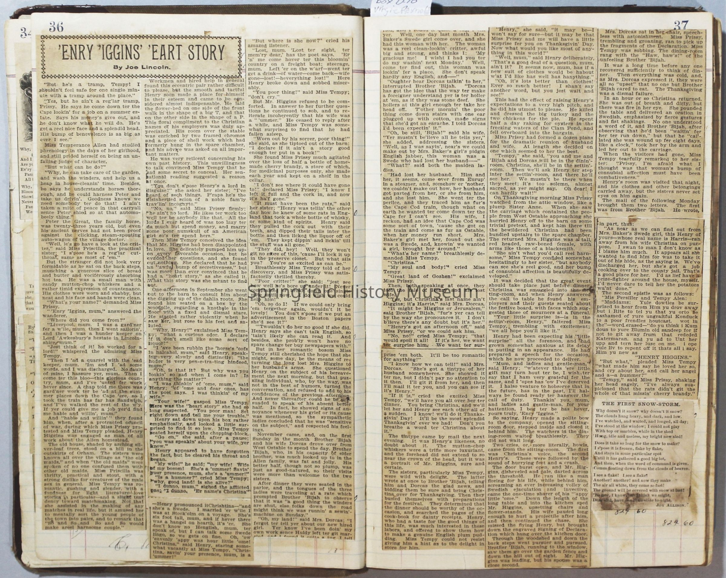 Scrapbook created by Virginia Almira Shaub Reynolds (1881-1964). The C. Townsend written on the back refers to Charles Augustus Townsend (1879-1955), Virgie's first husband. Drawings in scrapbook were created by her son Alfred Cadwell Townsend (1906-1990).