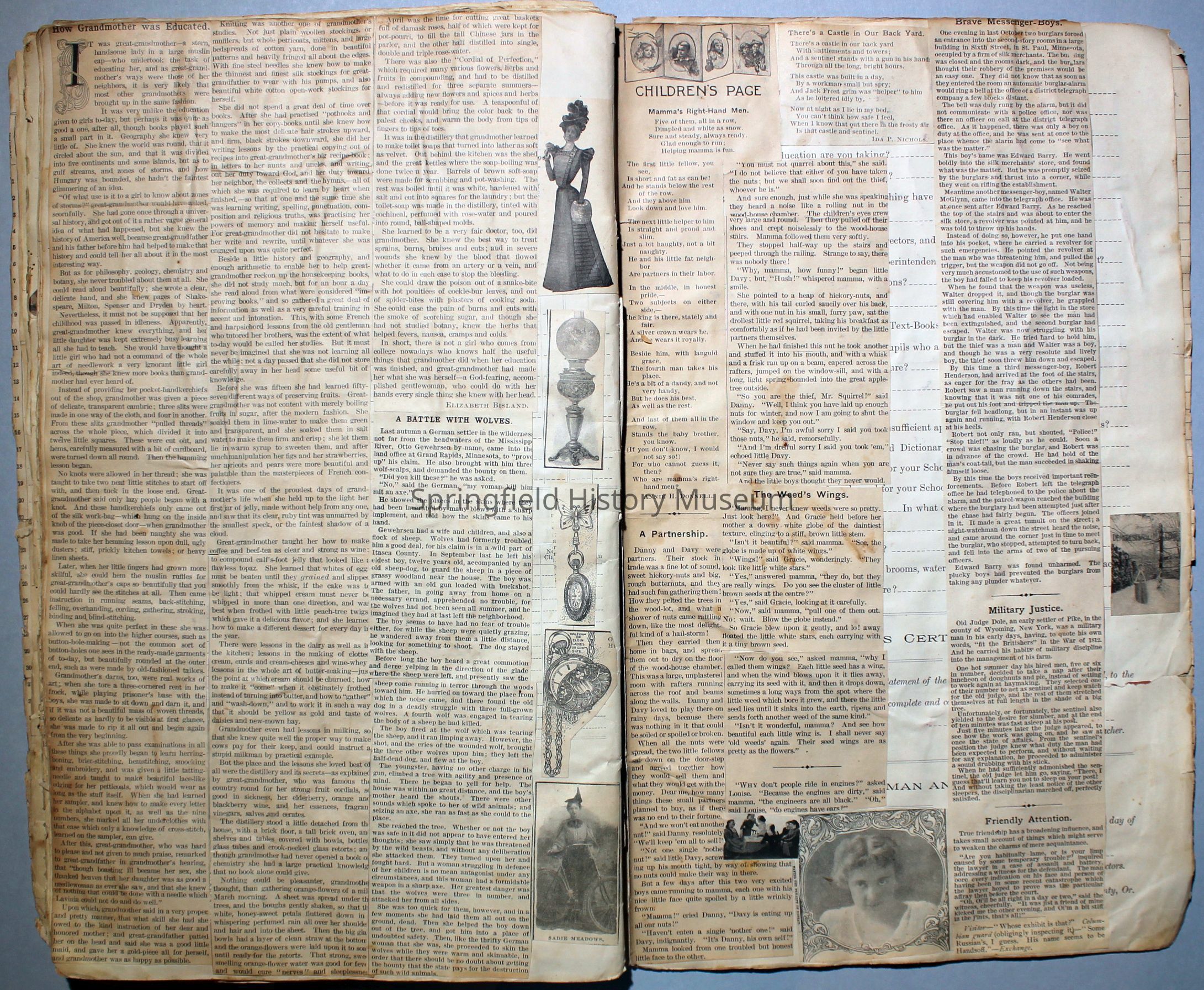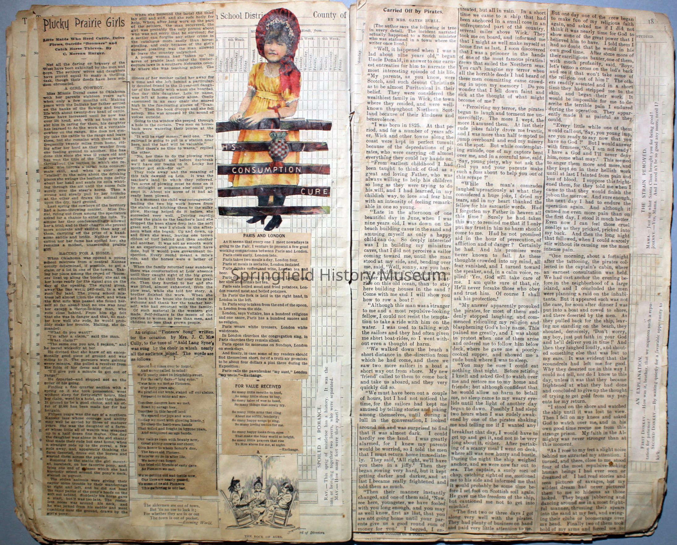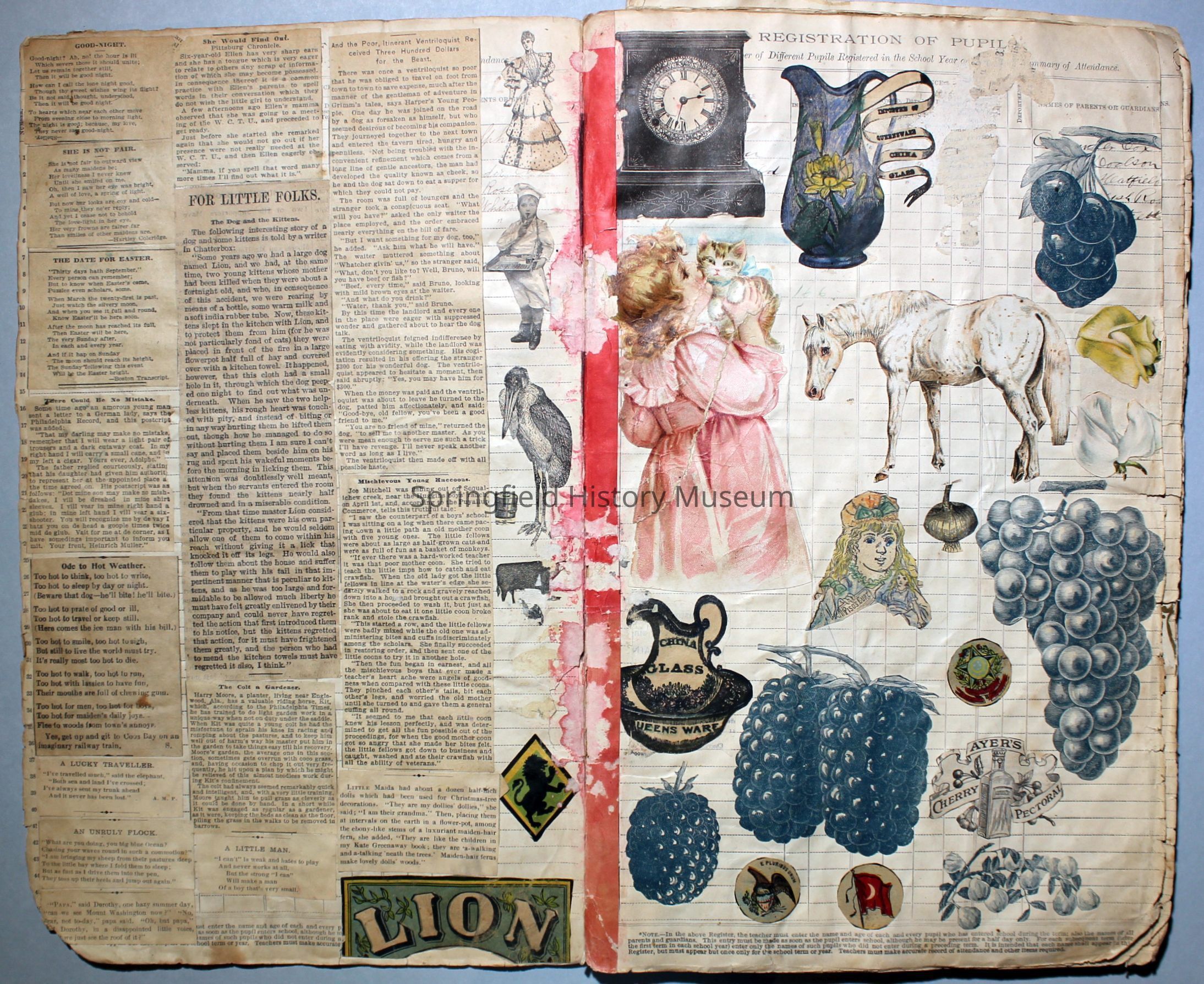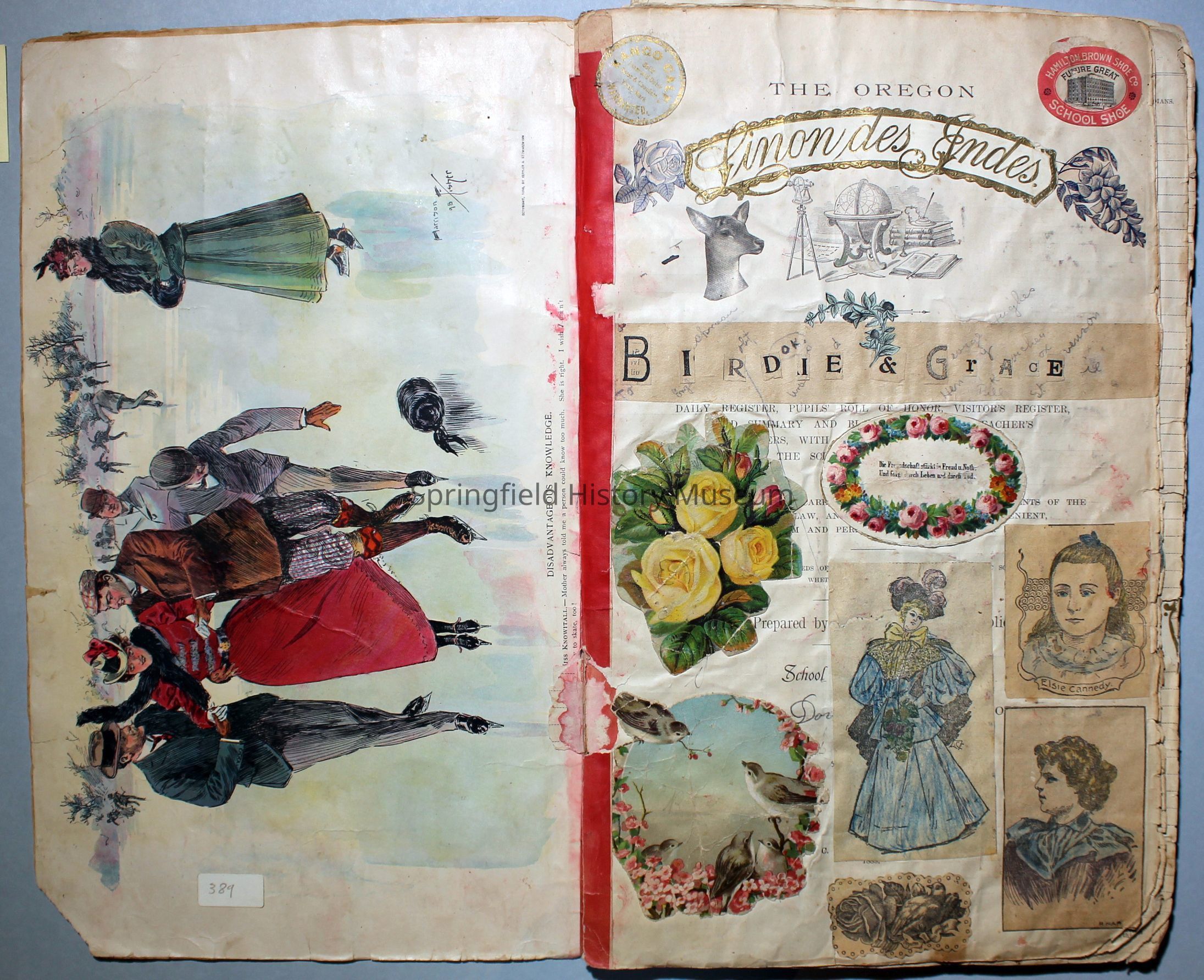White/tan scrapbook with cover displaying a horse-drawn carriage, inside cover shows illustration of people ice skating. Understood to be the earliest of Virginia's scrapbooks in the possession of SHM. Created circa 1899, when Virginia was a Senior in high school.