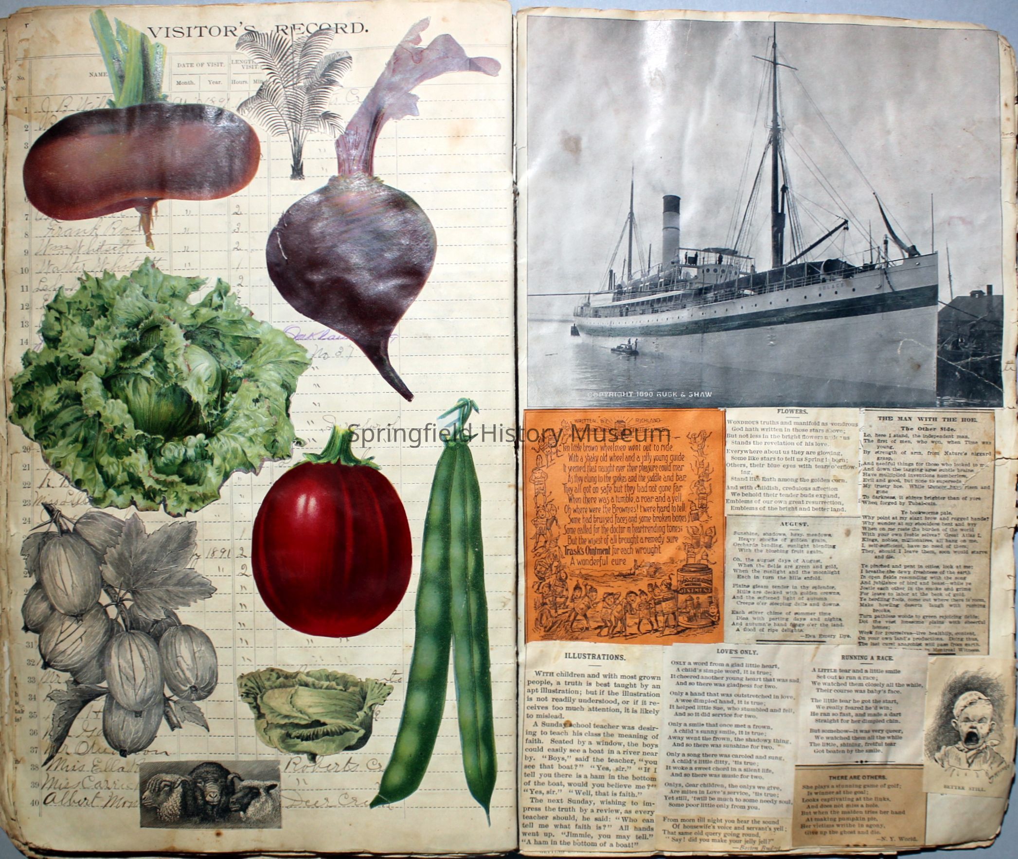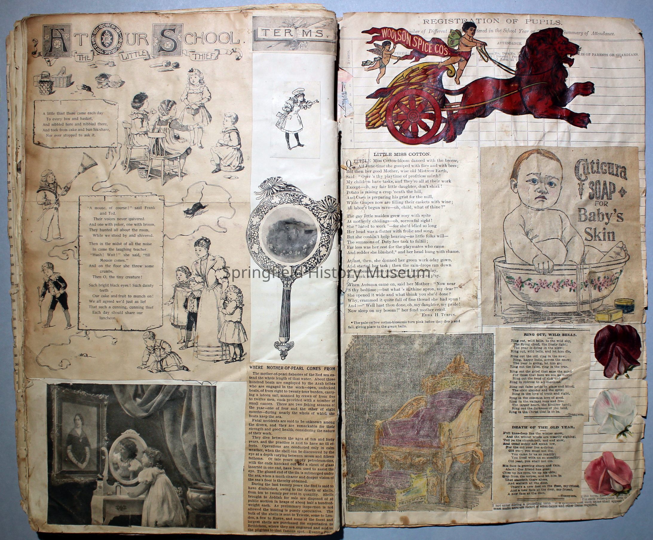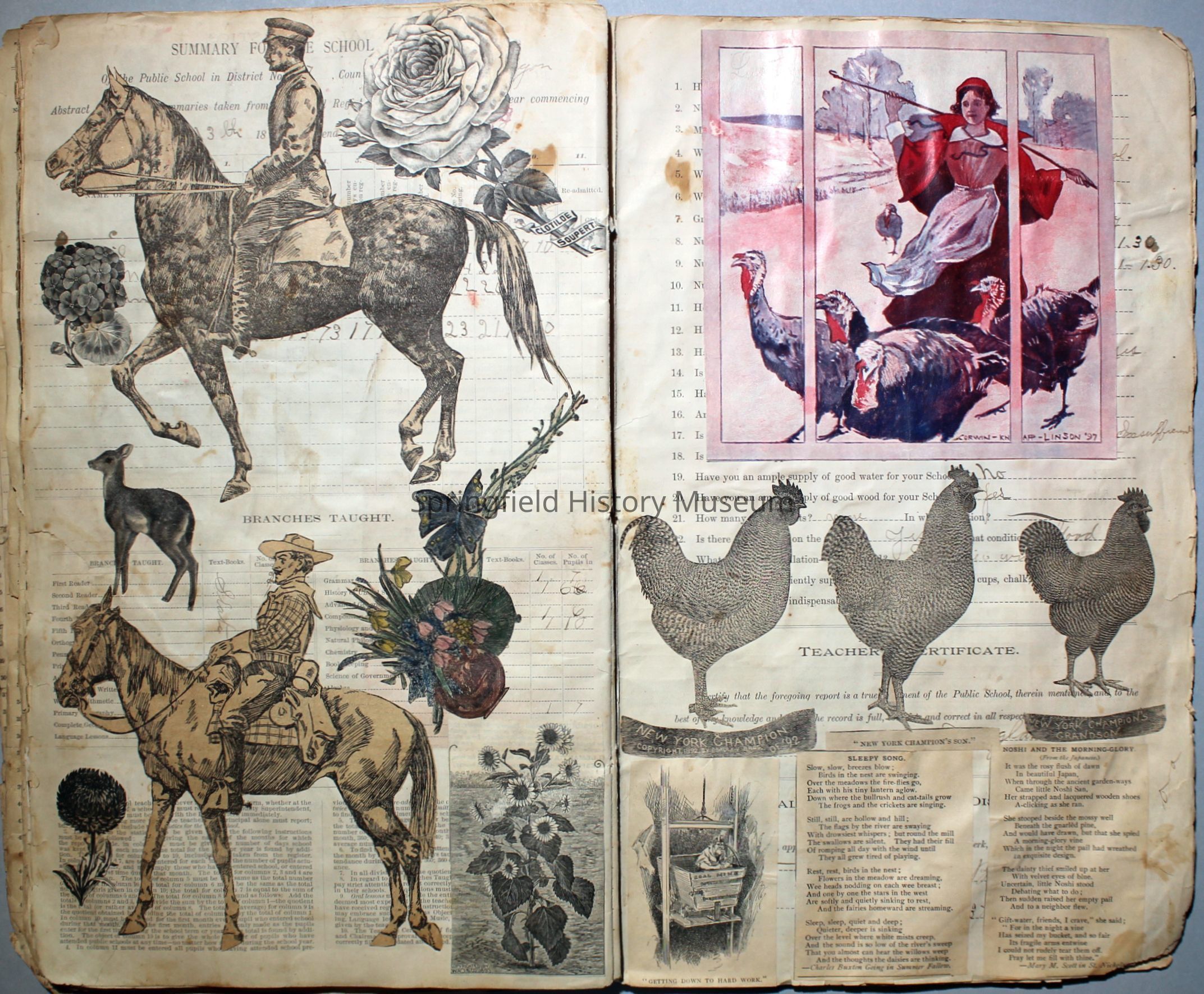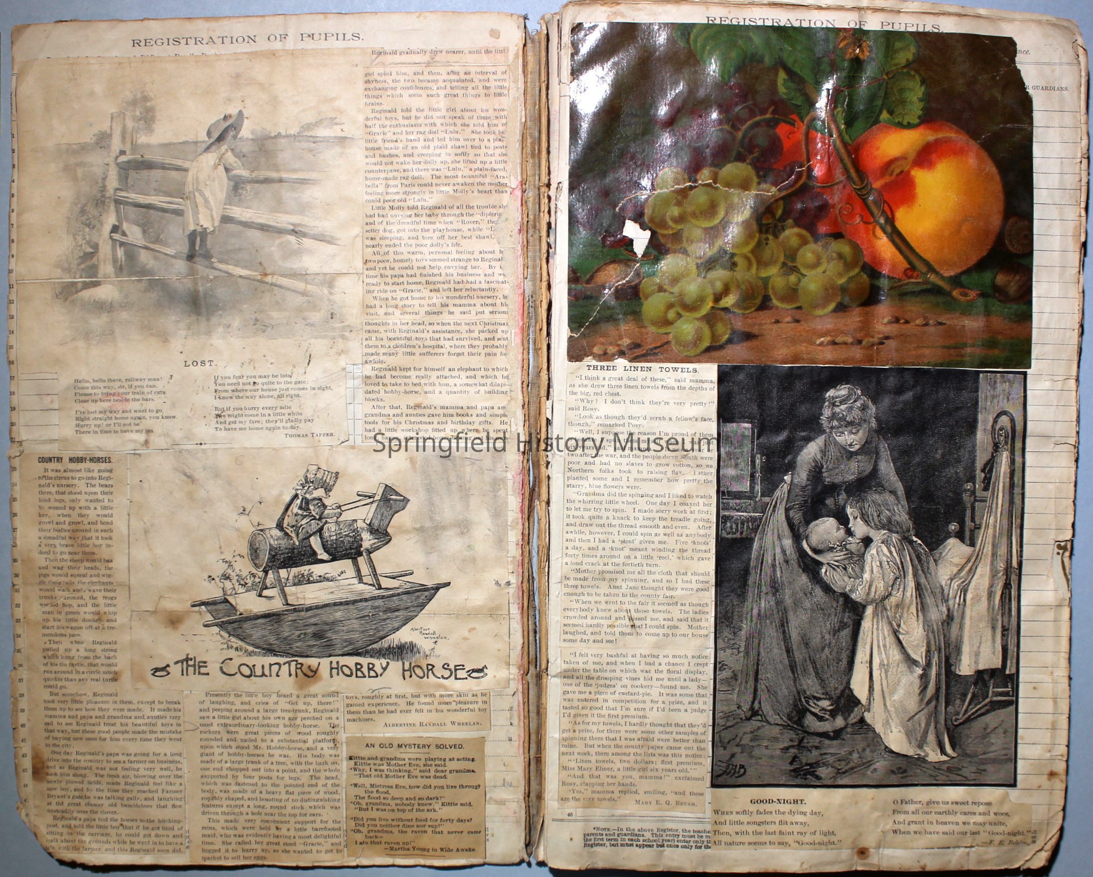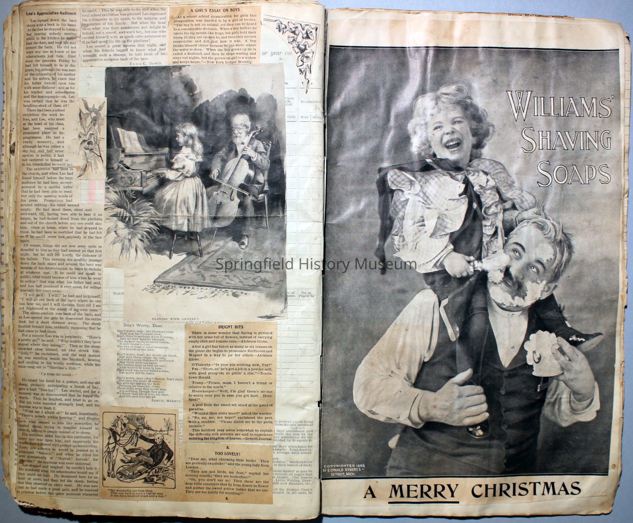 White/tan scrapbook with cover displaying a horse-drawn carriage, inside cover shows illustration of people ice skating. Understood to be the earliest of Virginia's scrapbooks in the possession of SHM. Created circa 1899, when Virginia was a Senior in high school.