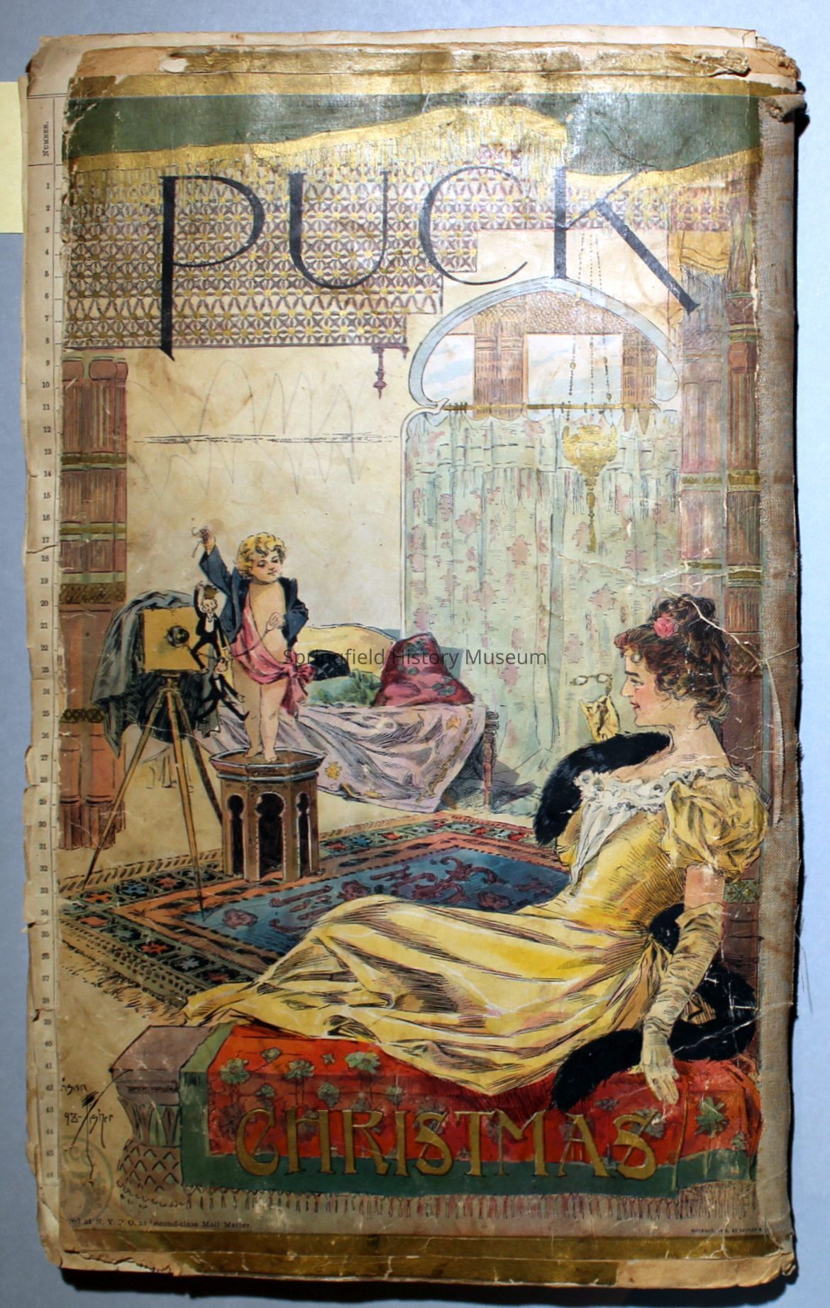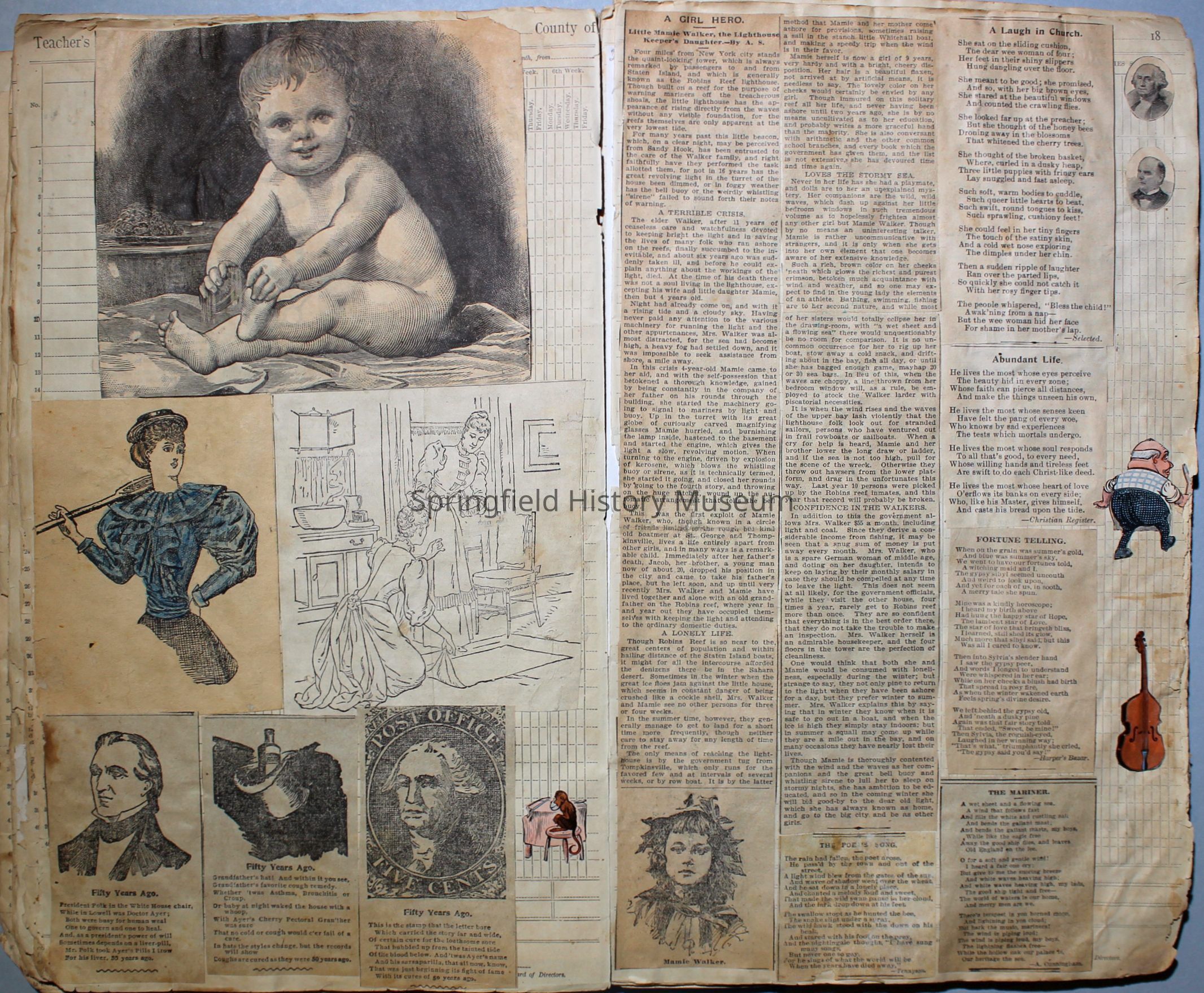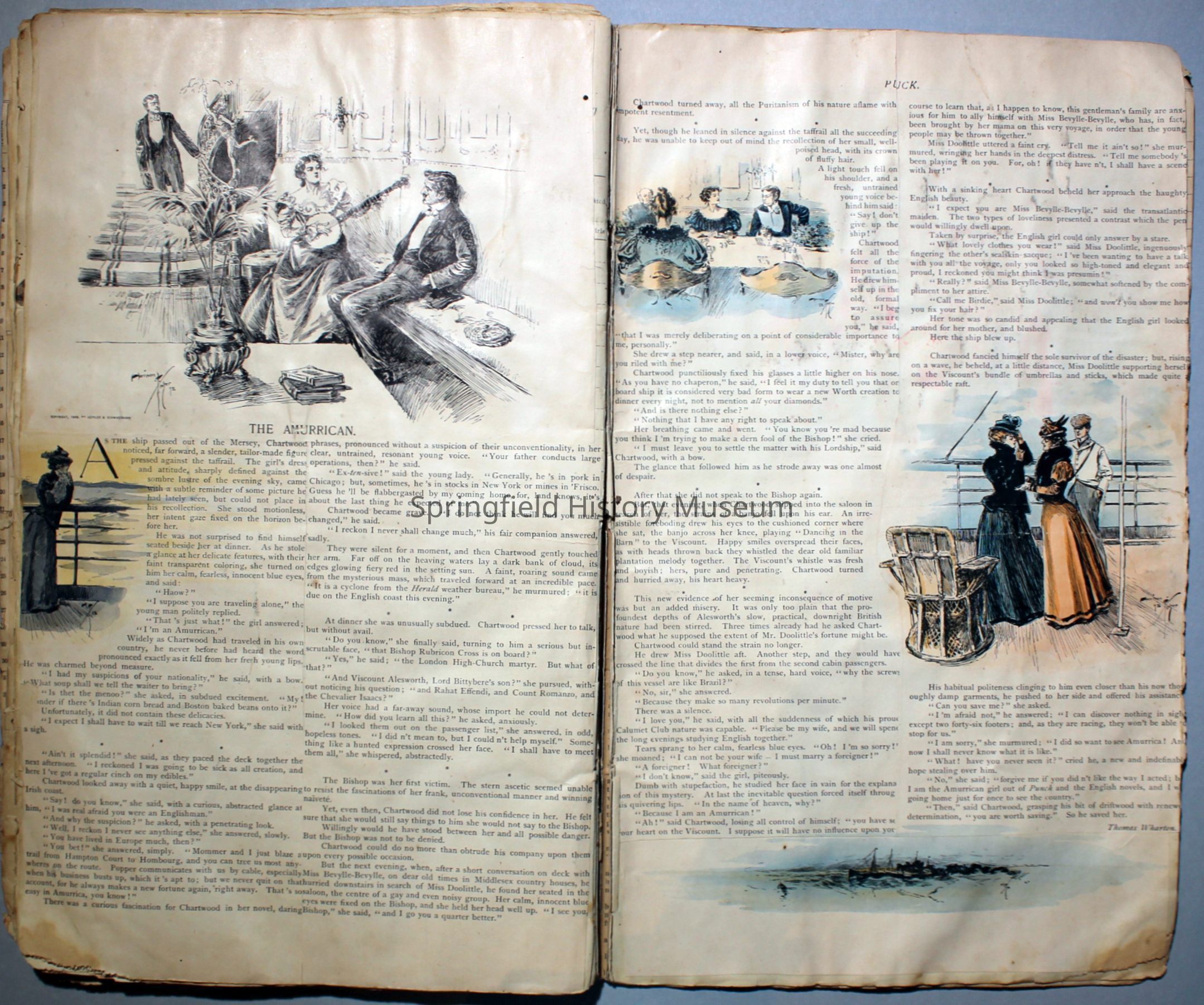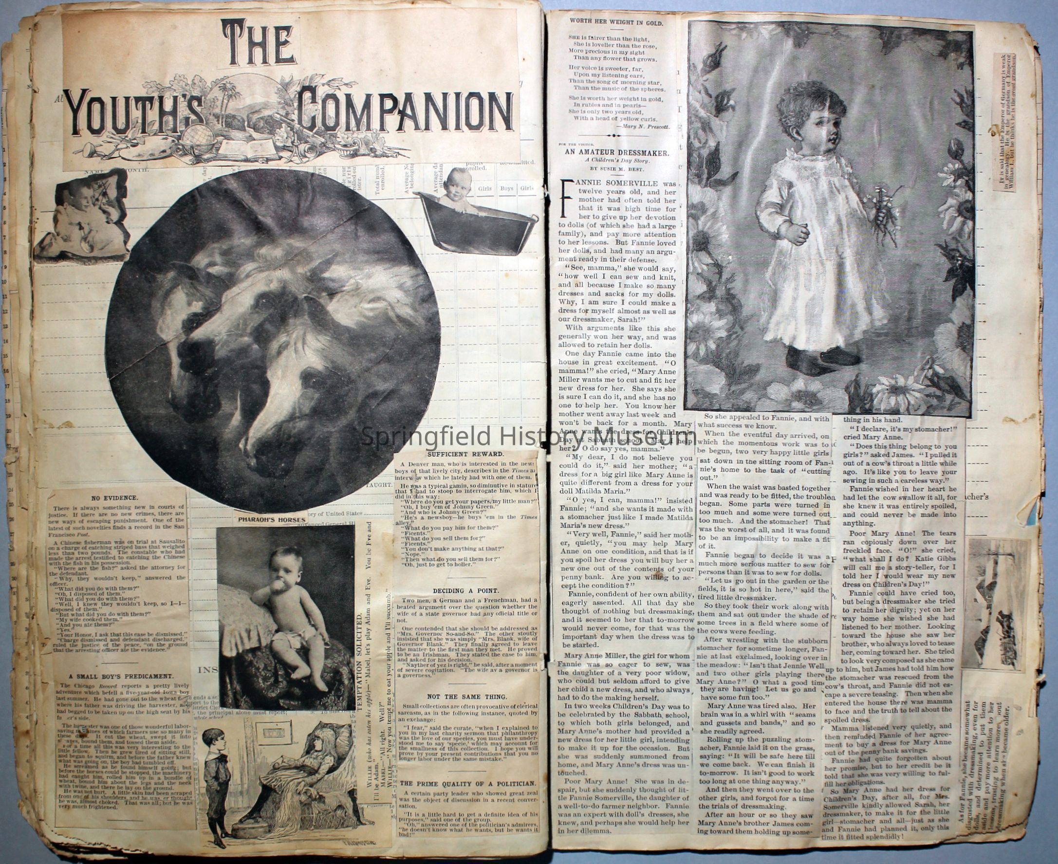 White/tan scrapbook with cover displaying a horse-drawn carriage, inside cover shows illustration of people ice skating. Understood to be the earliest of Virginia's scrapbooks in the possession of SHM. Created circa 1899, when Virginia was a Senior in high school.