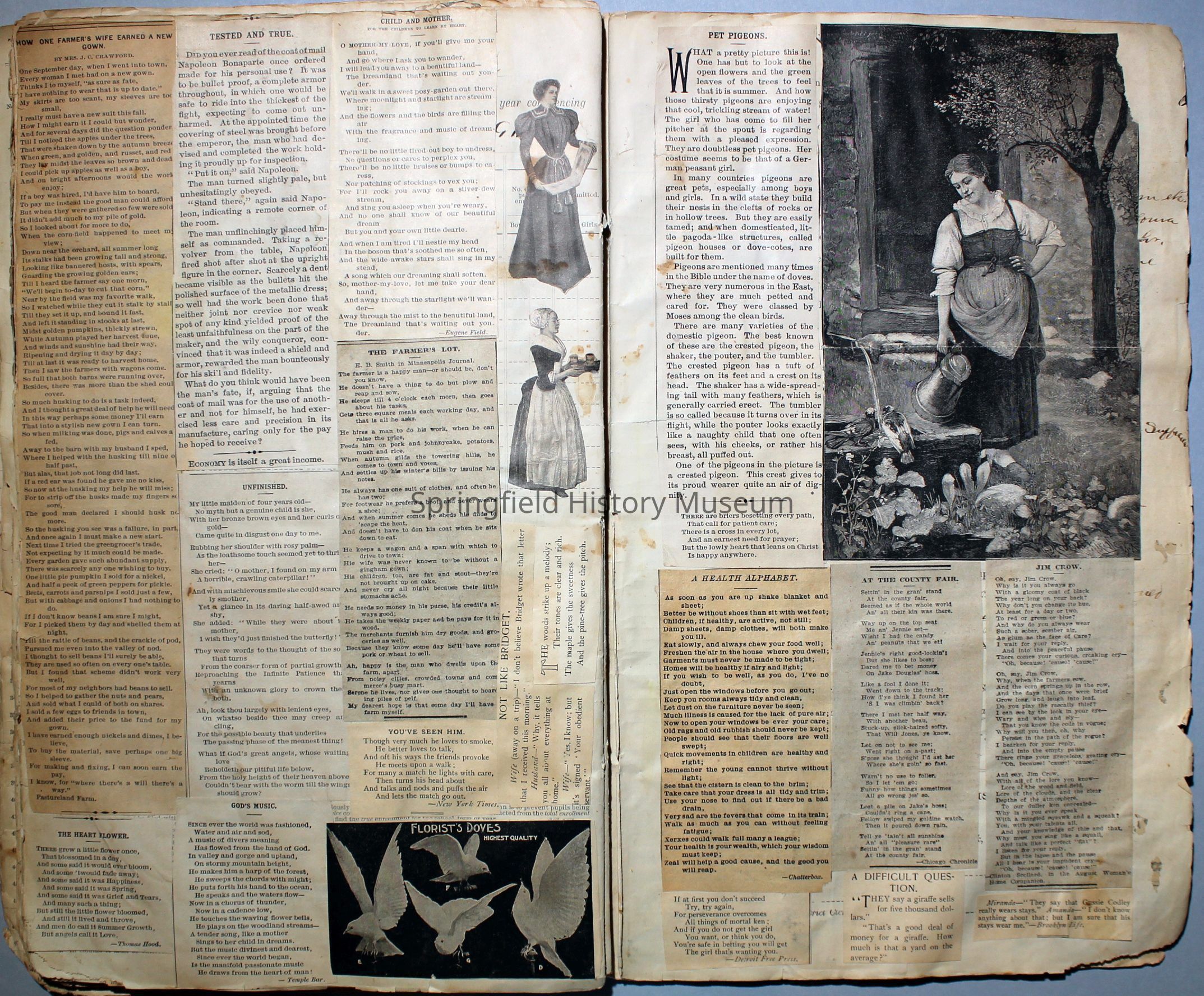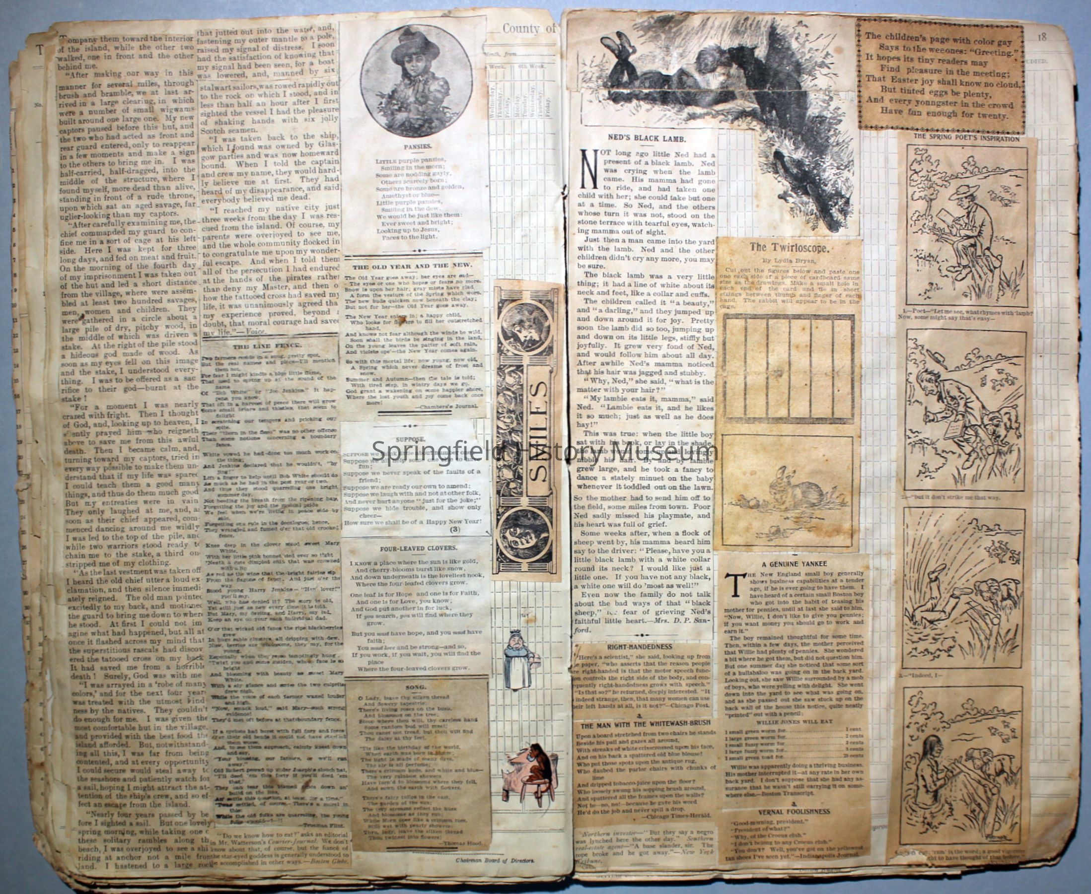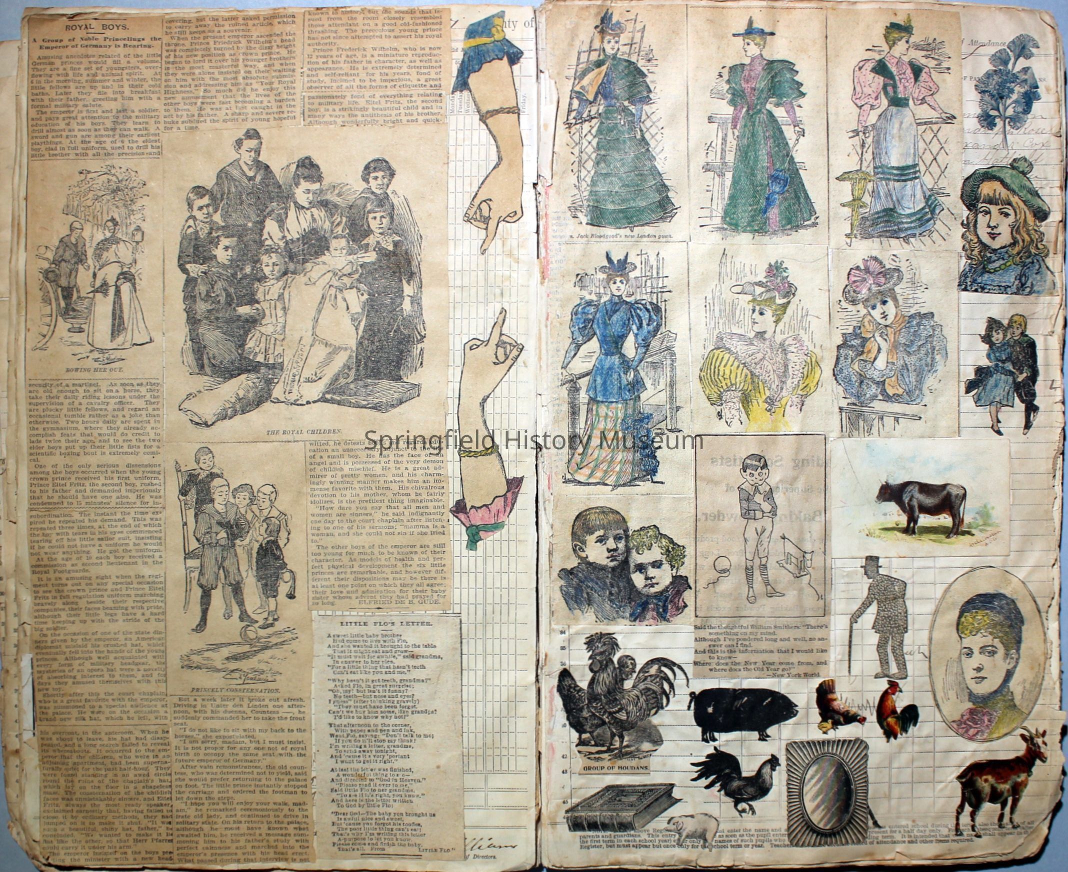 Contains aesthetic clippings from newspapers, catalogs, magazines, etc. The author cut out illustrations of people, food, flowers, animals, news articles, and advertisements. The author's writing and coloring are found on many of the clippings.Collection