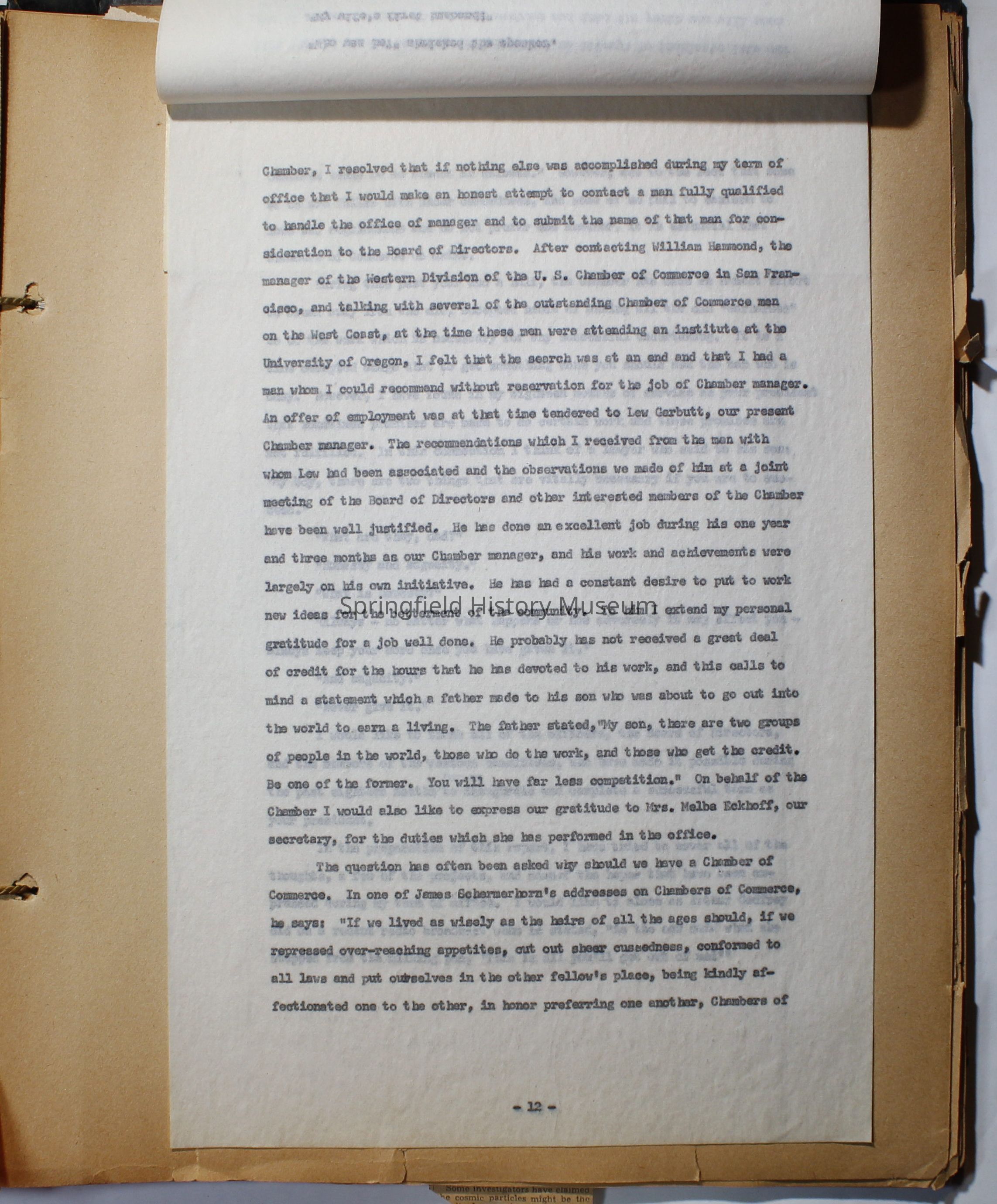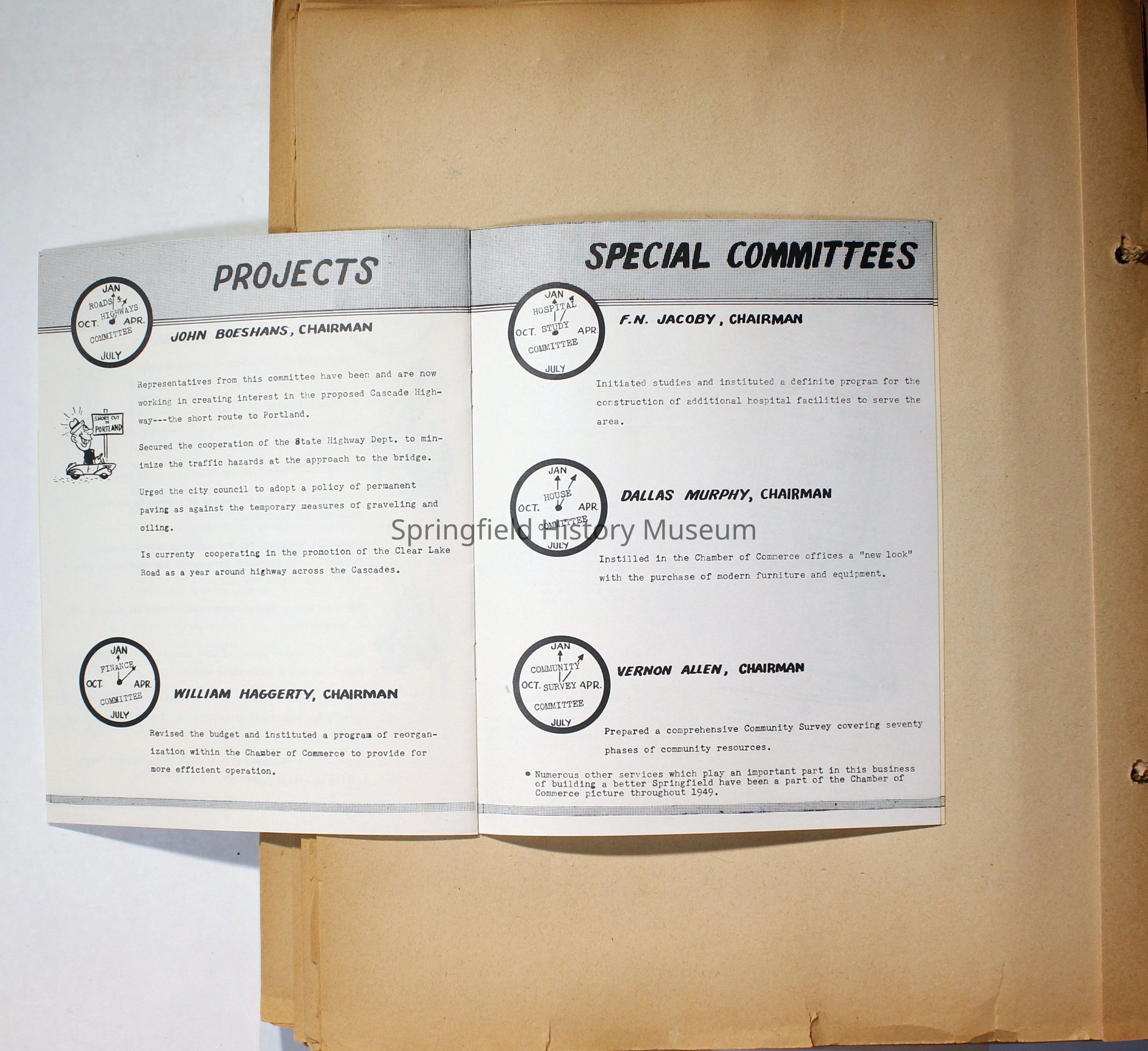 Scrapbook of clippings about the Springfield Chamber of Commerce, 1948 - 1949. Black covers with words in gold.Collection