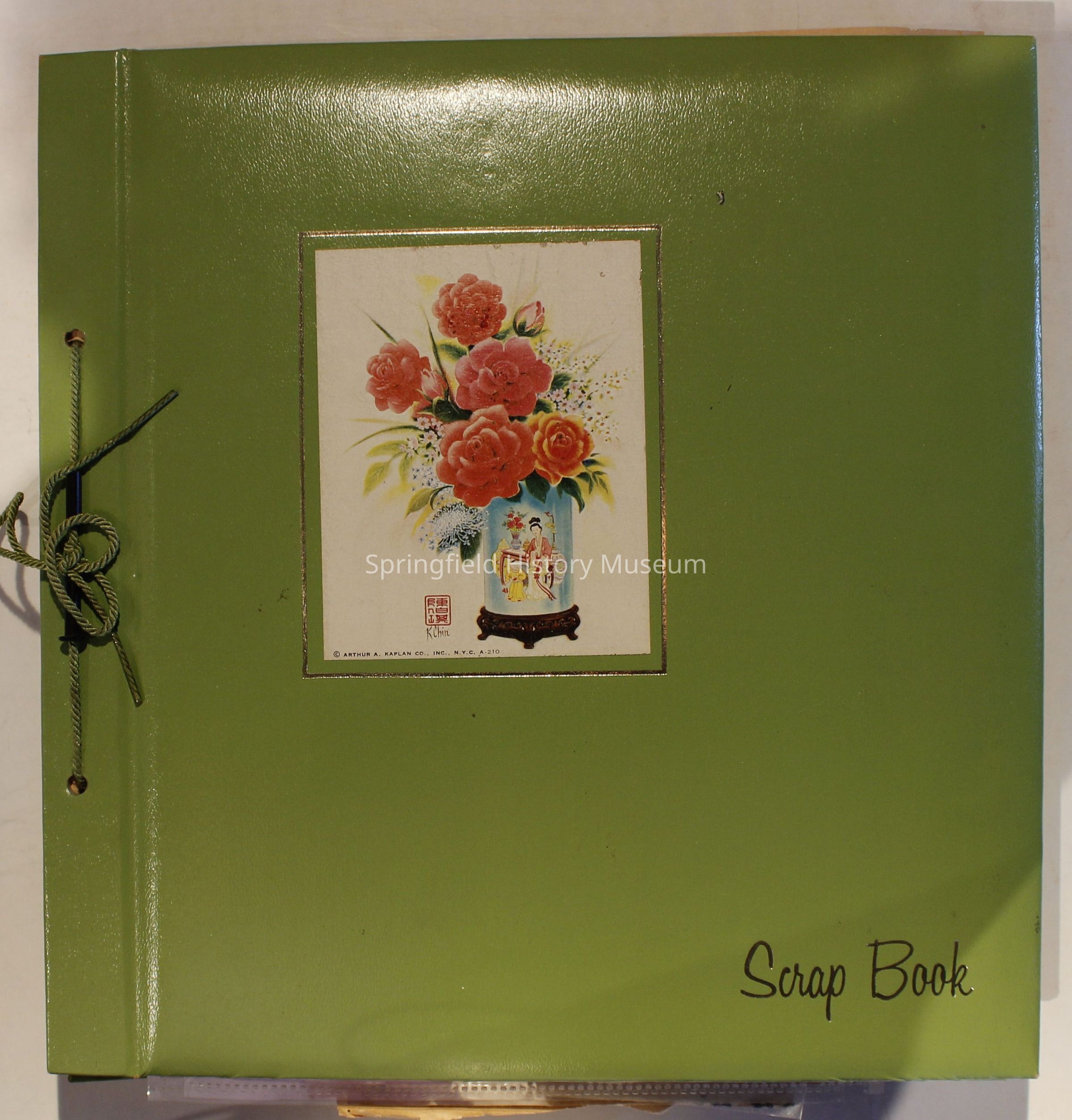 Scrapbook has a light green cover with a card with flowers in a vase glued on.Collection