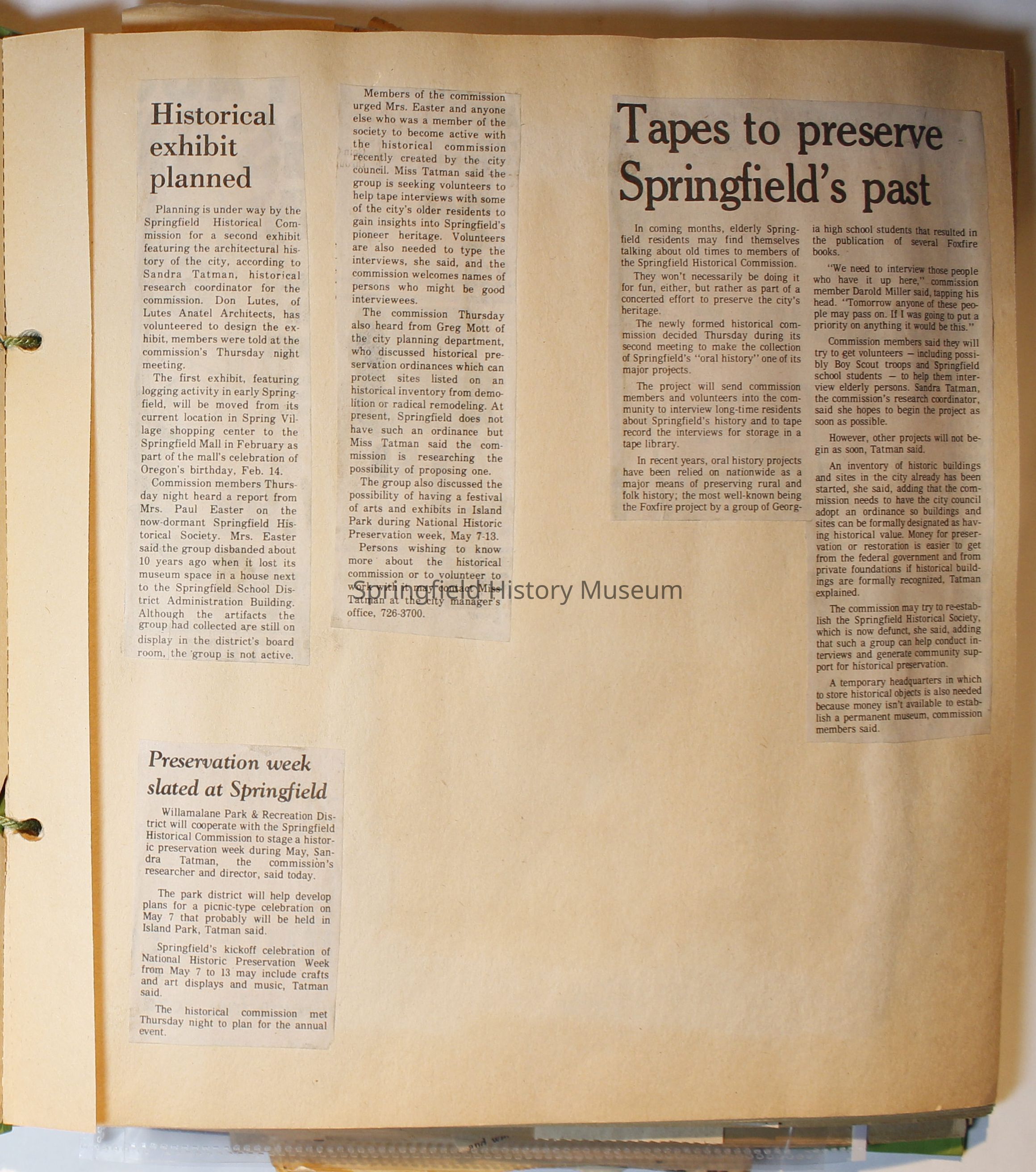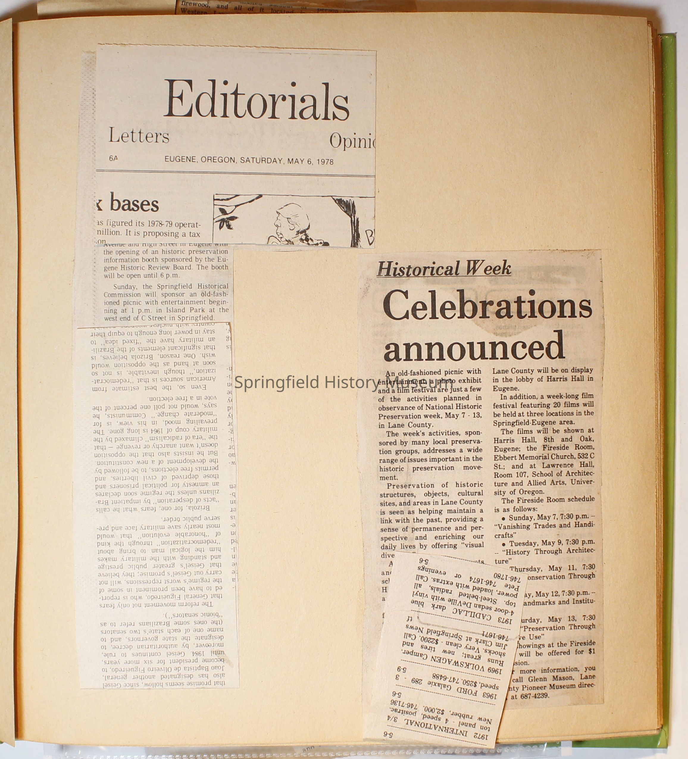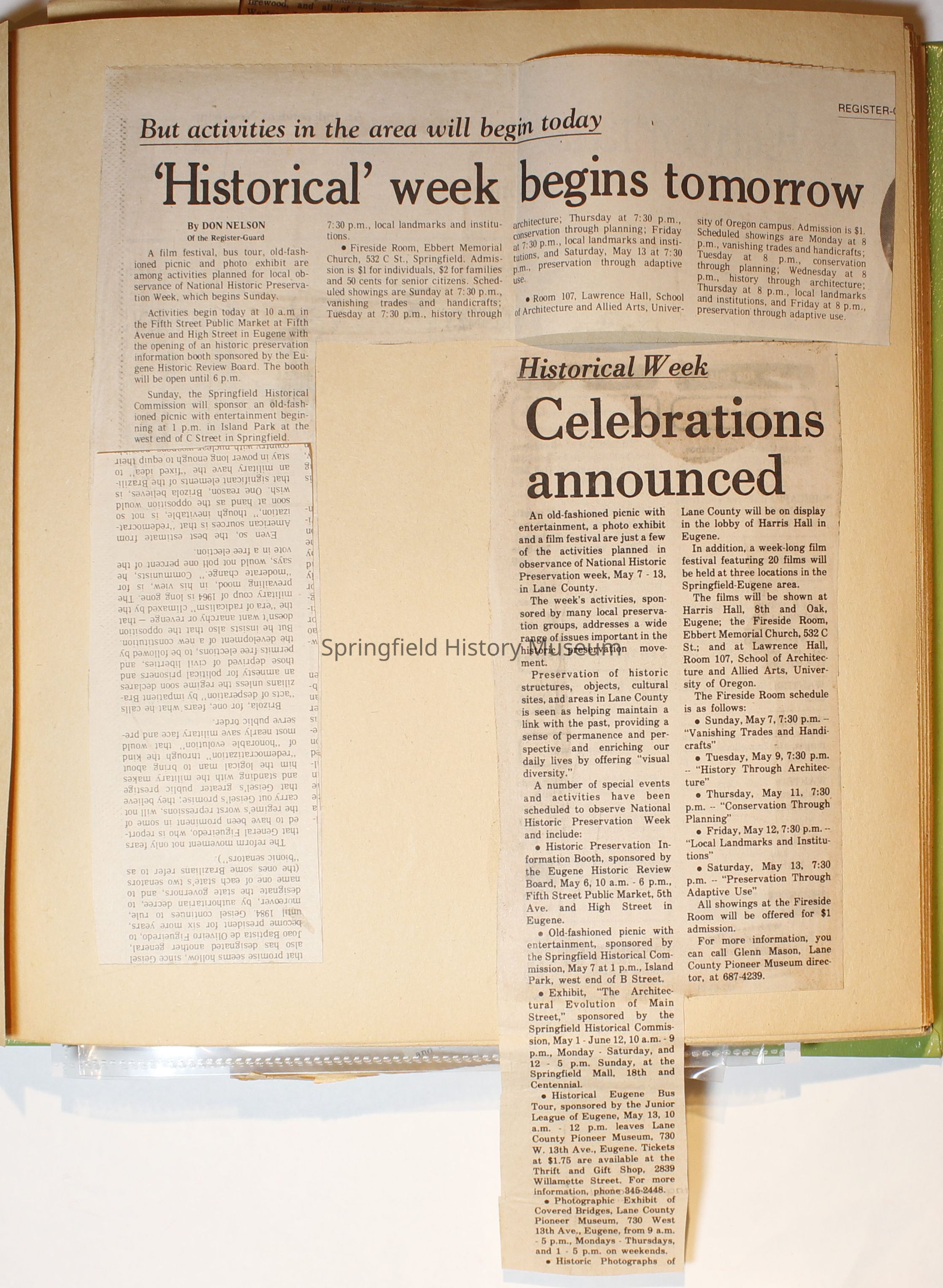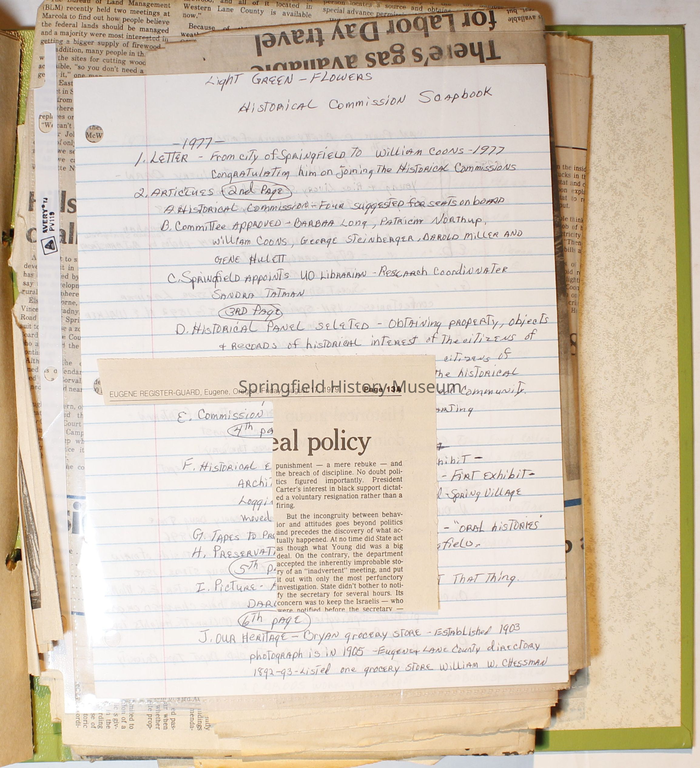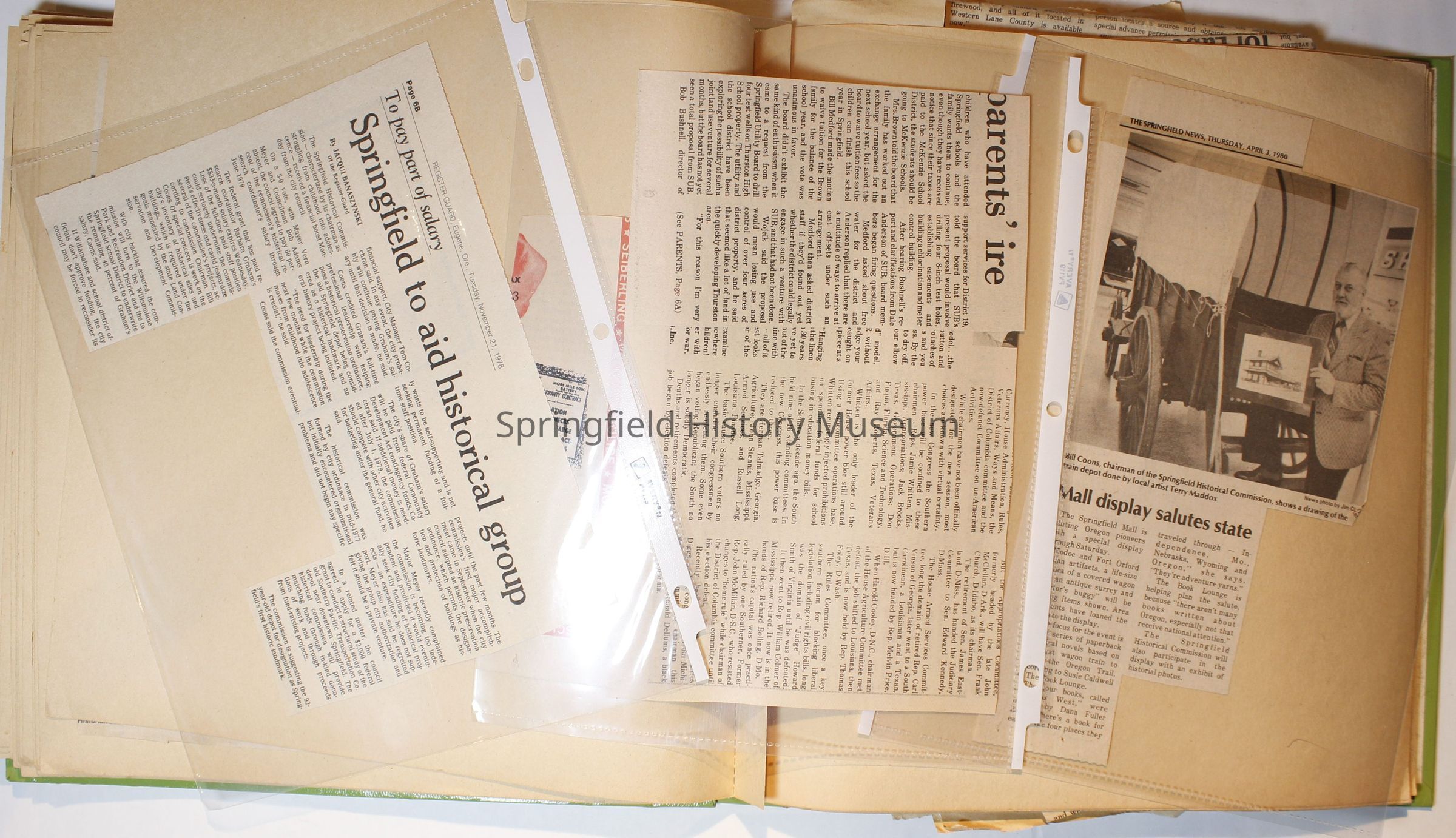 Scrapbook of the activities of the Springfield Historical Commission, circa 1977-79. Contains mostly newspaper clippings.