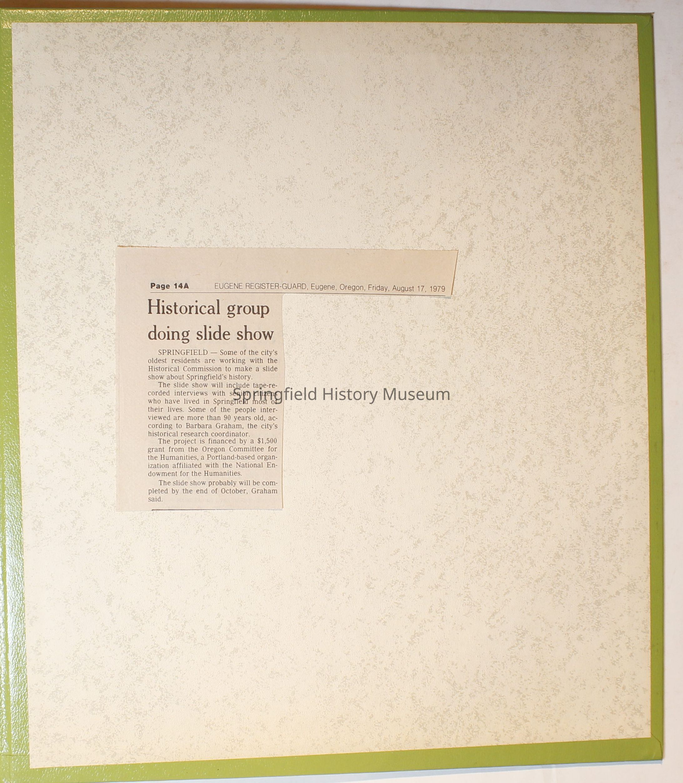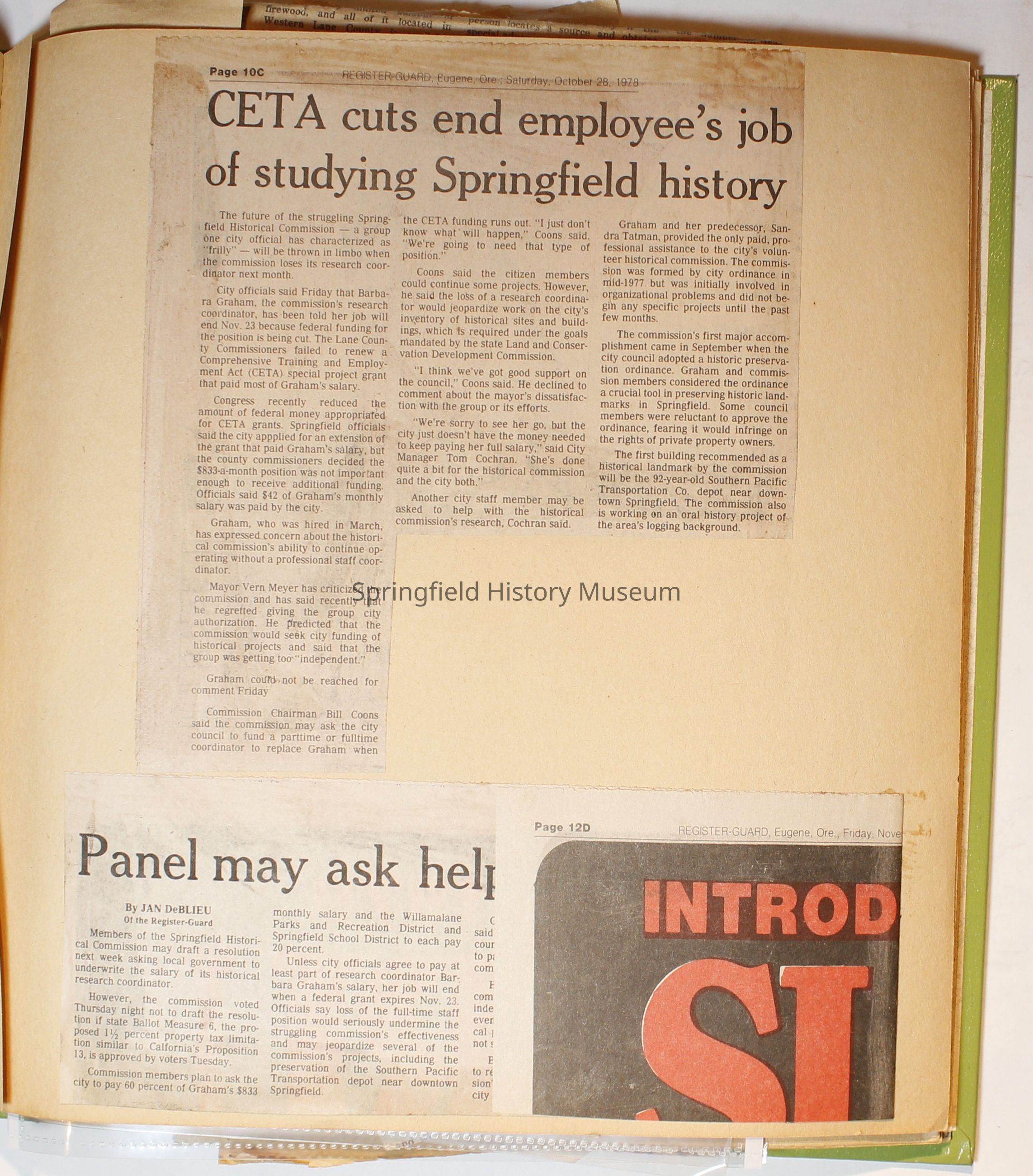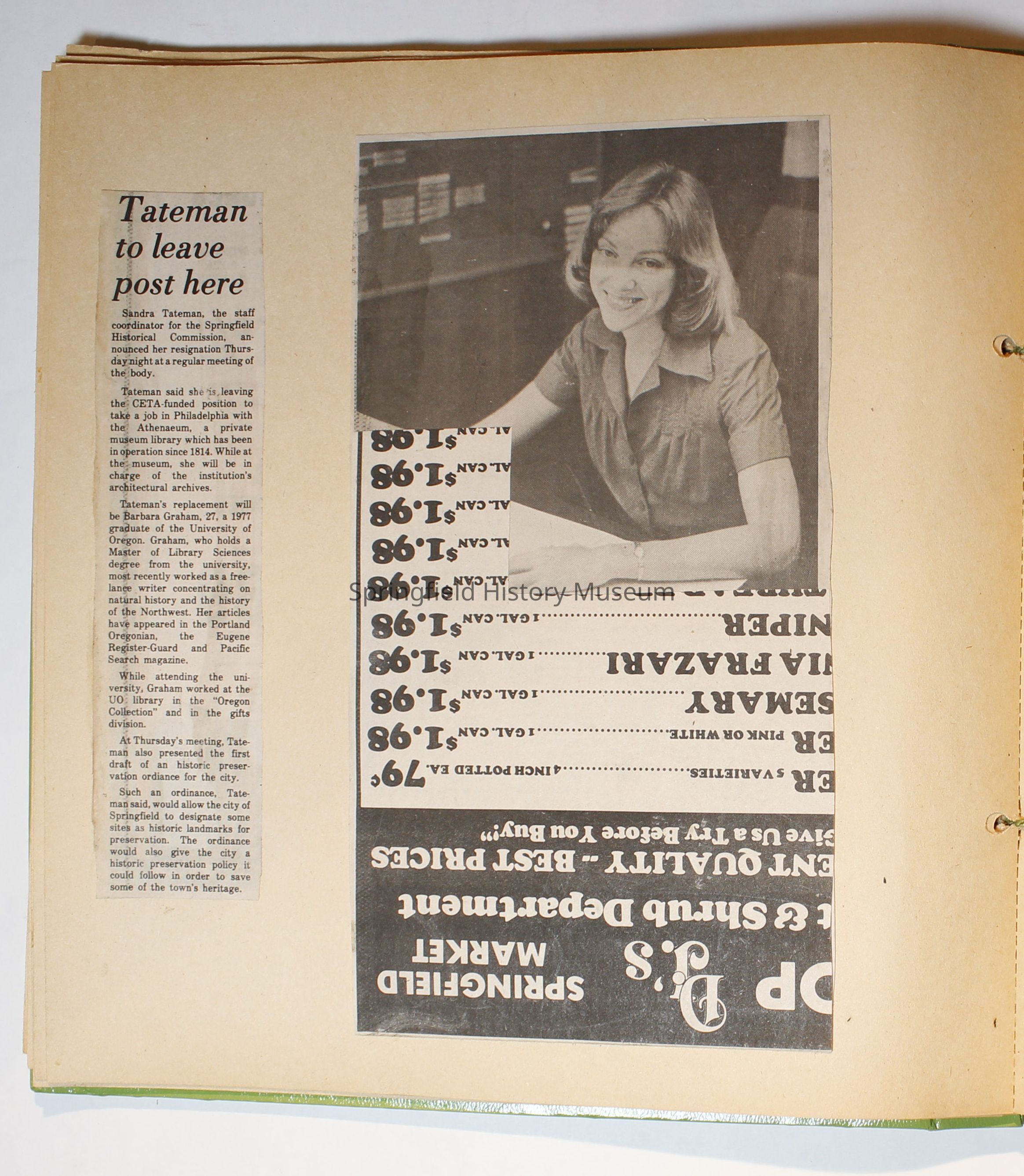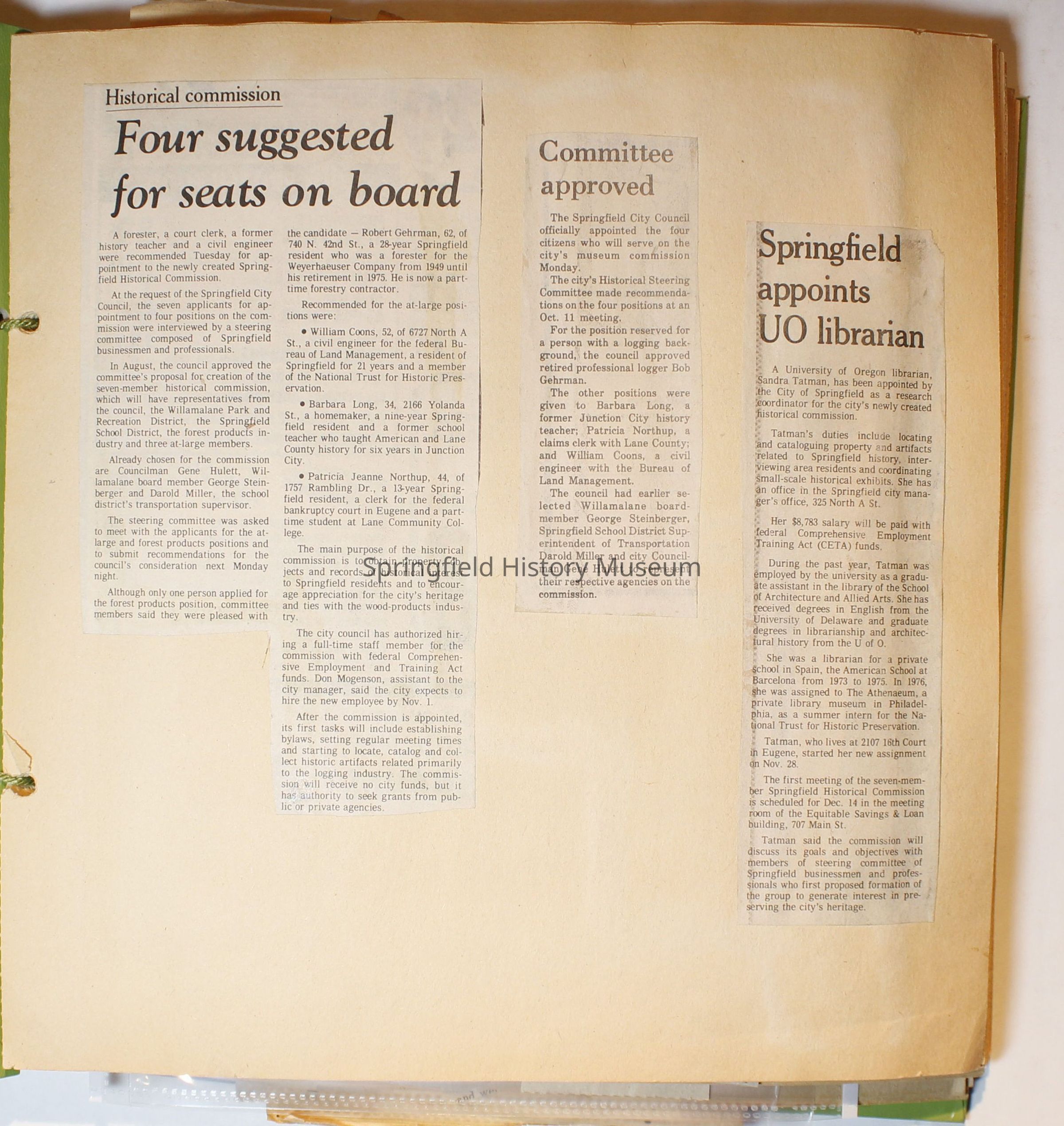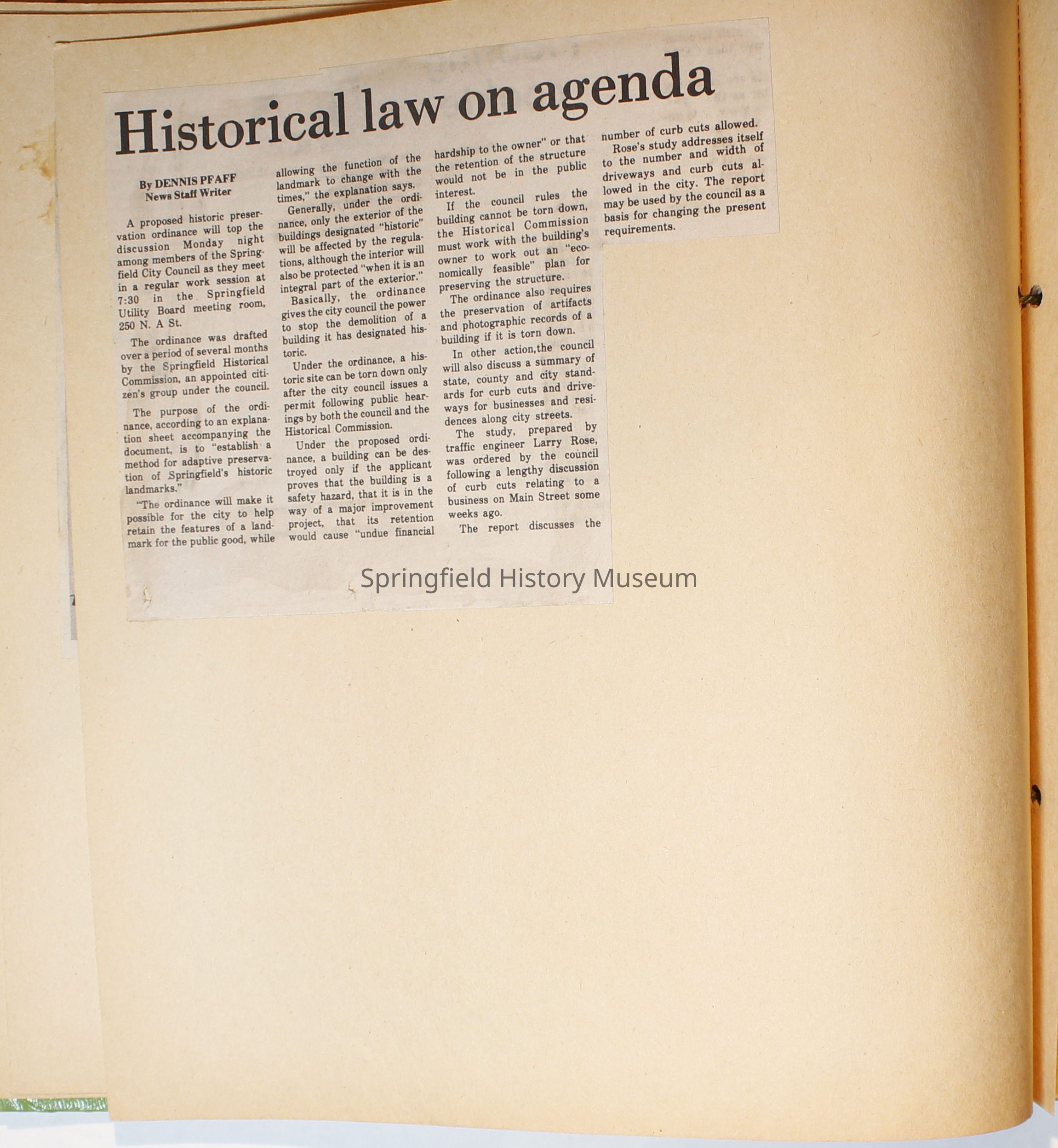 Scrapbook of the activities of the Springfield Historical Commission, circa 1977-79. Contains mostly newspaper clippings.