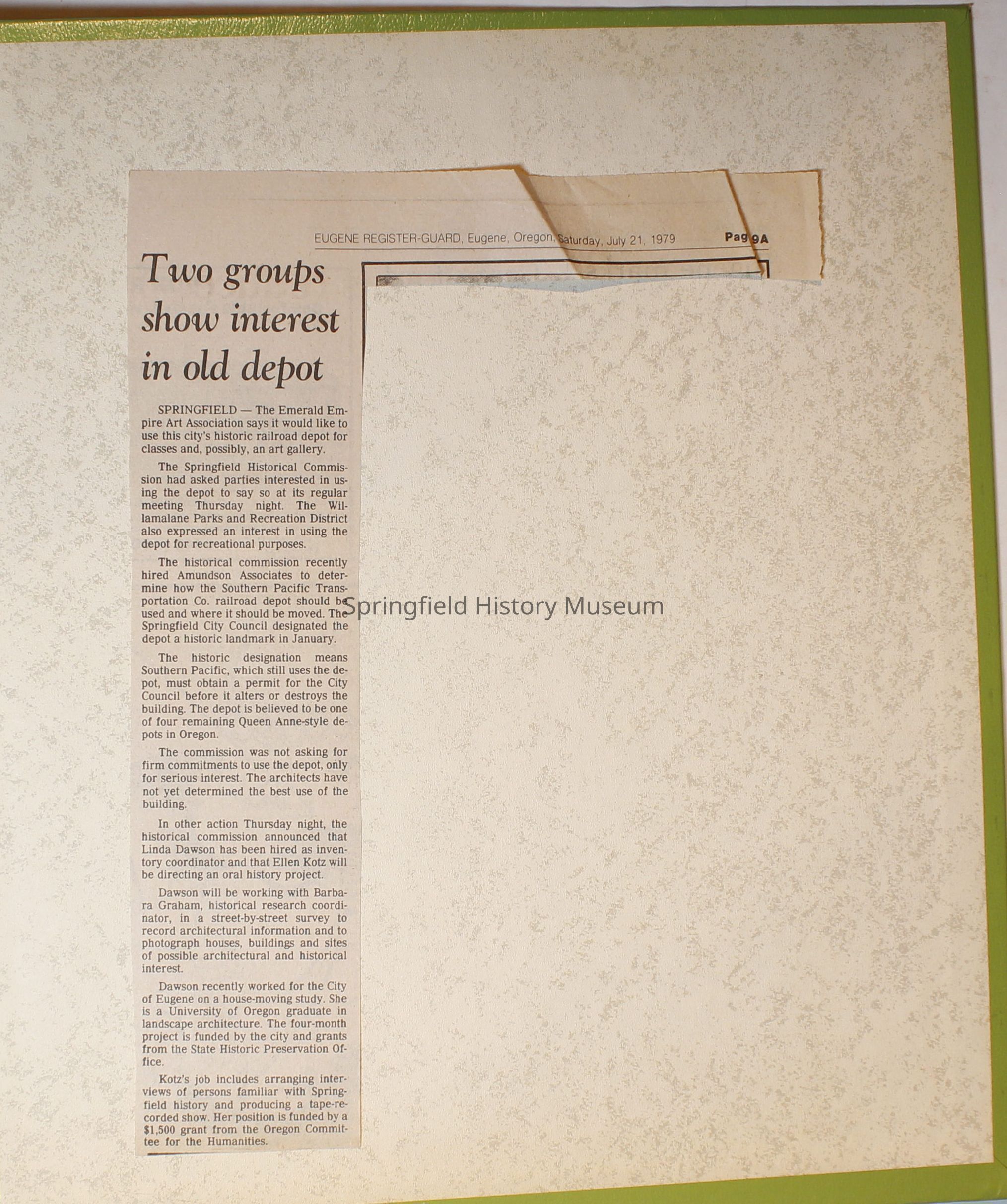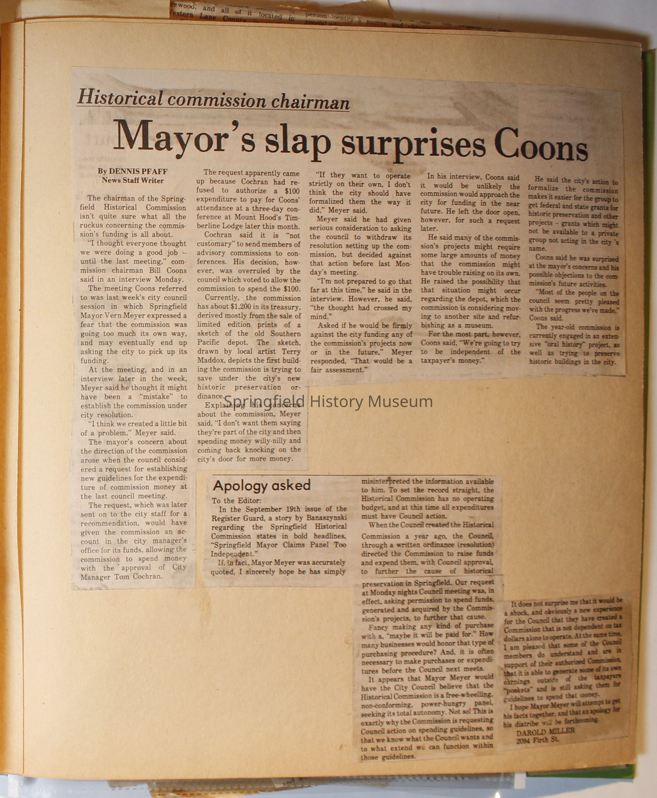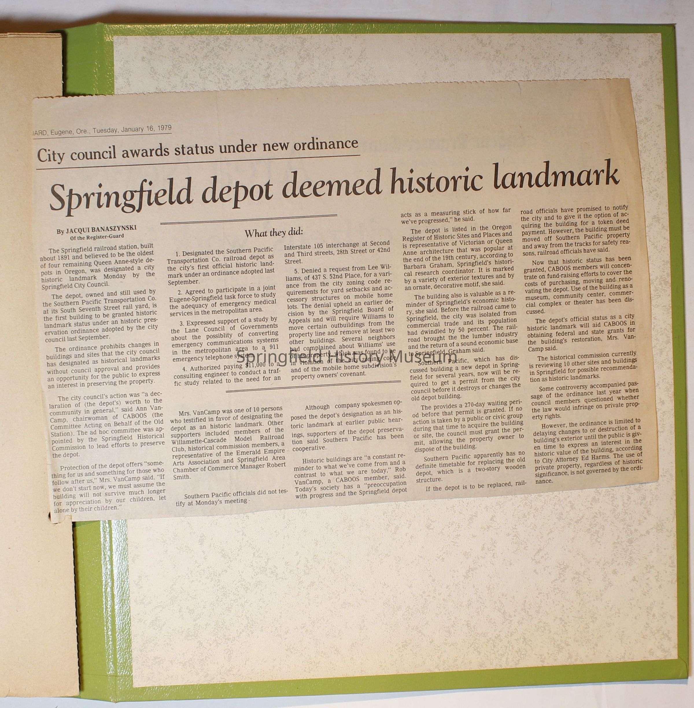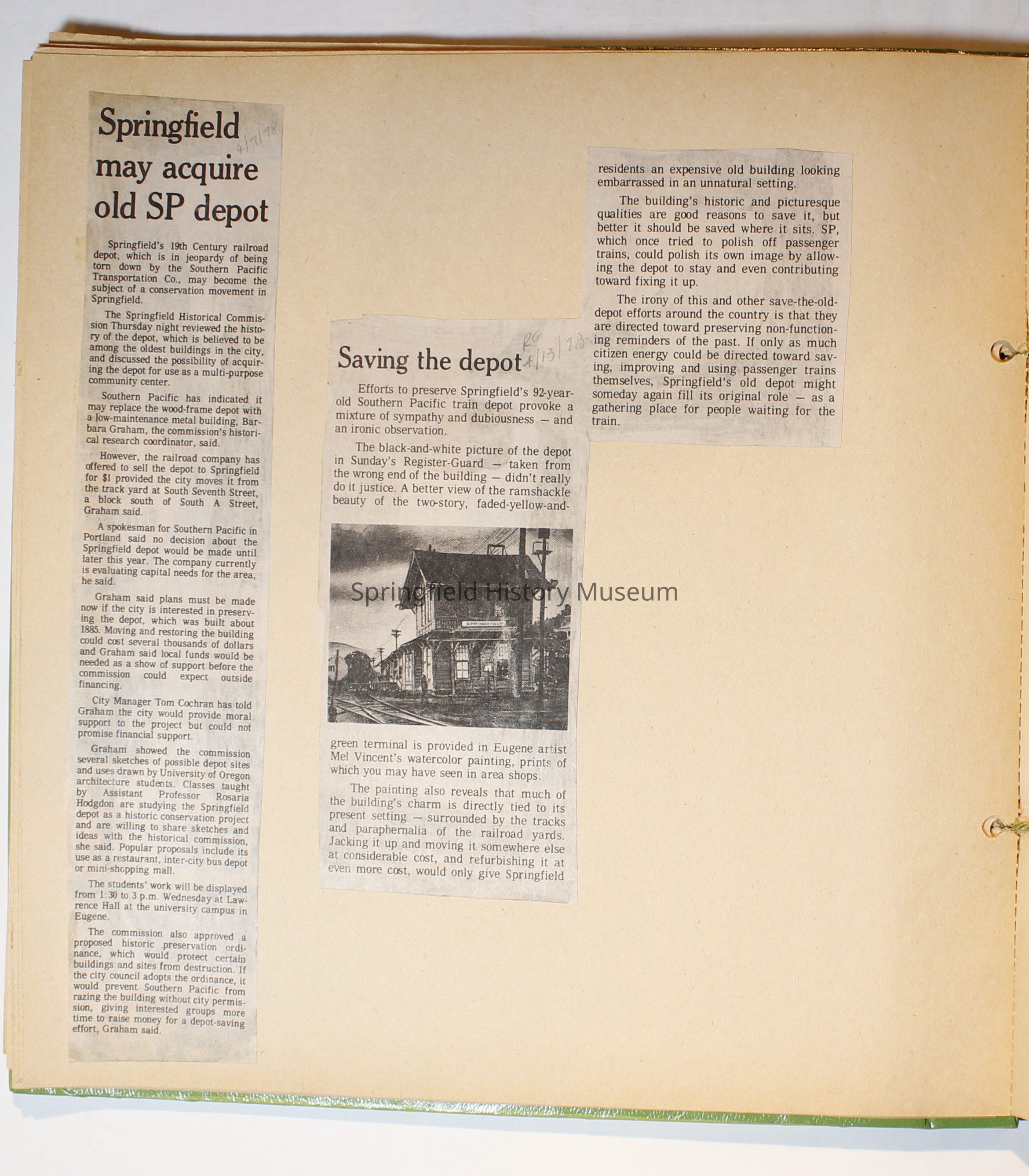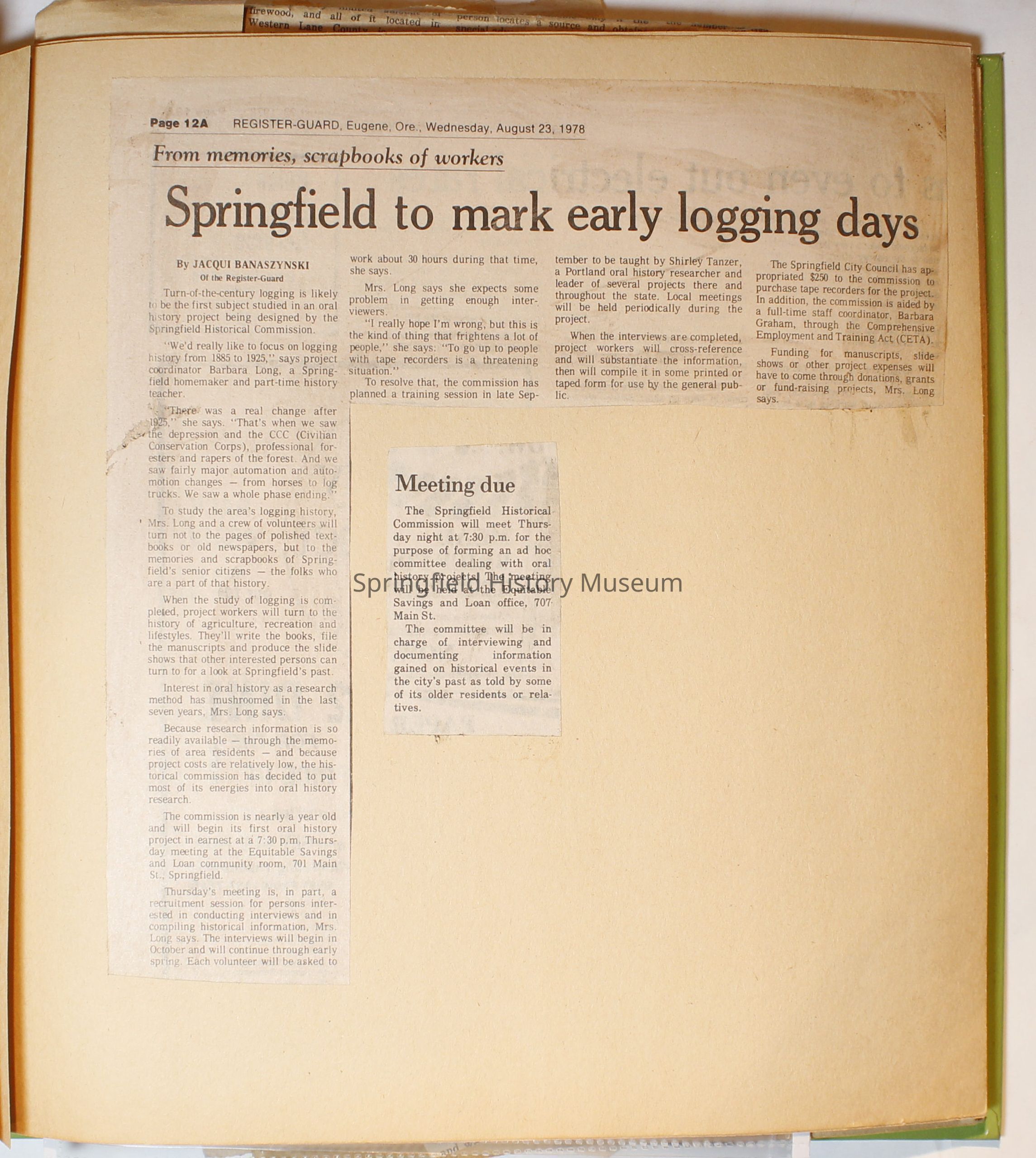 Scrapbook of the activities of the Springfield Historical Commission, circa 1977-79. Contains mostly newspaper clippings.