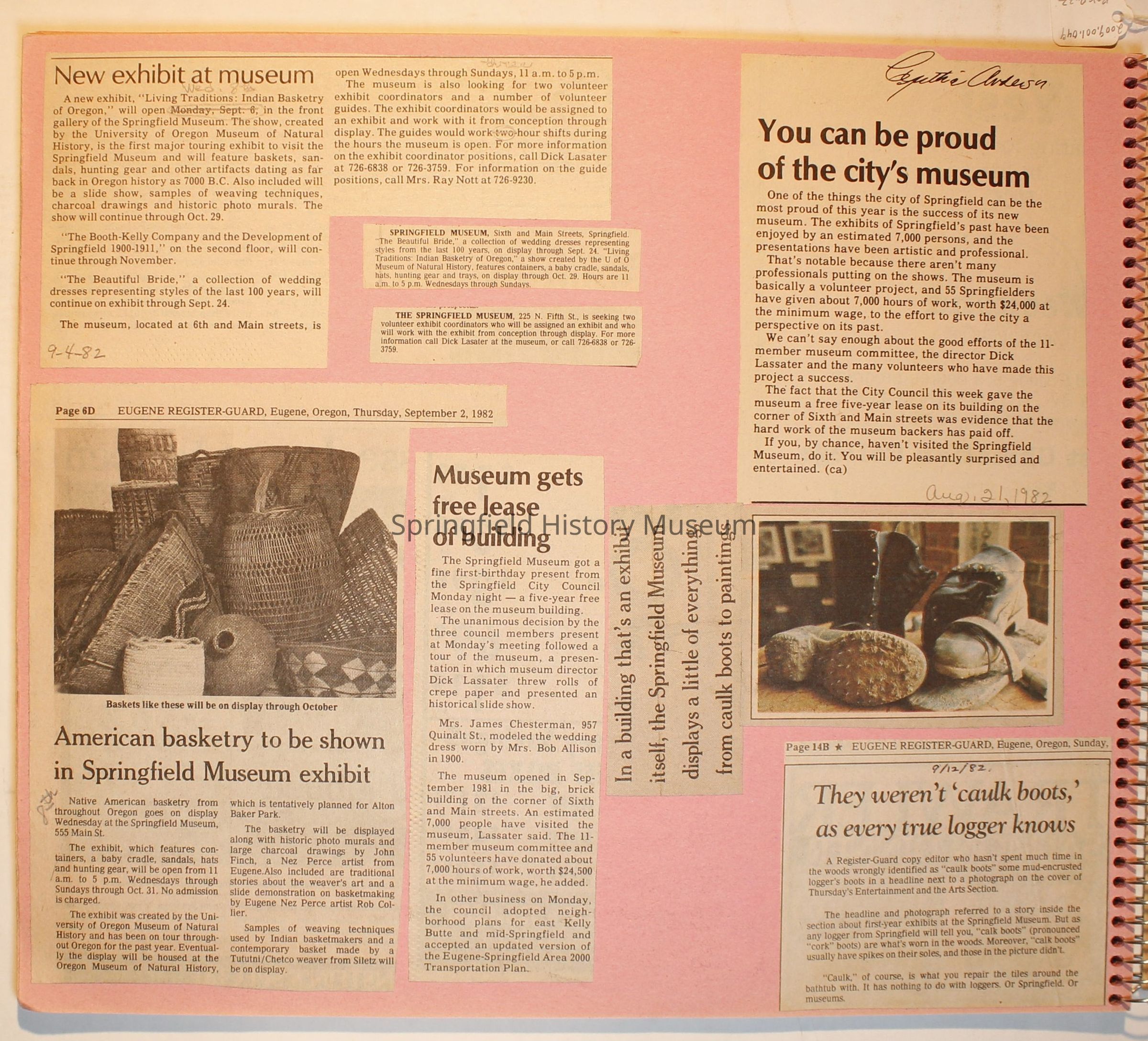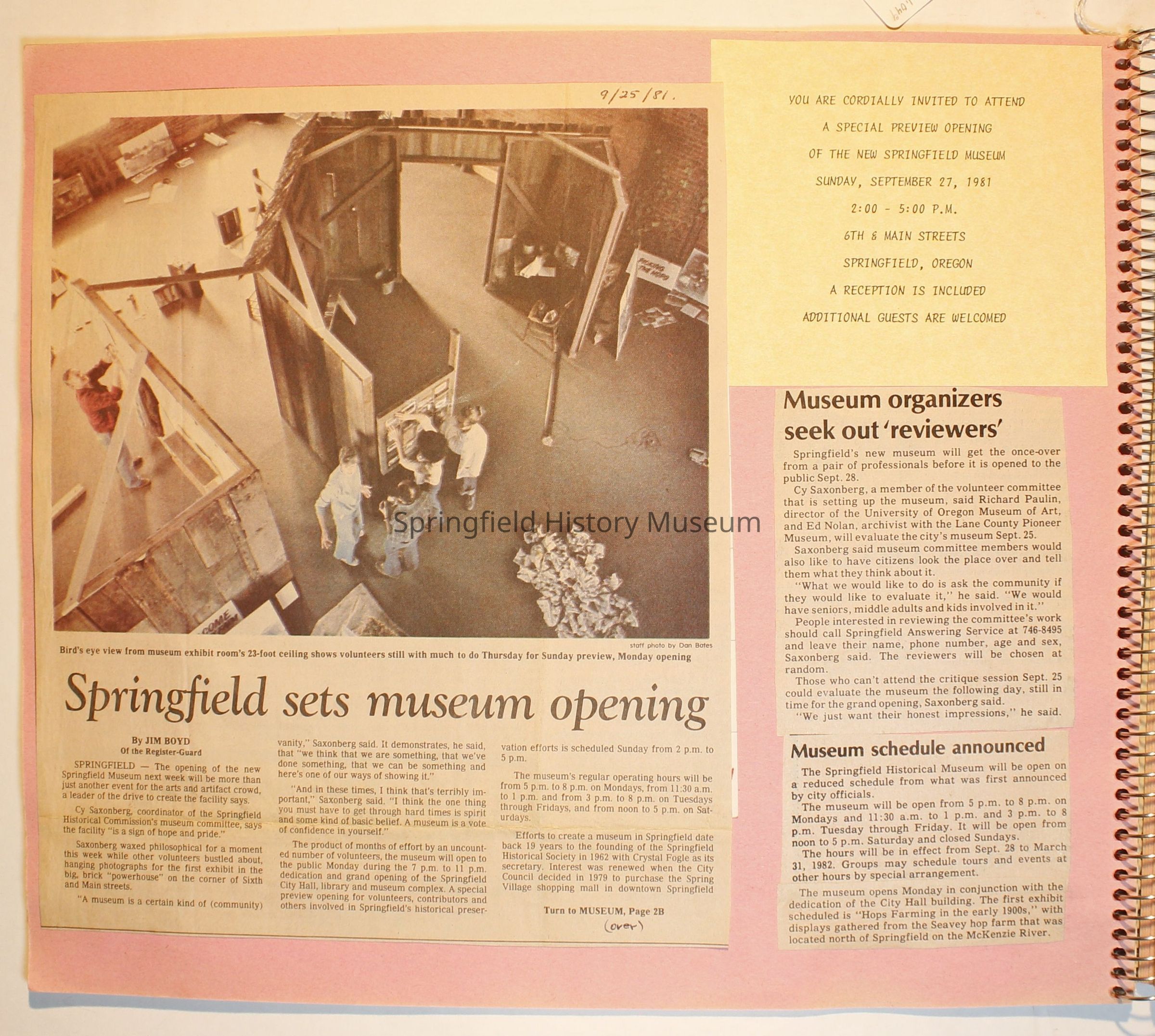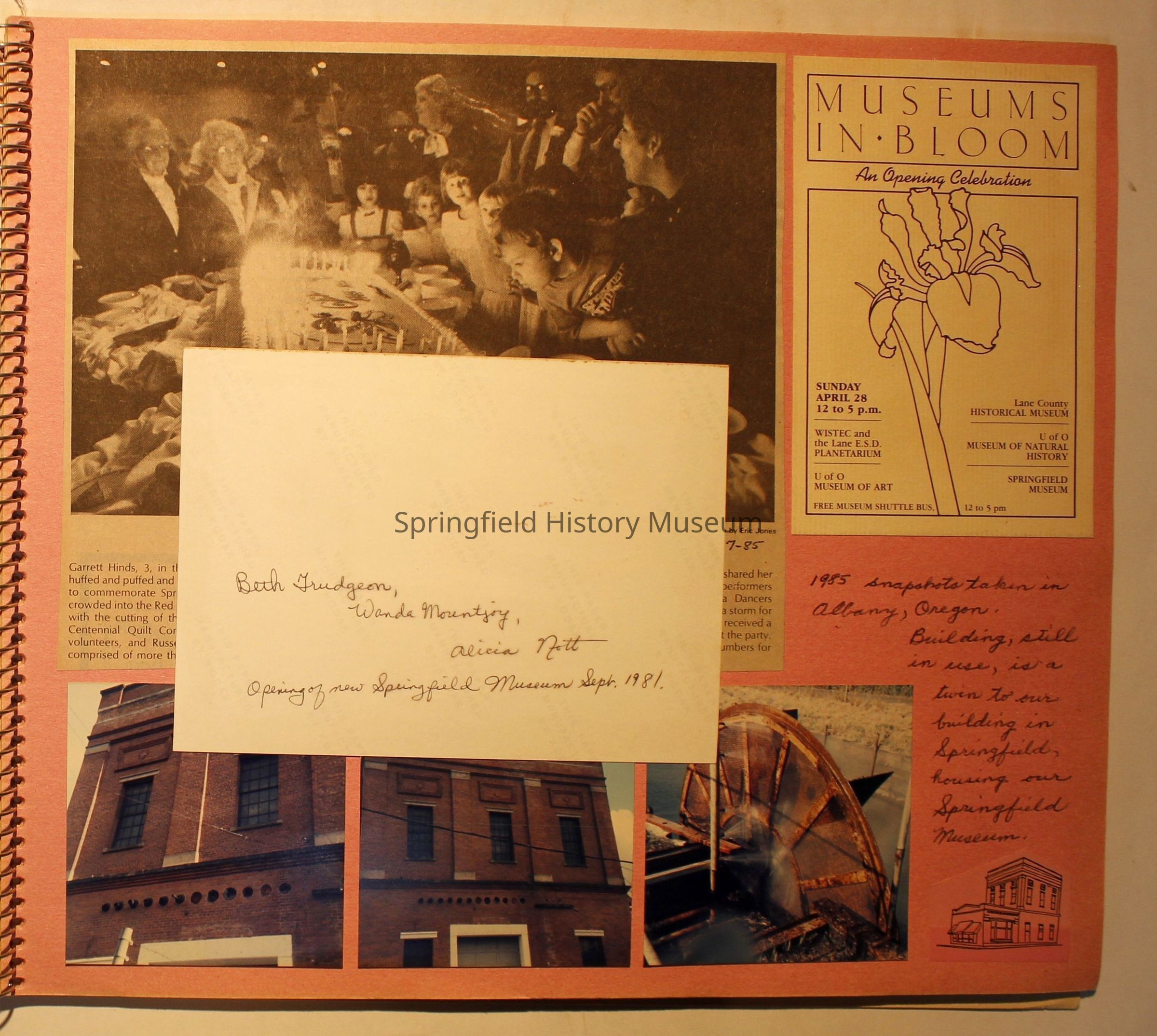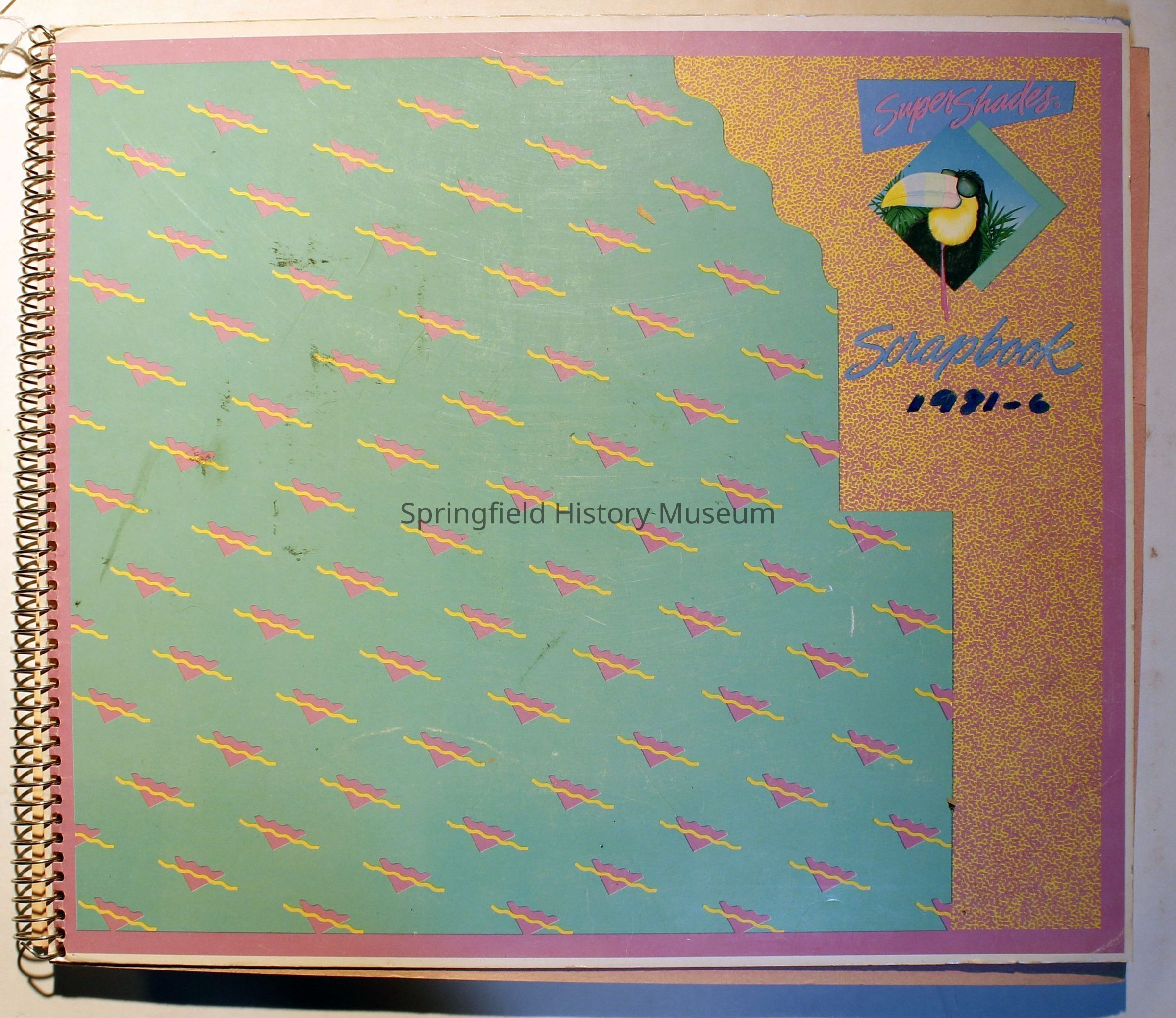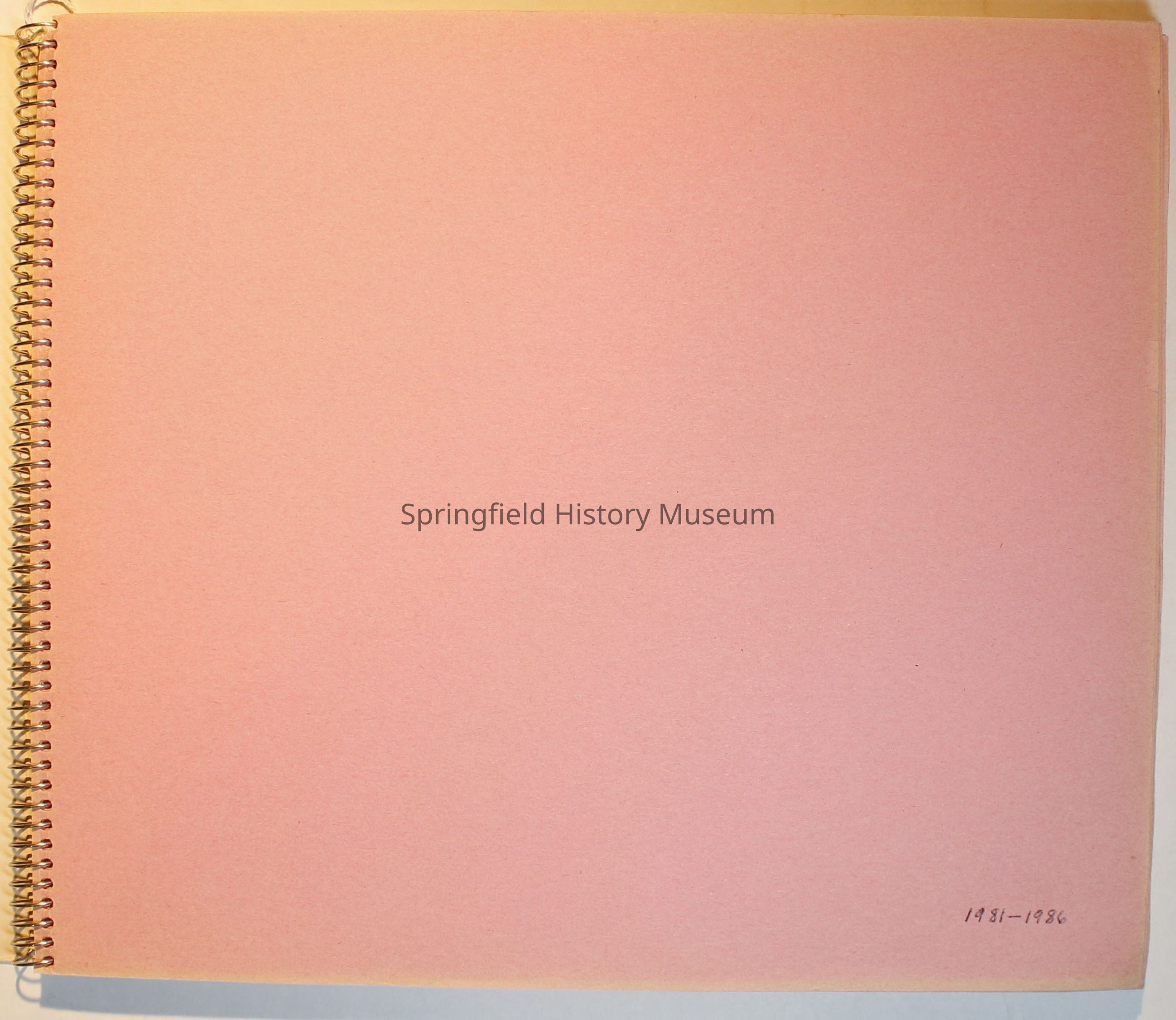 Scrapbook from 1981 through 1986 of Springfield Museum events. Mostly contains newspaper clippings, some event brochures and other papers. Wire spiral bound with green and dark pink cover.Collection