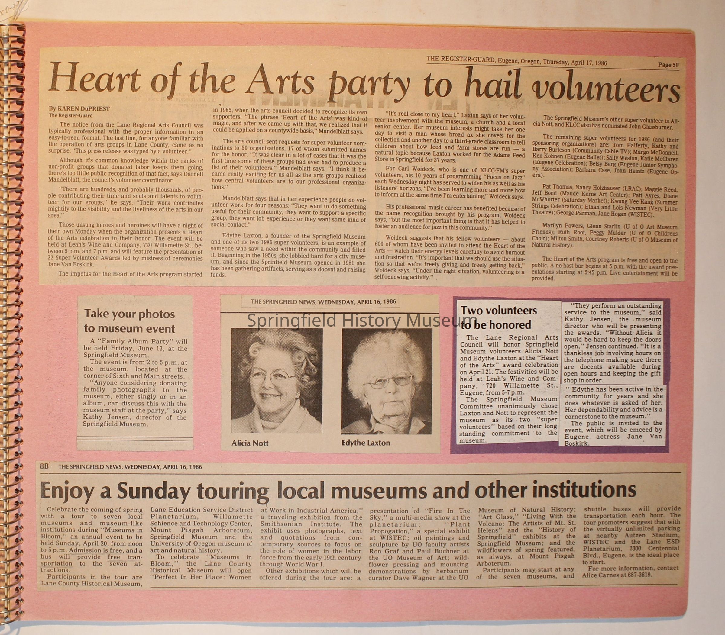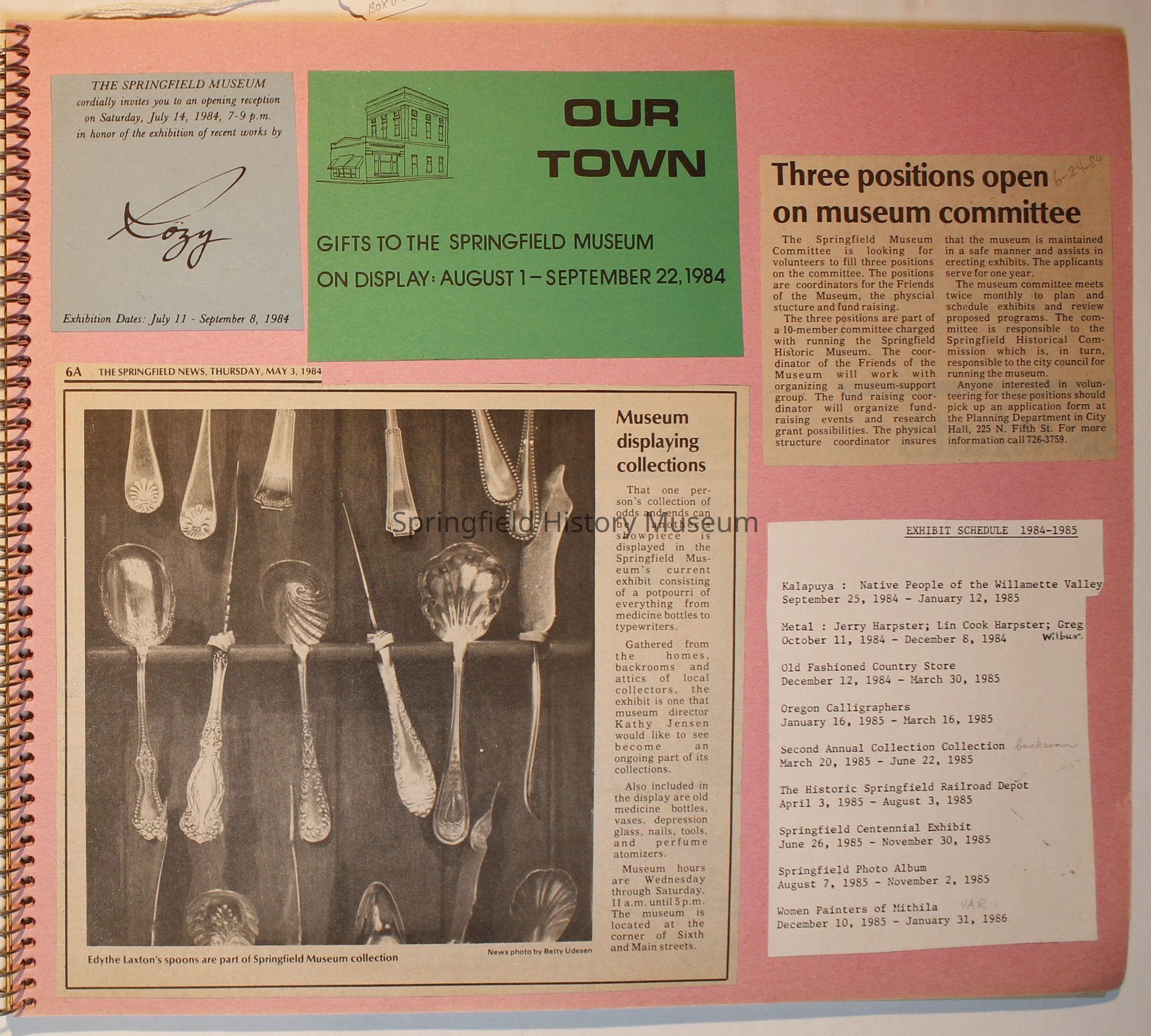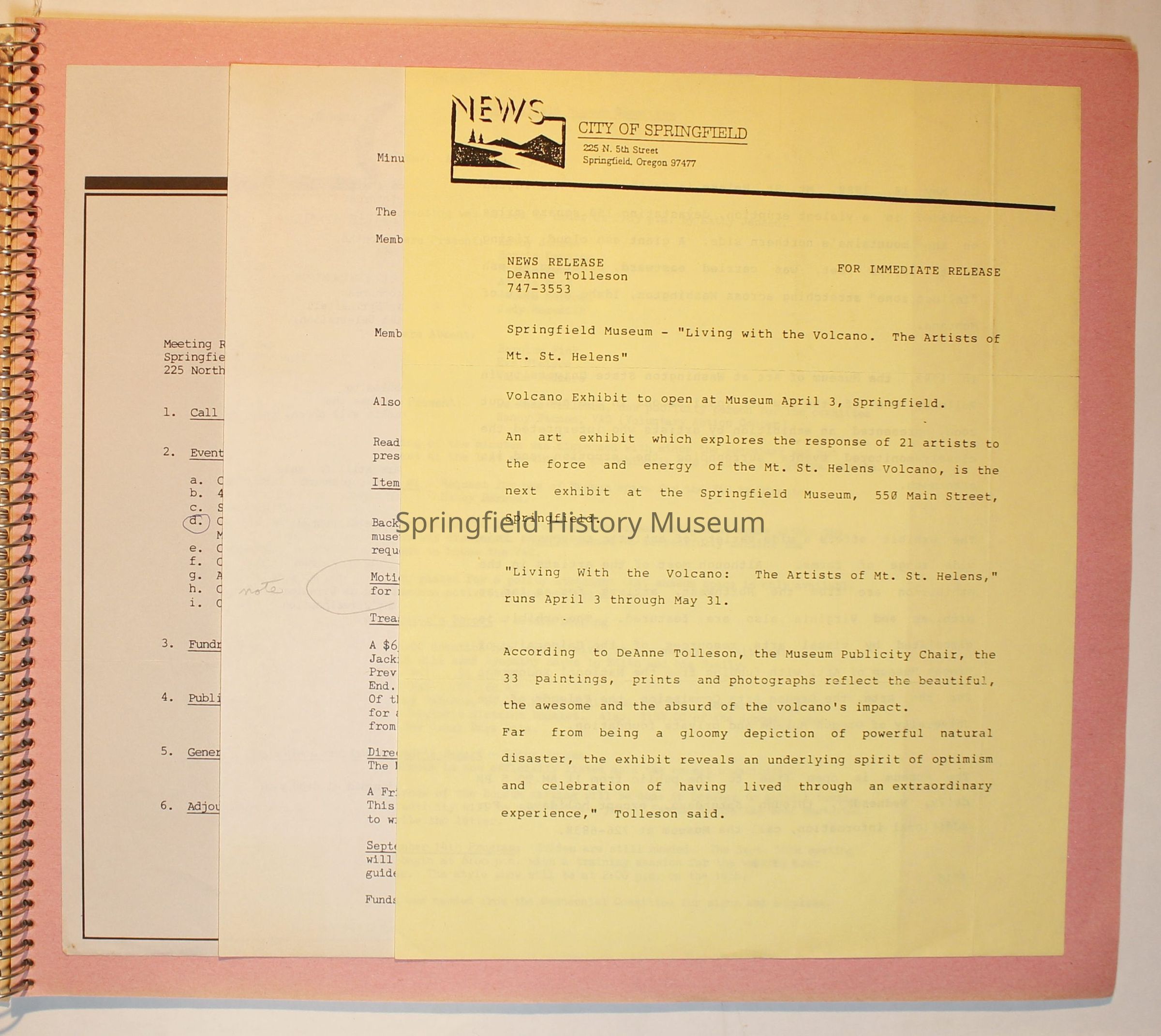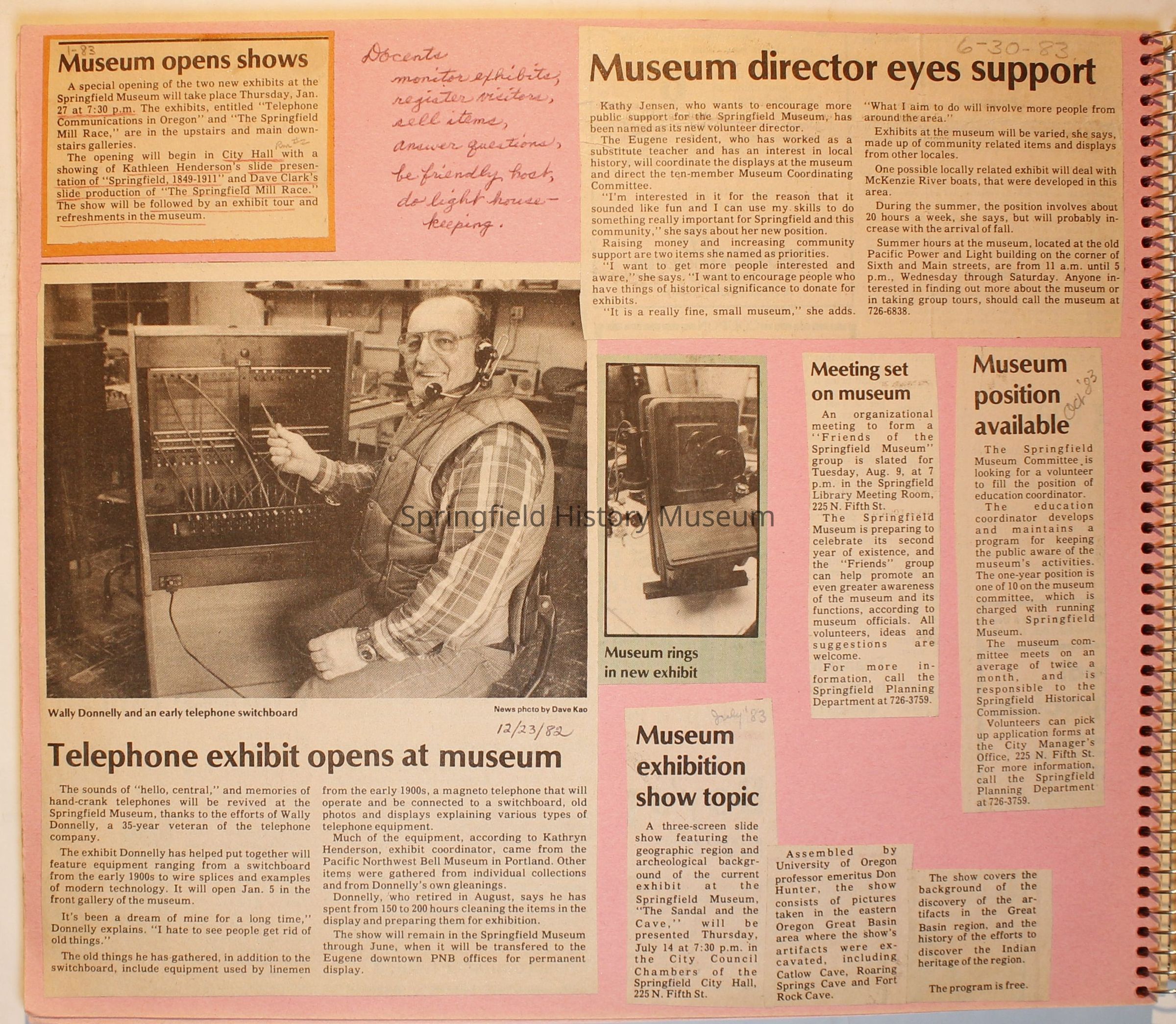 Scrapbook from 1981 through 1986 of Springfield Museum events. Mostly contains newspaper clippings, some event brochures and other papers. Wire spiral bound with green and dark pink cover.Collection