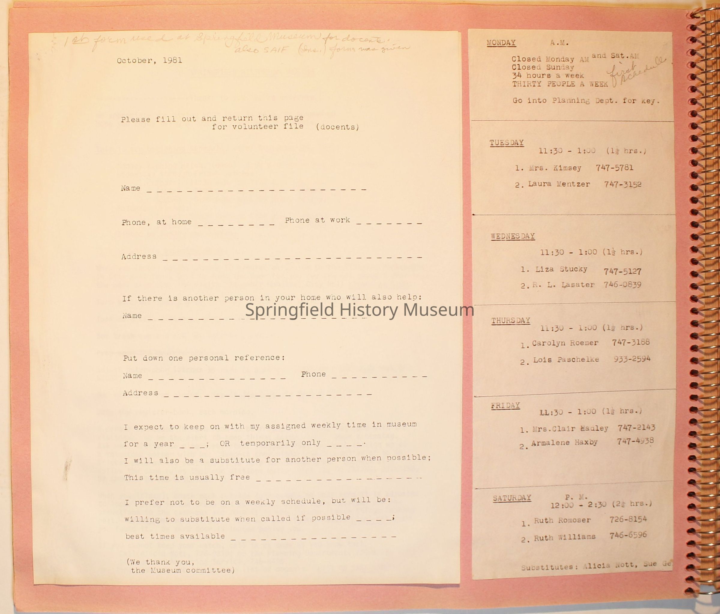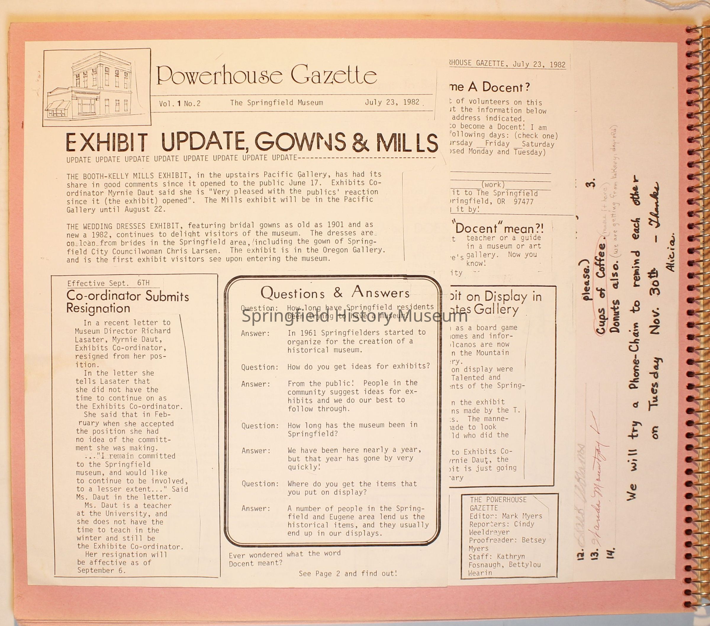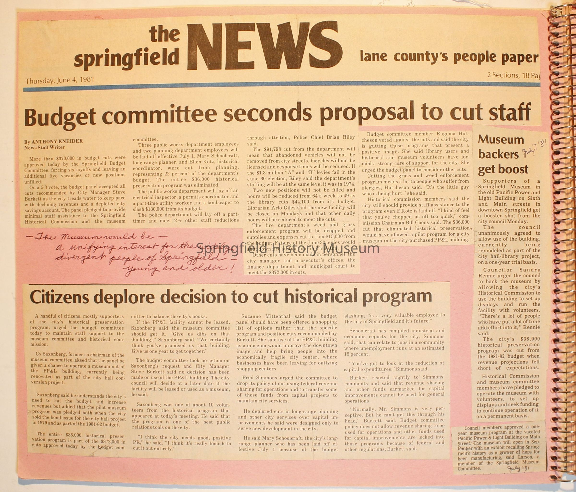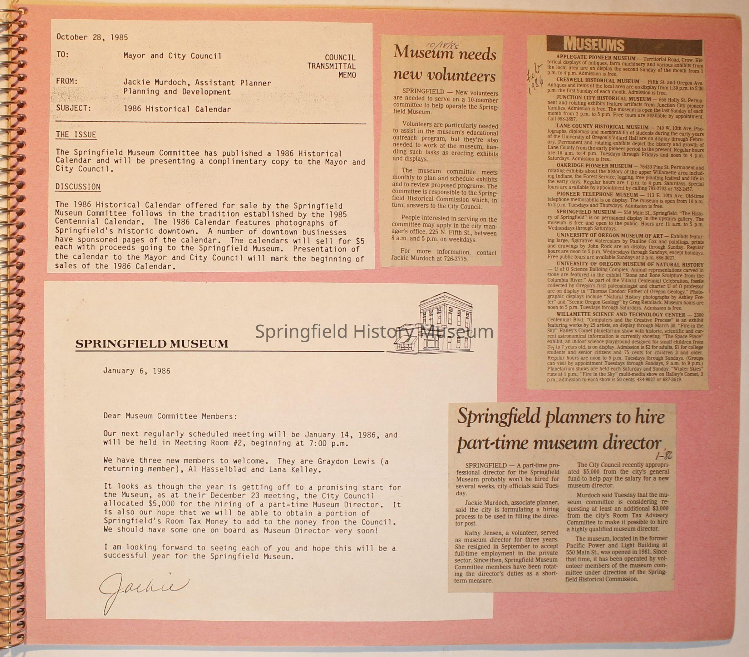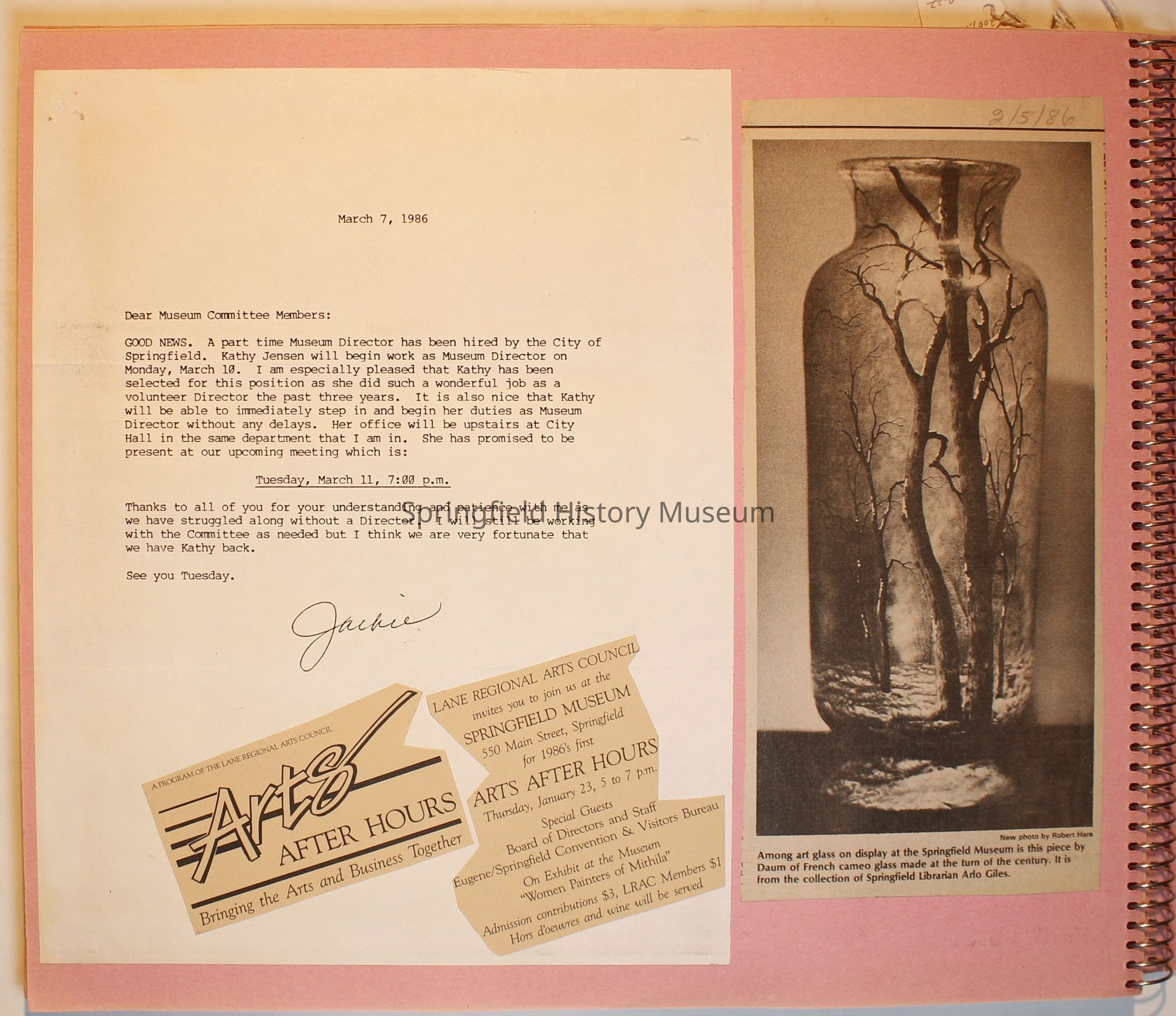 Scrapbook from 1981 through 1986 of Springfield Museum events. Mostly contains newspaper clippings, some event brochures and other papers. Wire spiral bound with green and dark pink cover.Collection