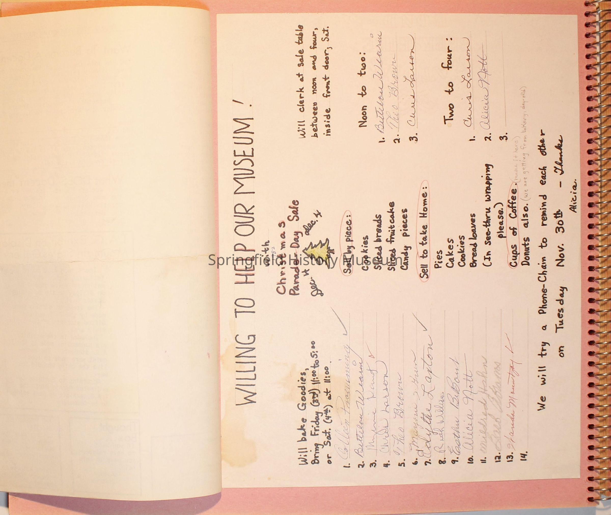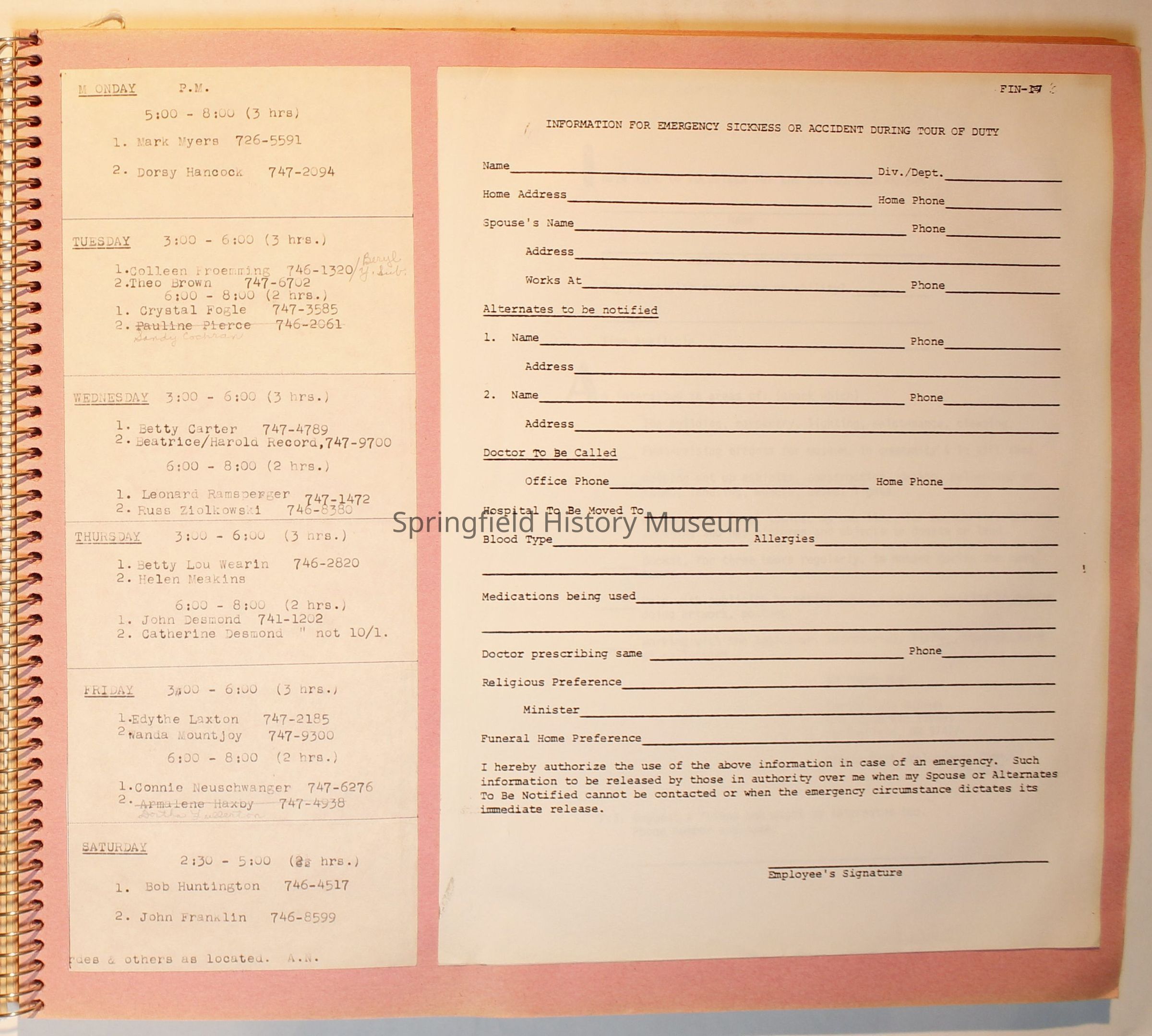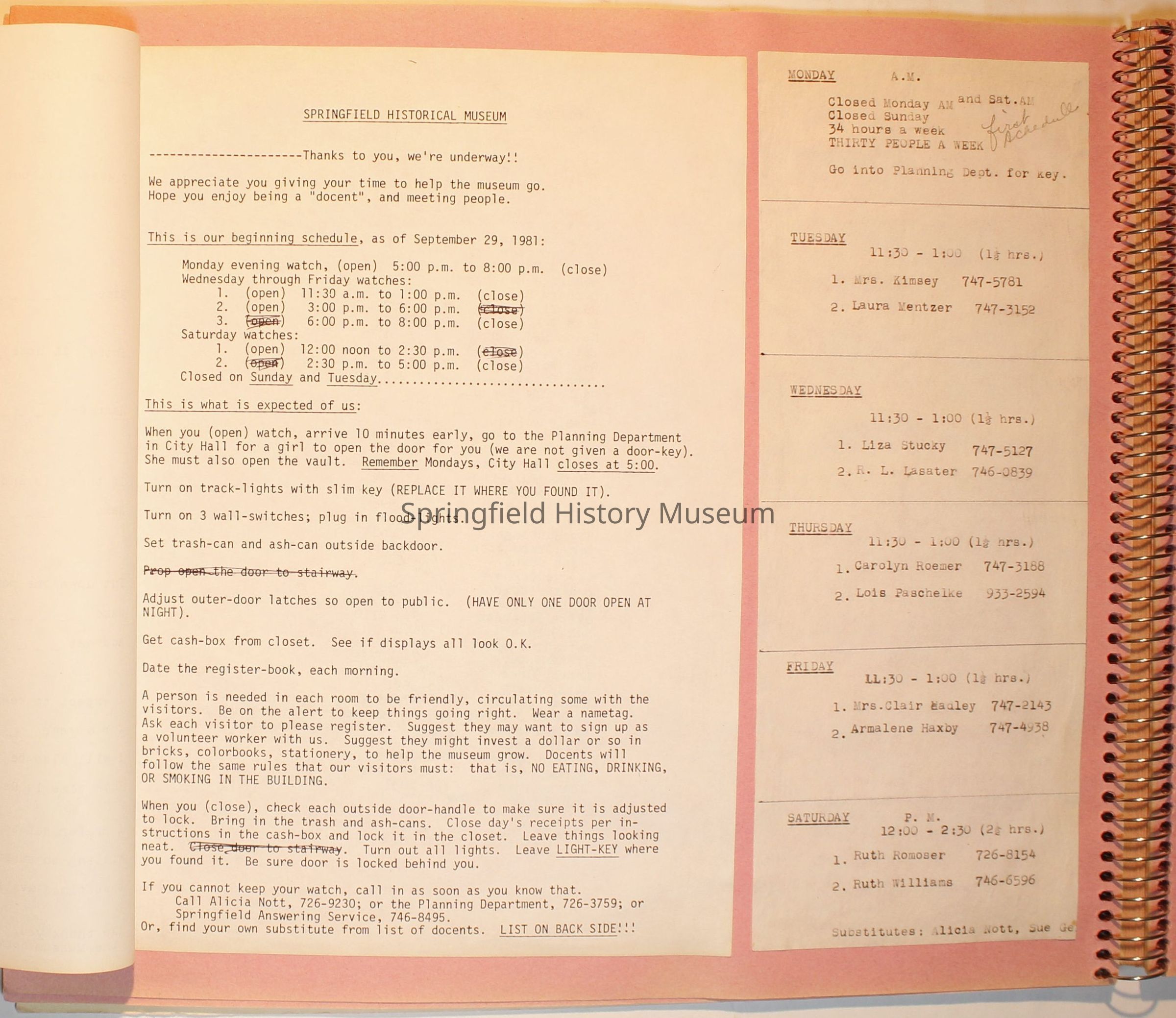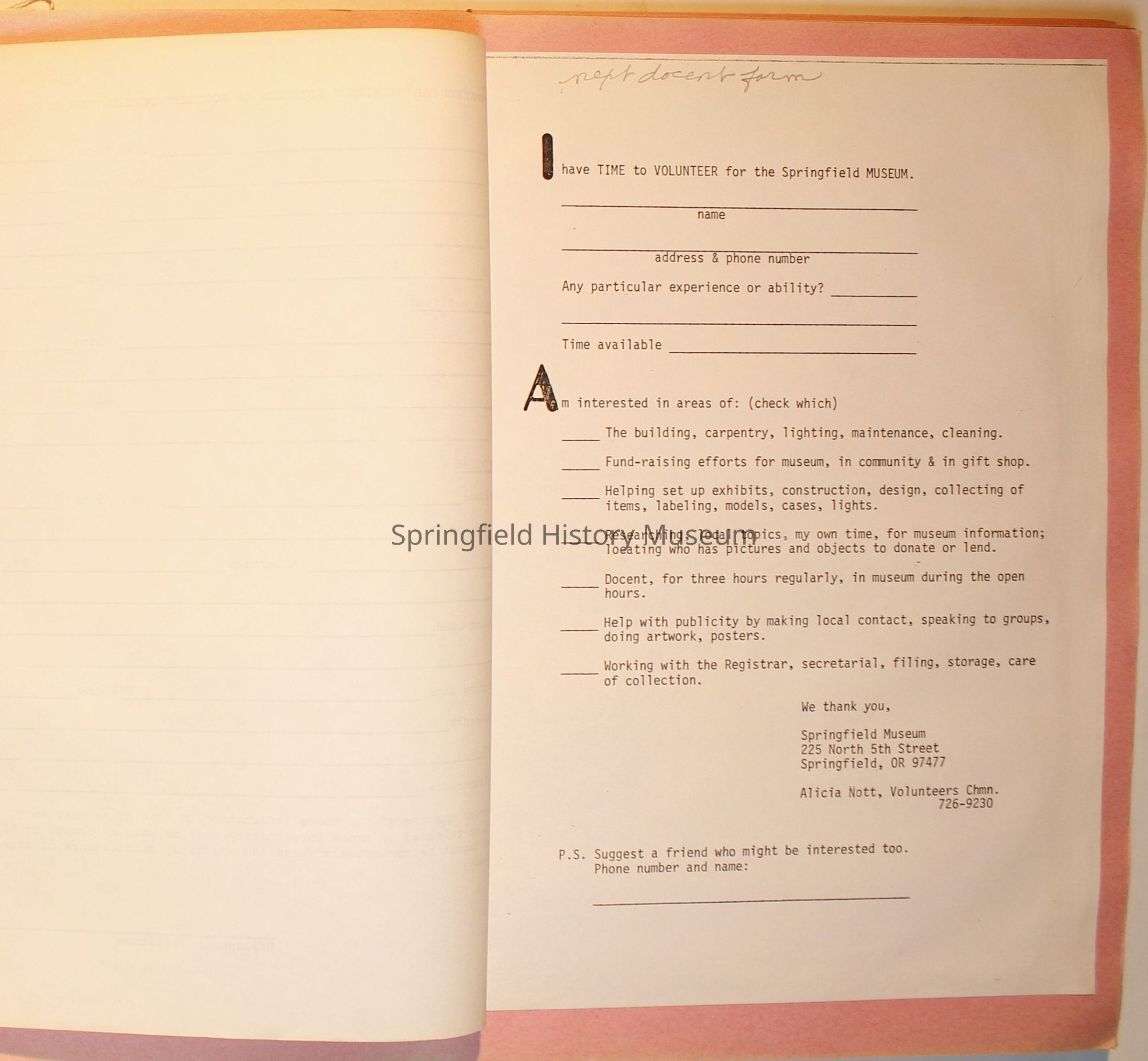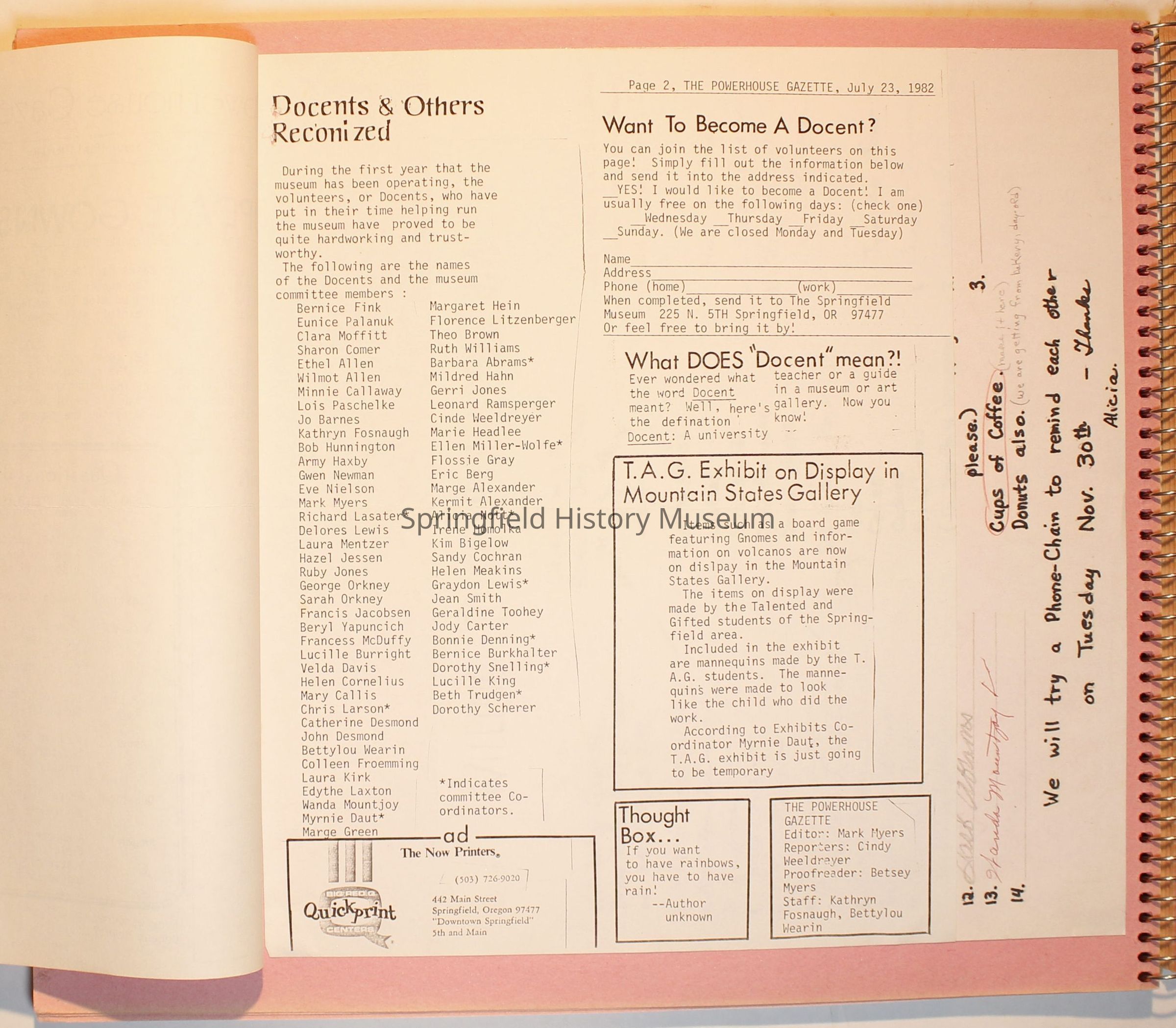 Scrapbook from 1981 through 1986 of Springfield Museum events. Mostly contains newspaper clippings, some event brochures and other papers. Wire spiral bound with green and dark pink cover.Collection