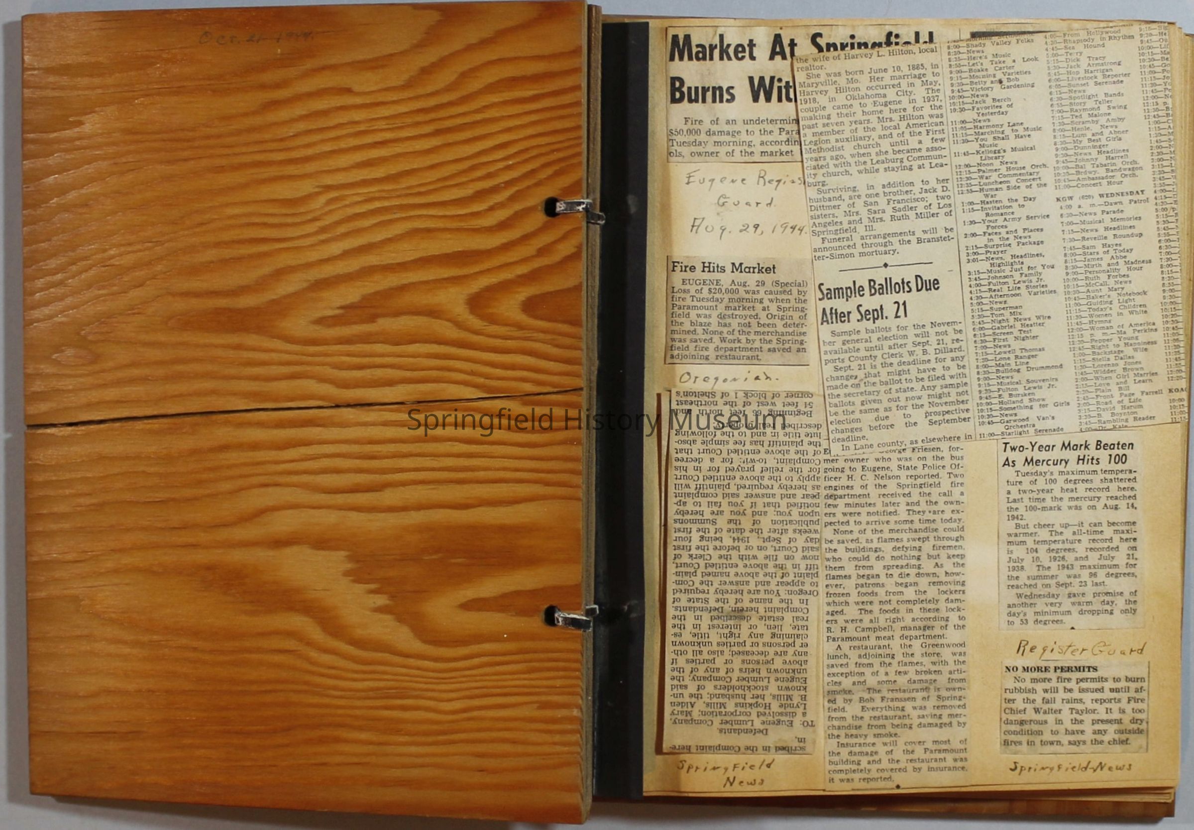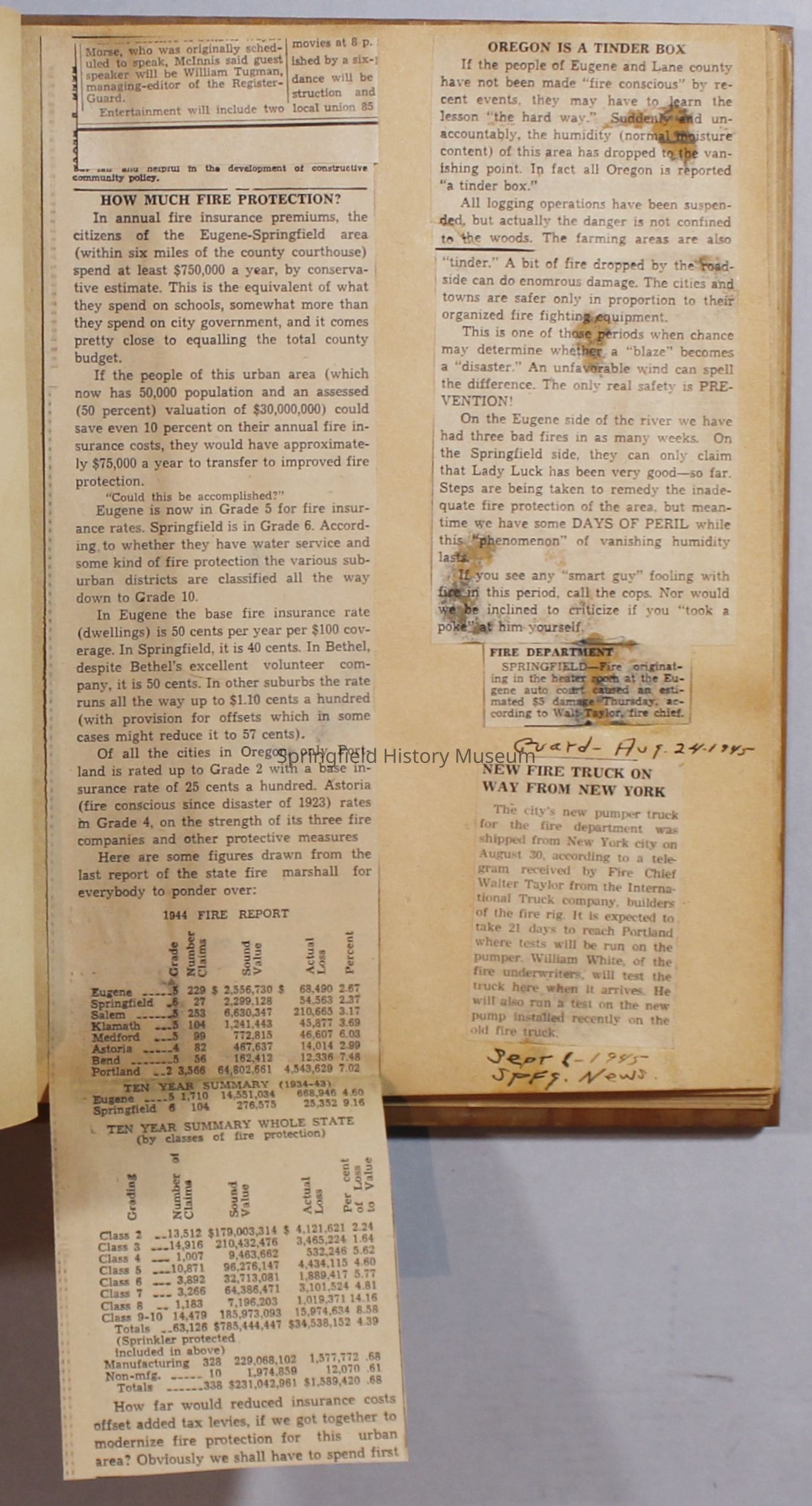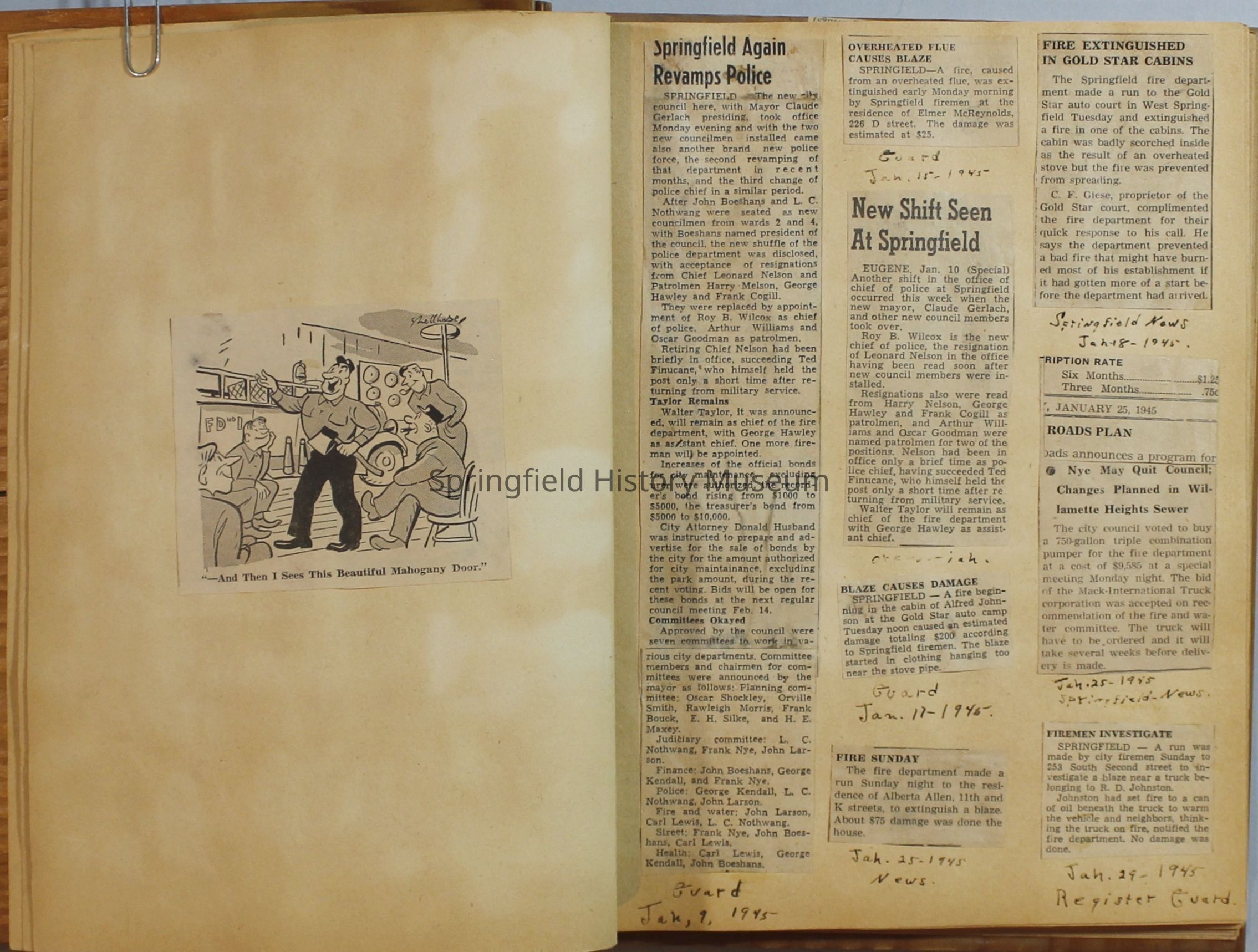 Scrapbook with newspaper clipping about Springfield fires, fire and police department, 1944-1945. Created by the Taylor family.Acquisition