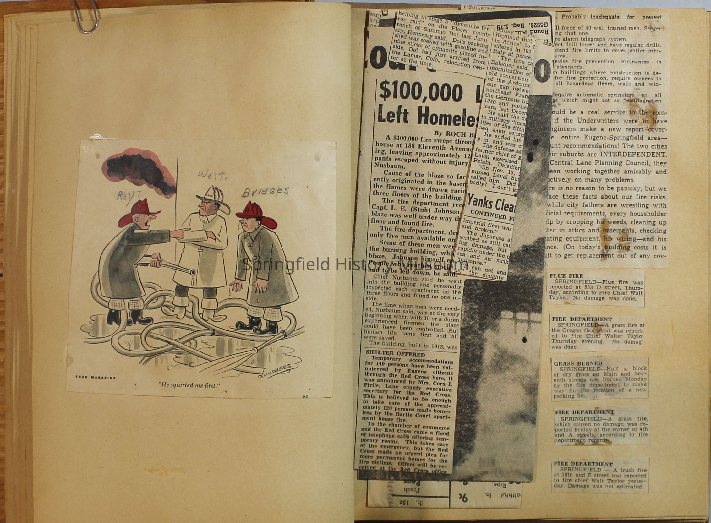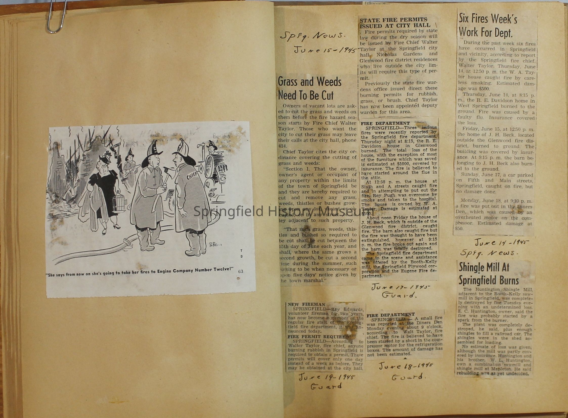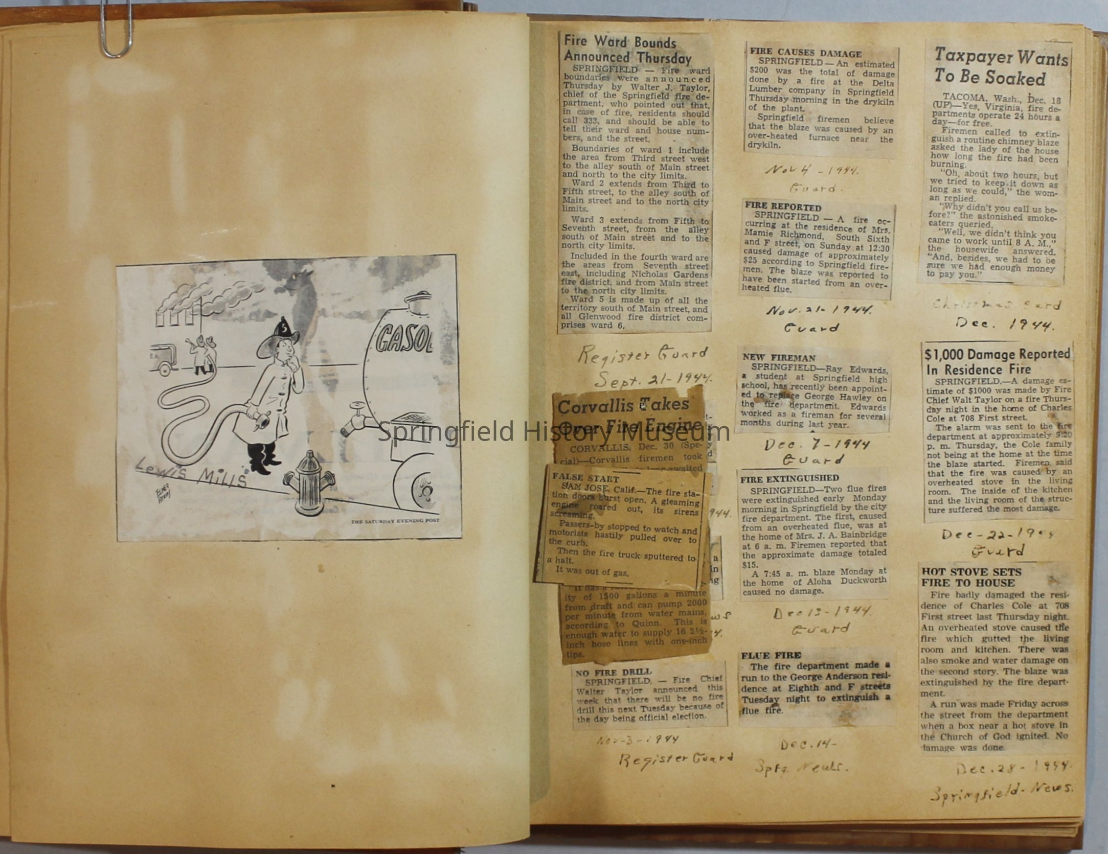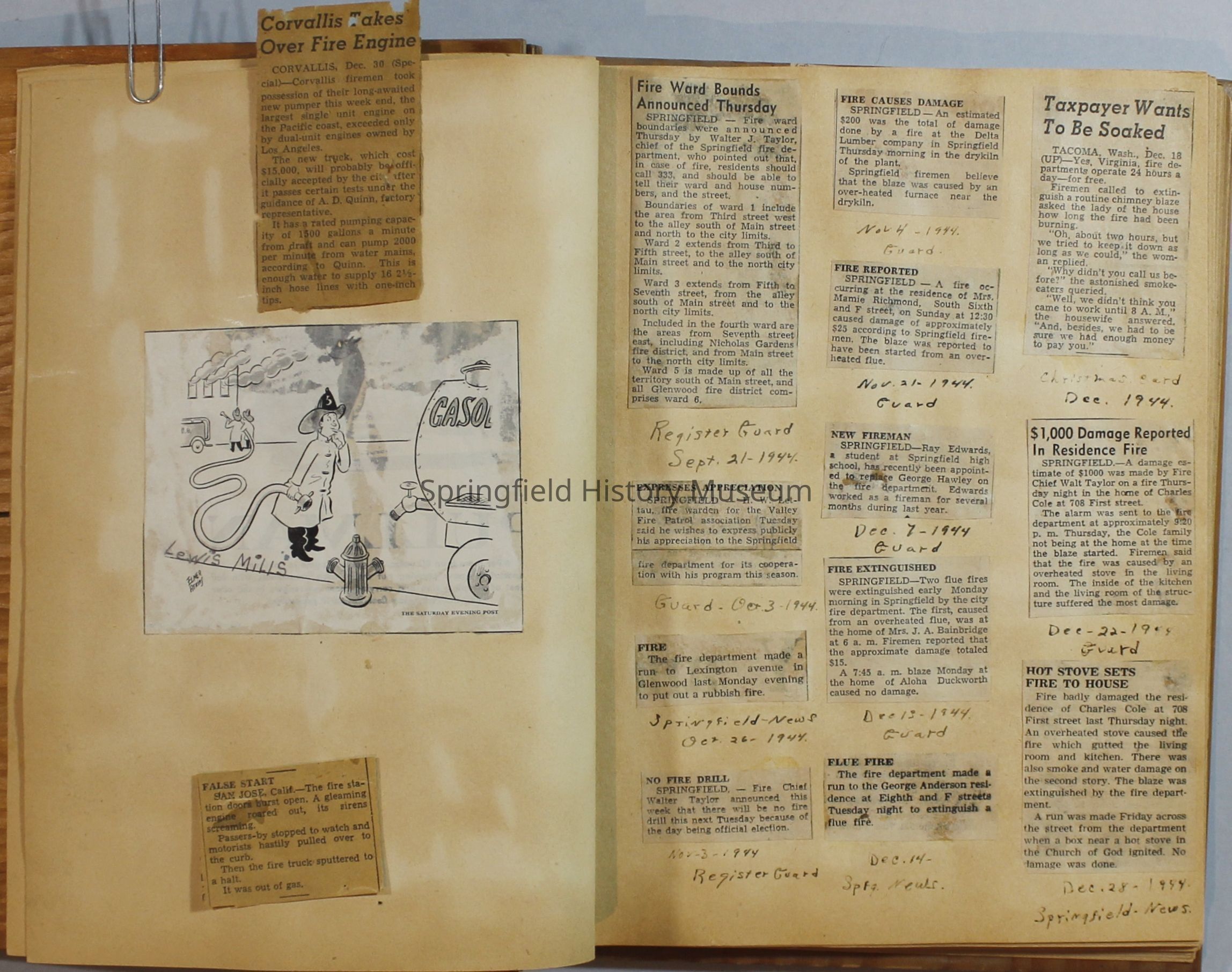 Scrapbook with newspaper clipping about Springfield fires, fire and police department, 1944-1945. Created by the Taylor family.Archive Items Details