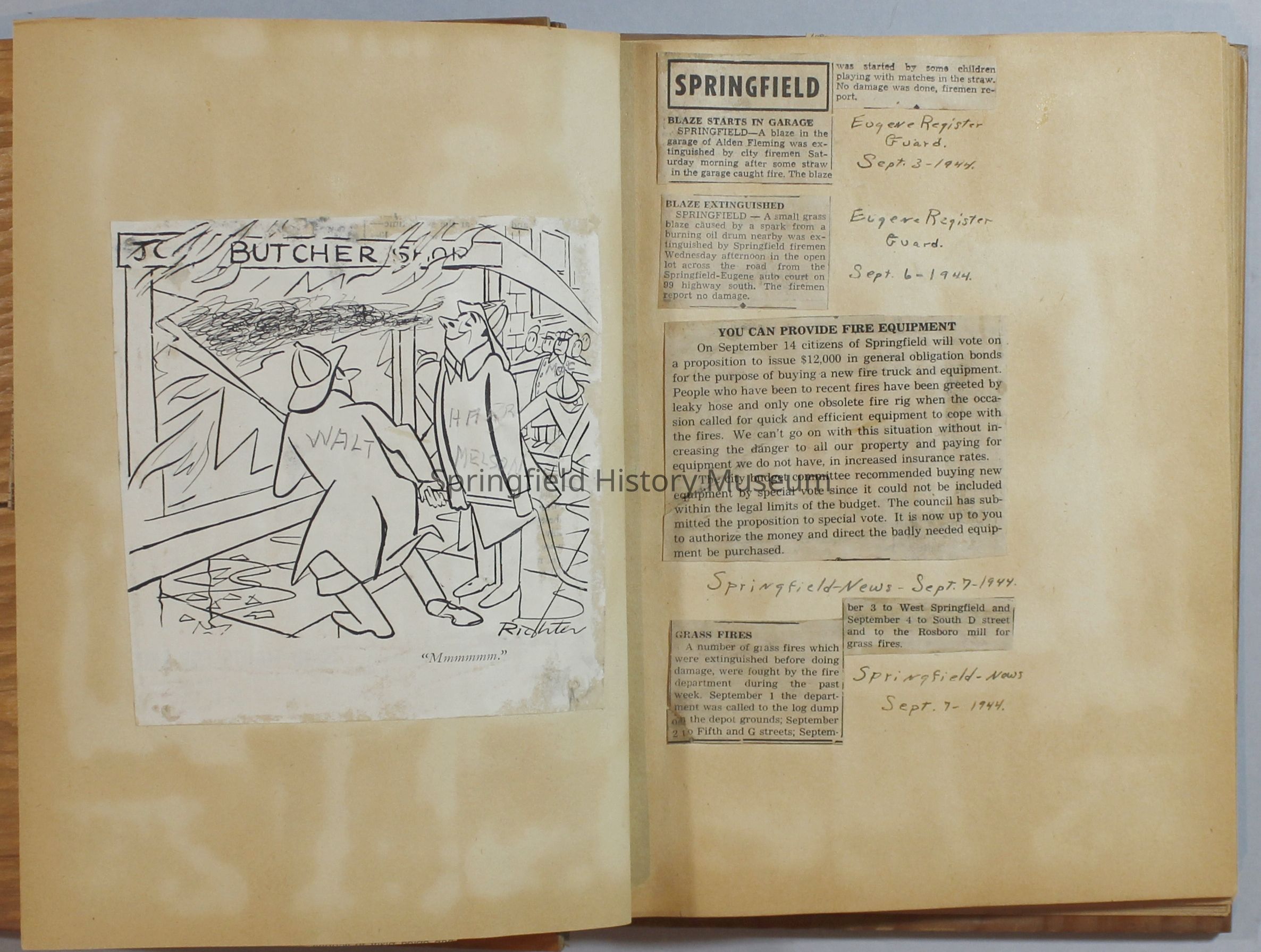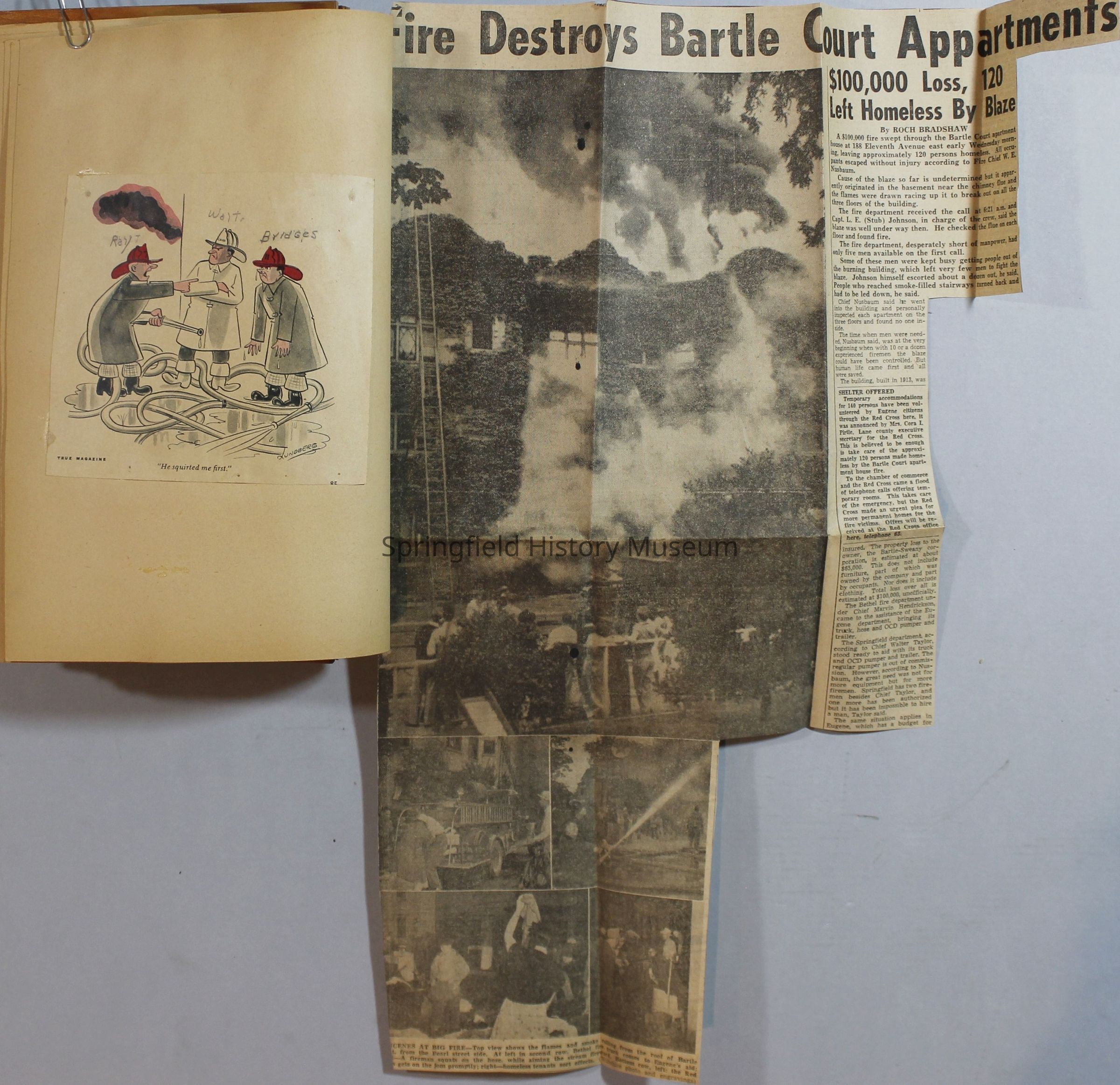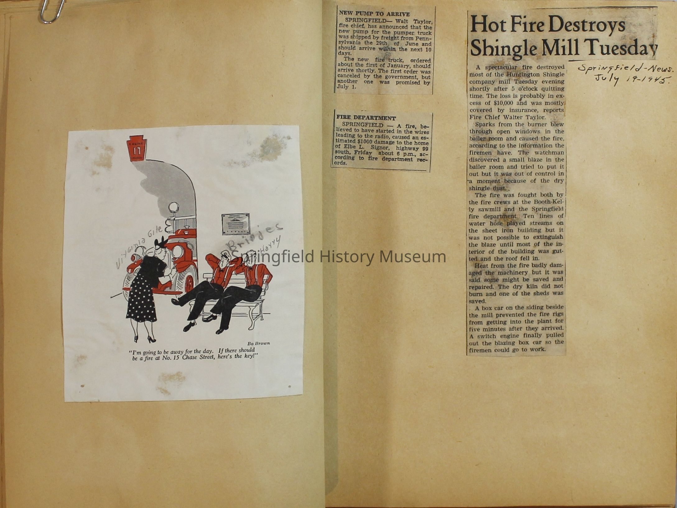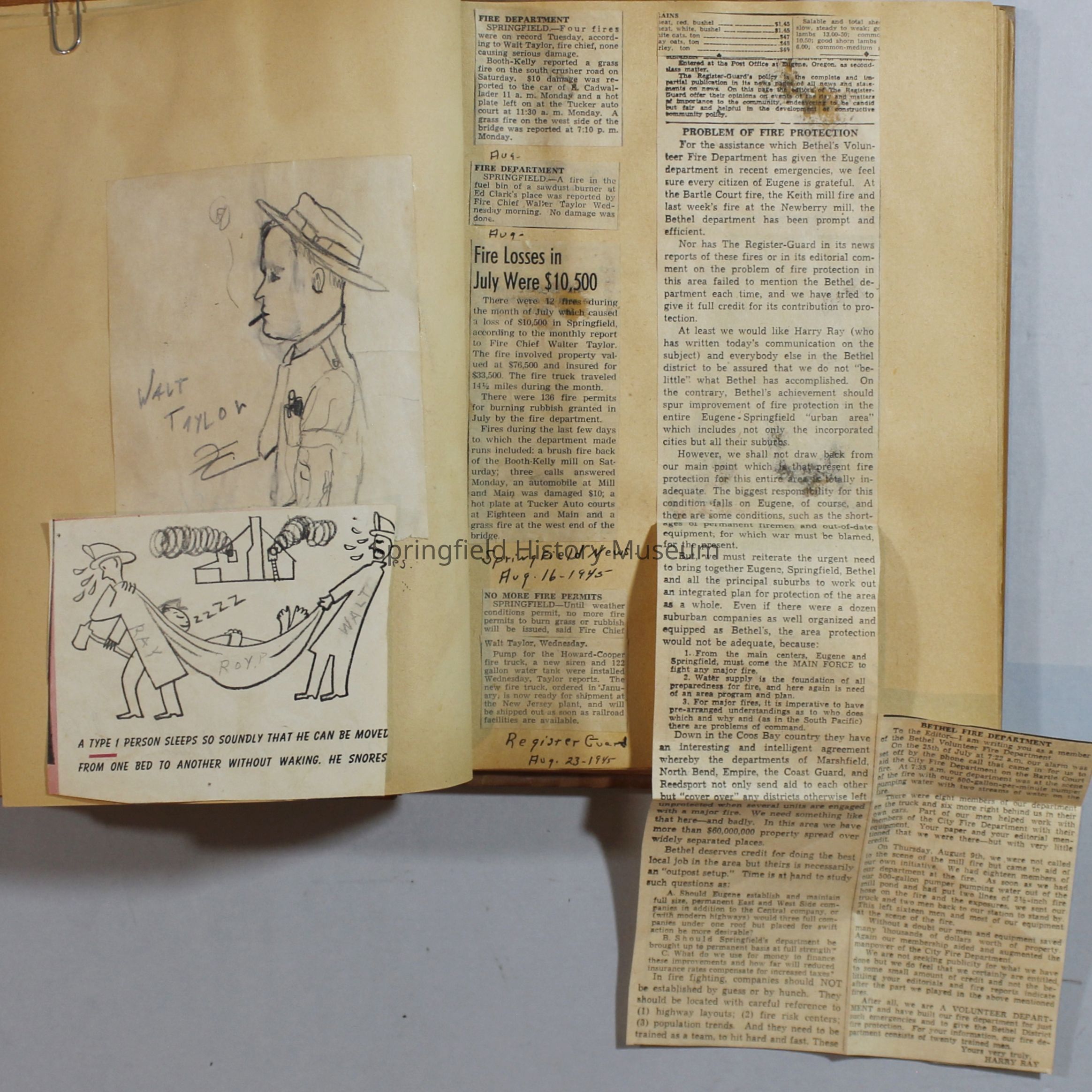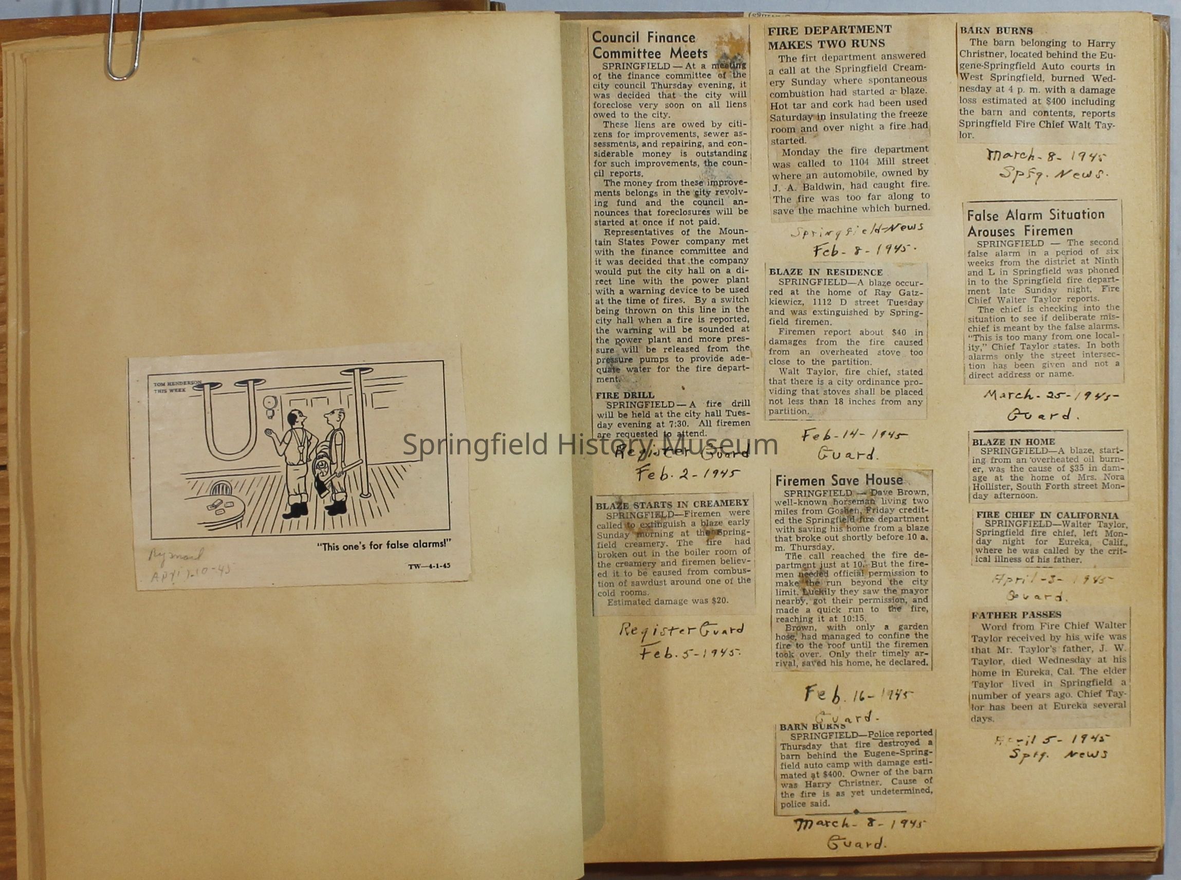 Scrapbook with newspaper clipping about Springfield fires, fire and police department, 1944-1945. Created by the Taylor family.Archive Items Details