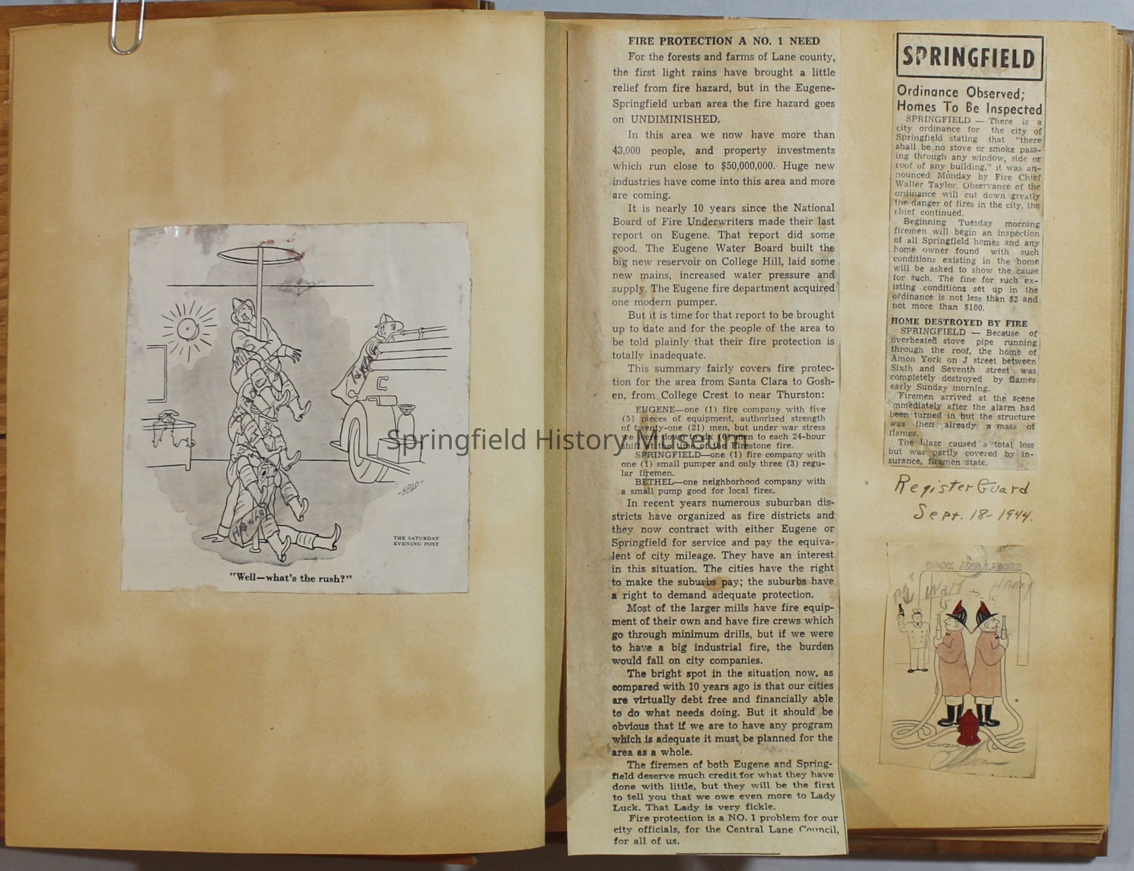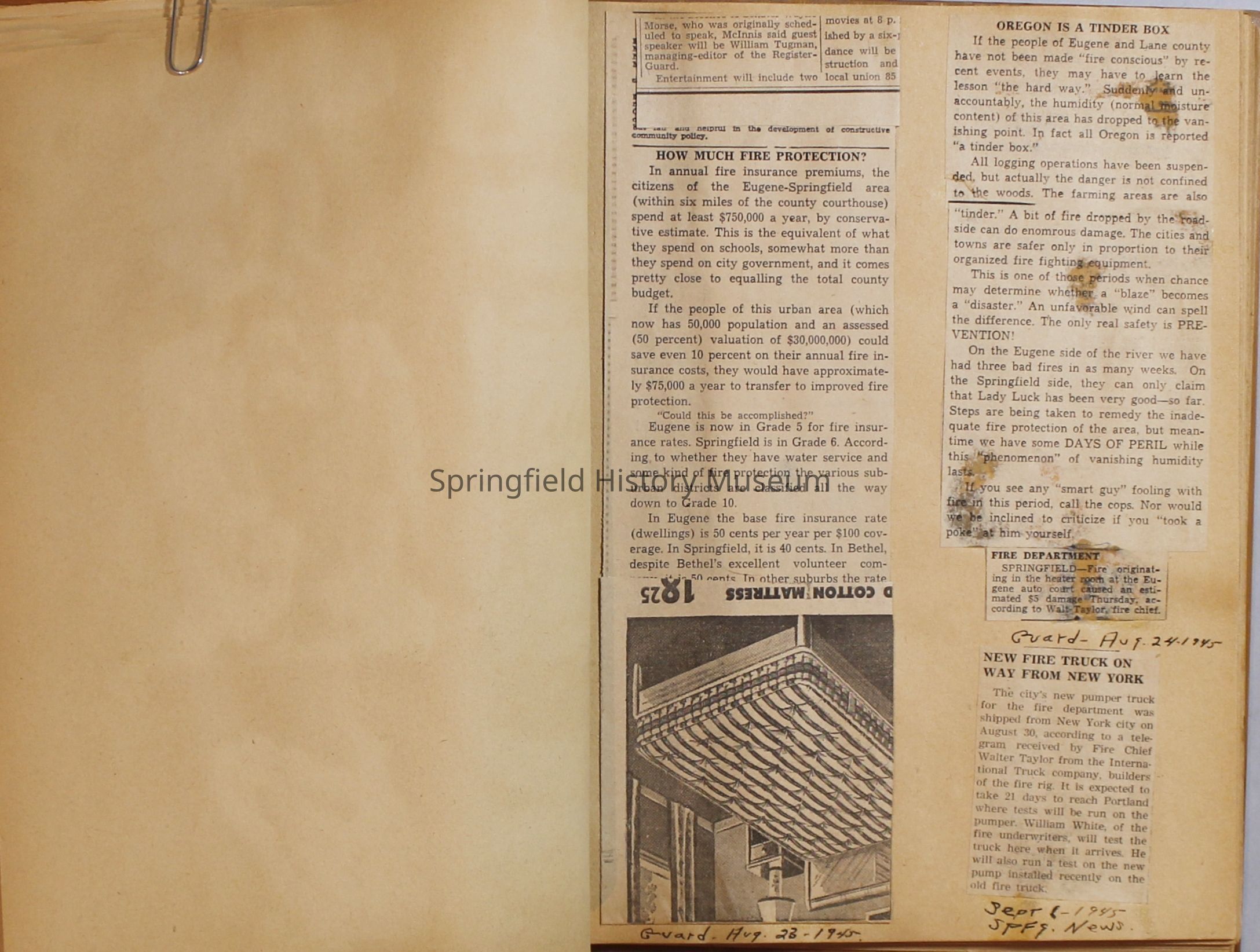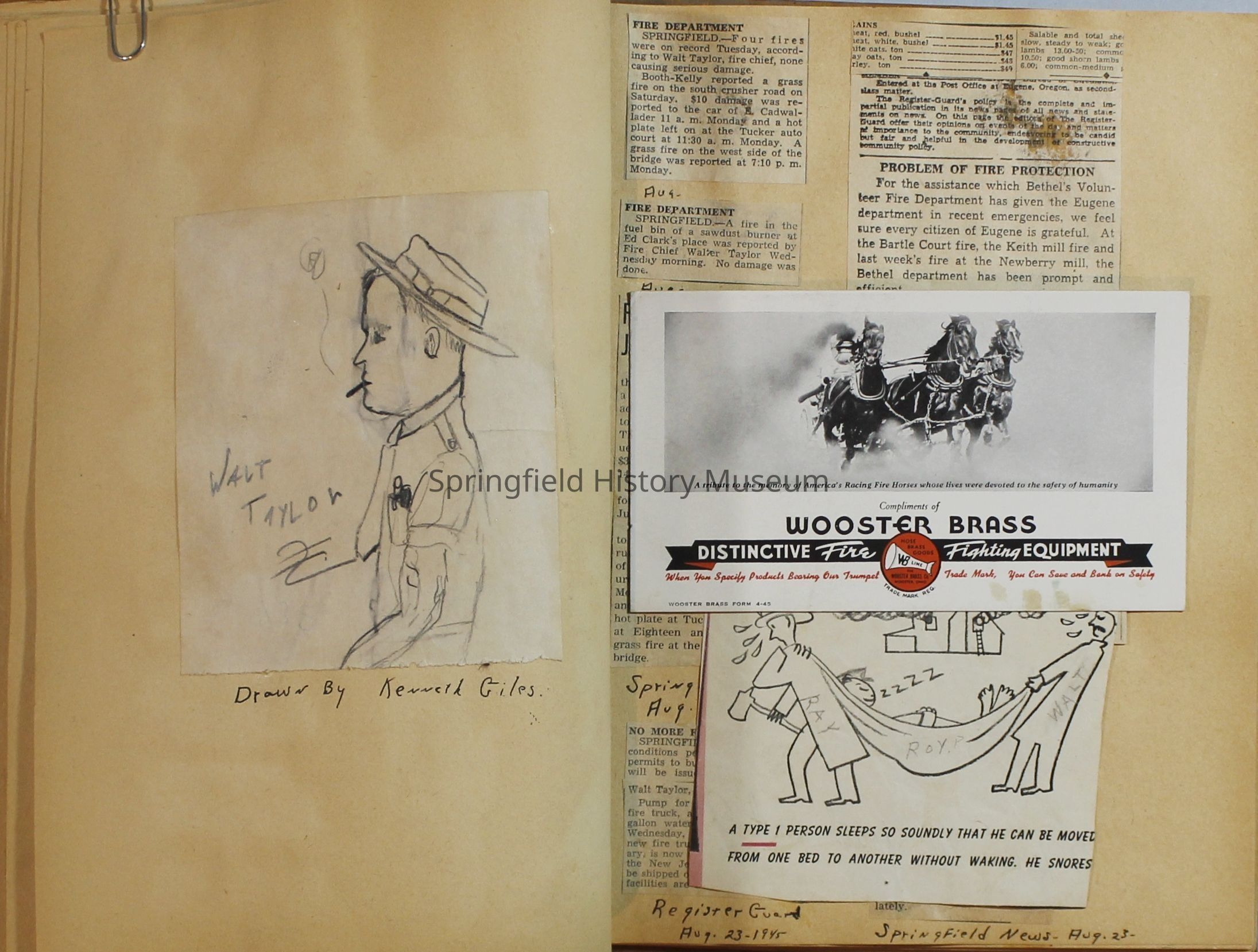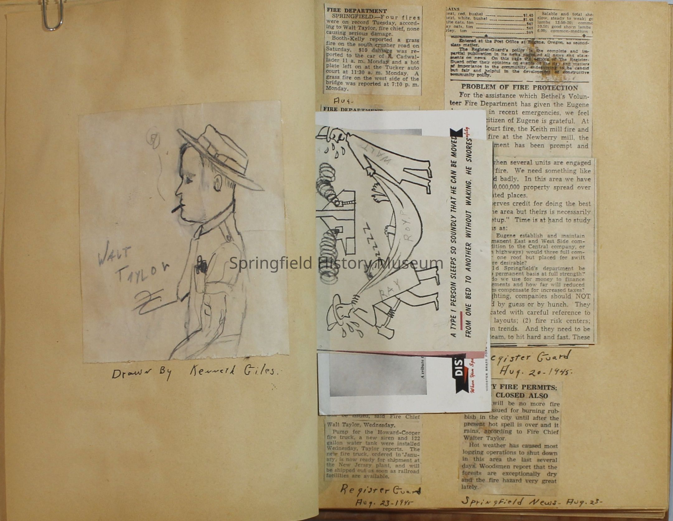 Scrapbook with newspaper clipping about Springfield fires, fire and police department, 1944-1945. Created by the Taylor family.Archive Items Details