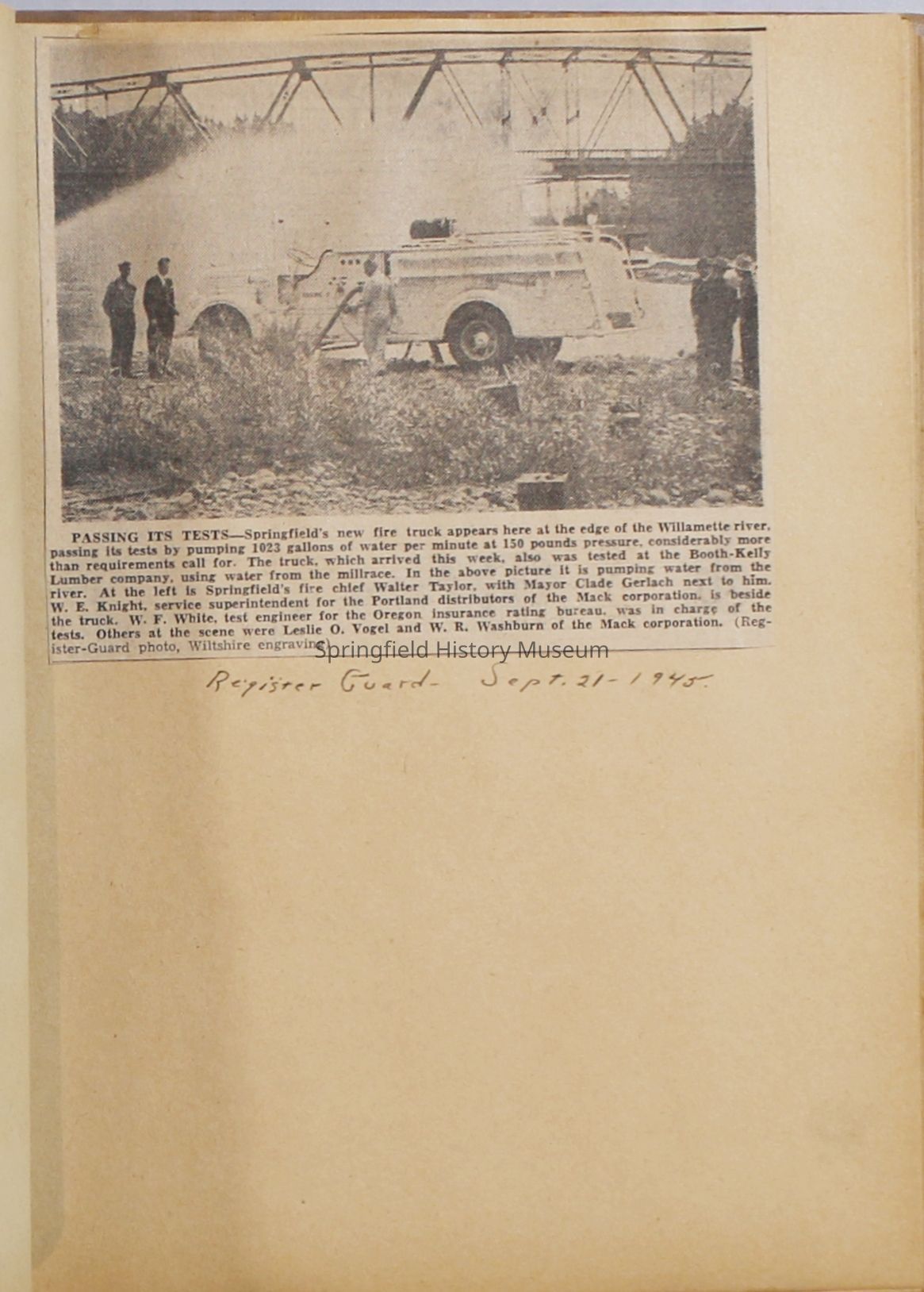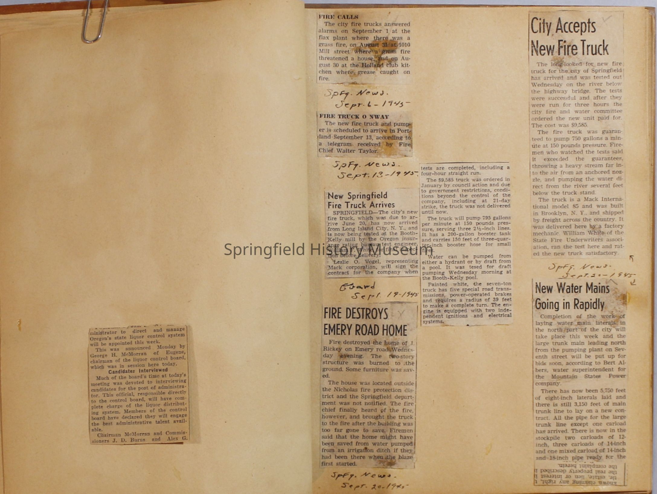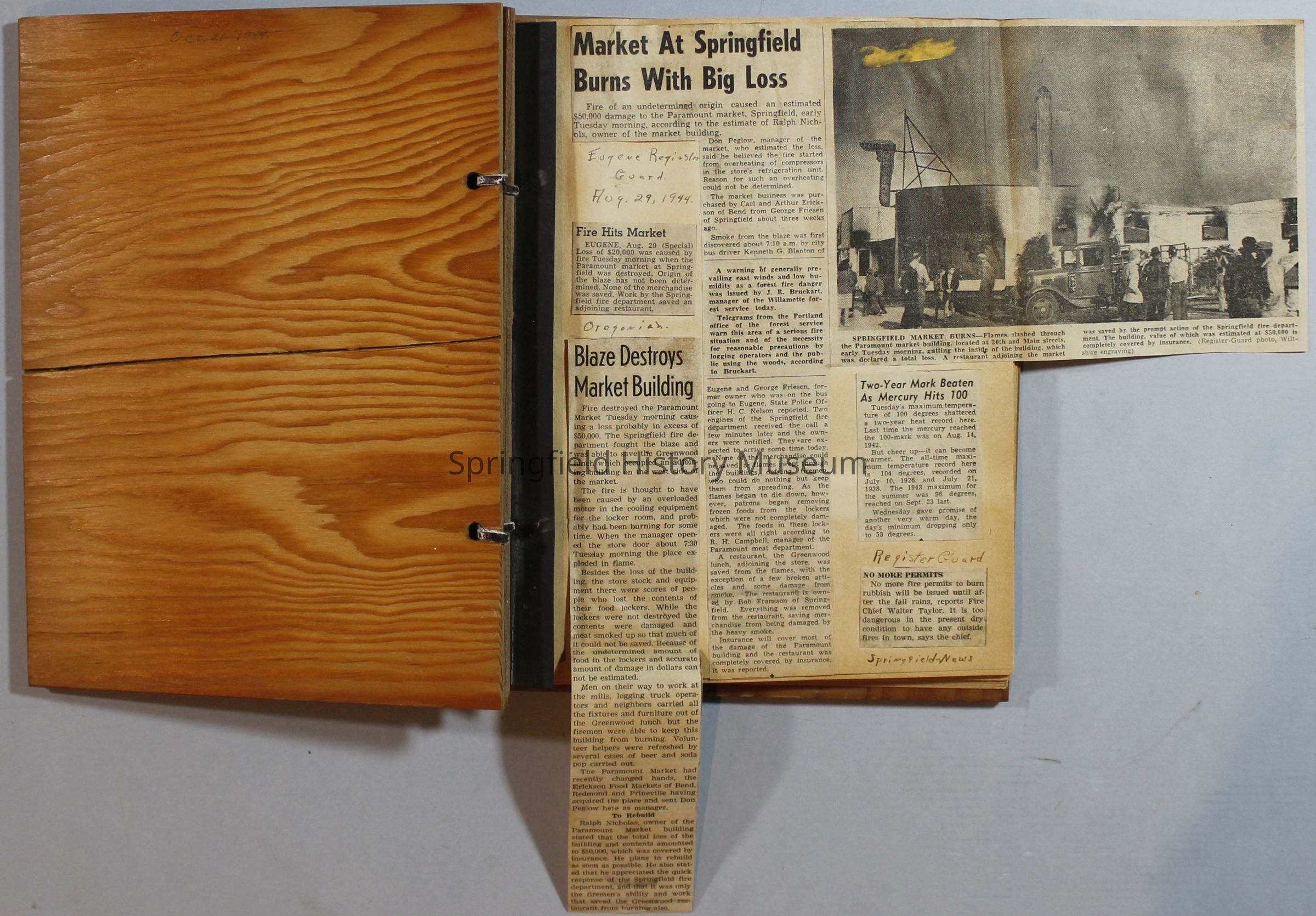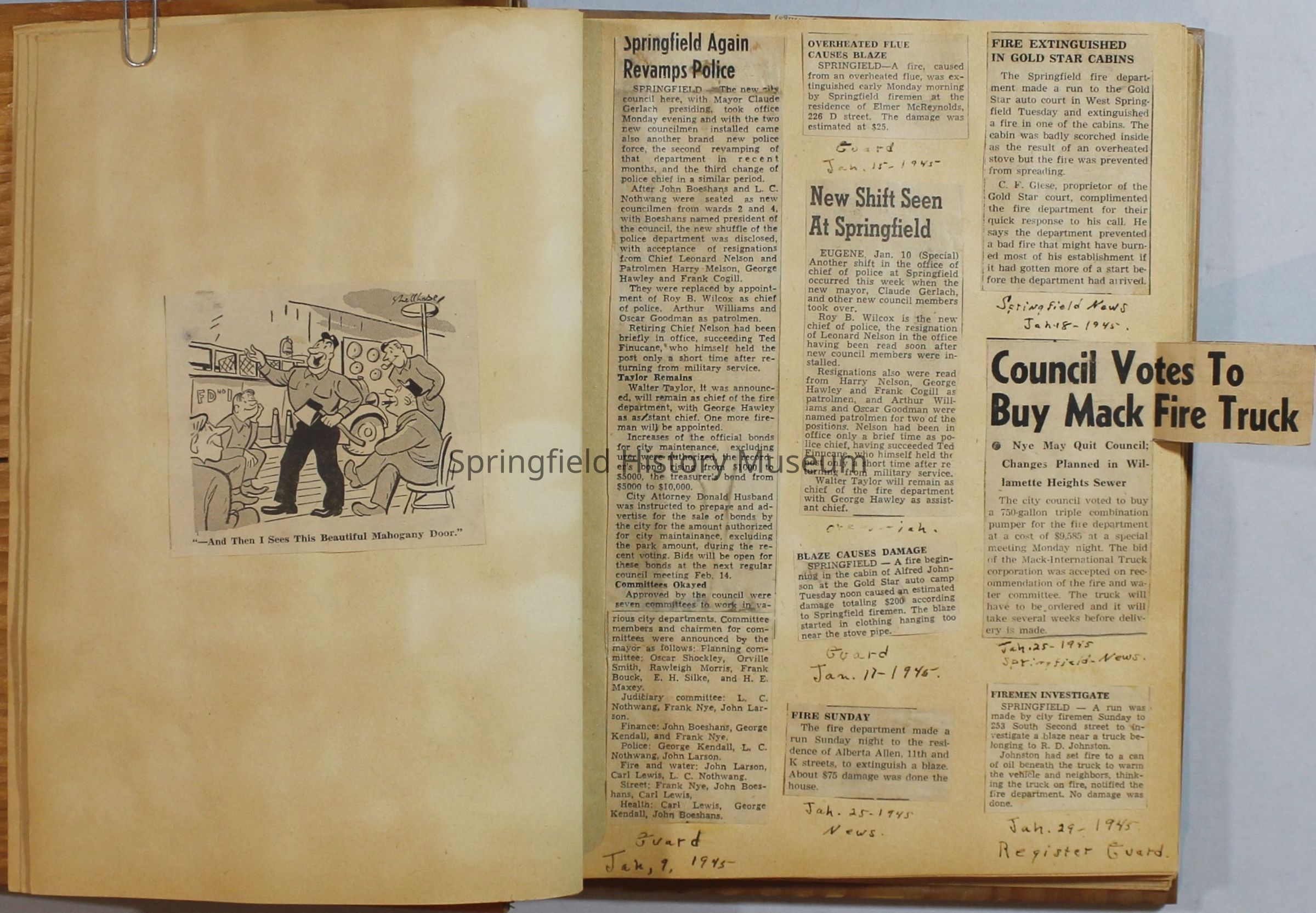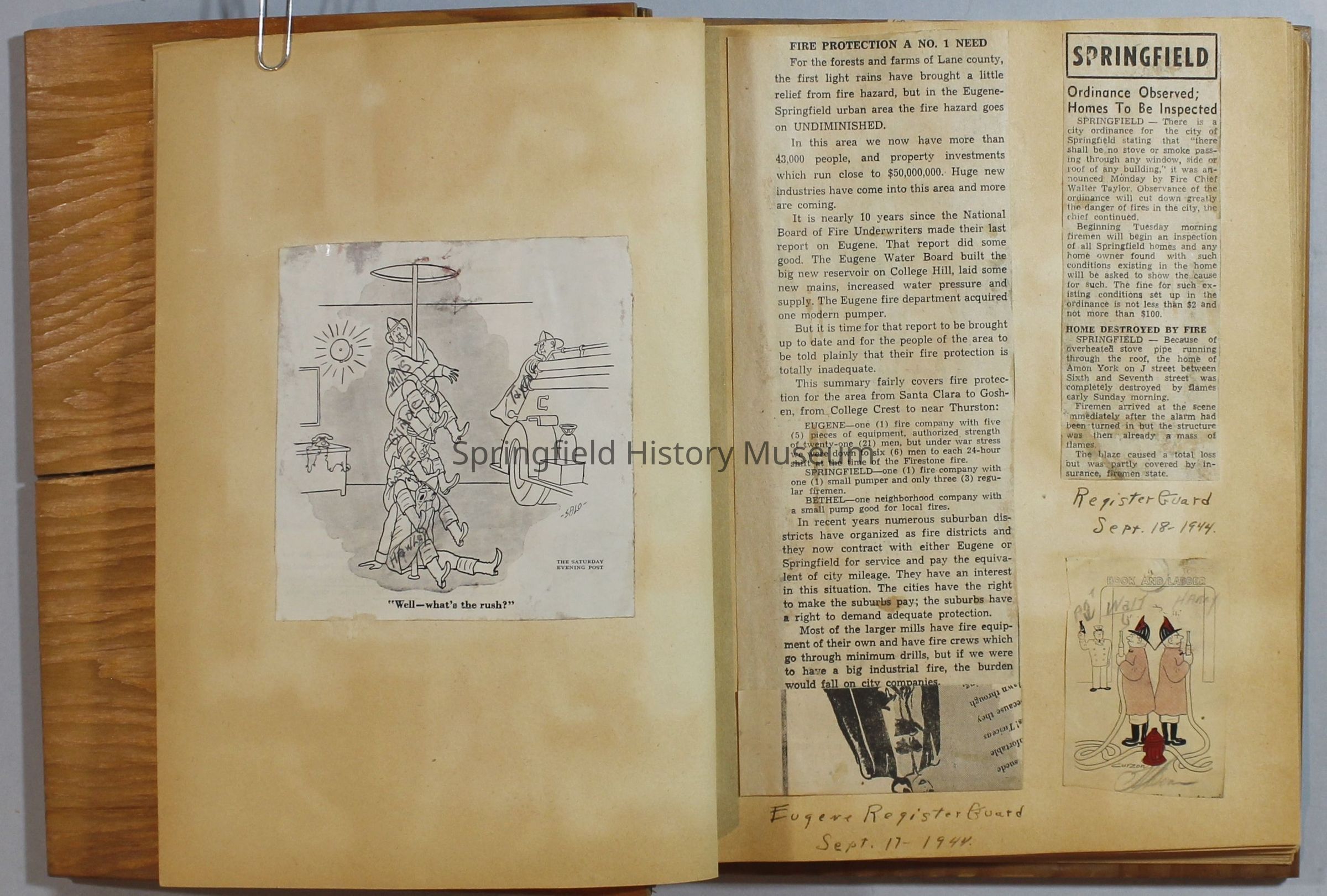 Scrapbook with newspaper clipping about Springfield fires, fire and police department, 1944-1945. Created by the Taylor family.Archive Items Details