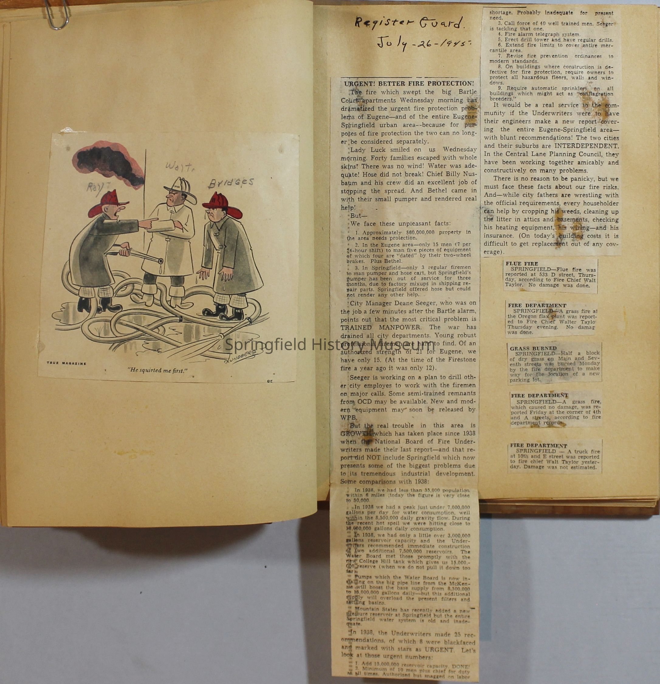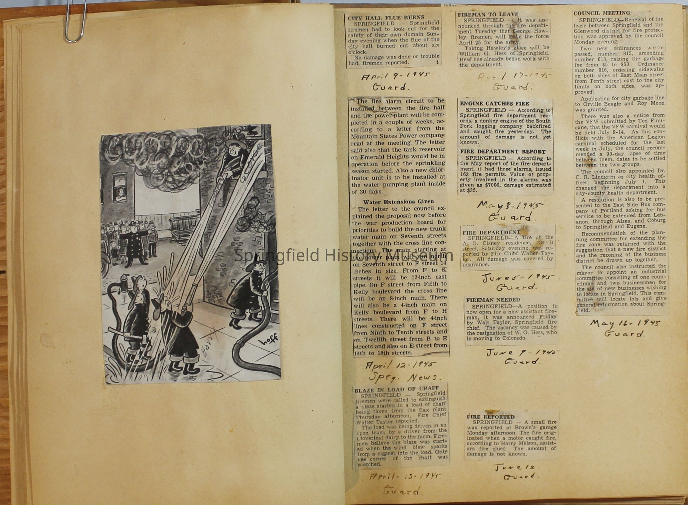 Scrapbook with newspaper clipping about Springfield fires, fire and police department, 1944-1945Entry/Object ID