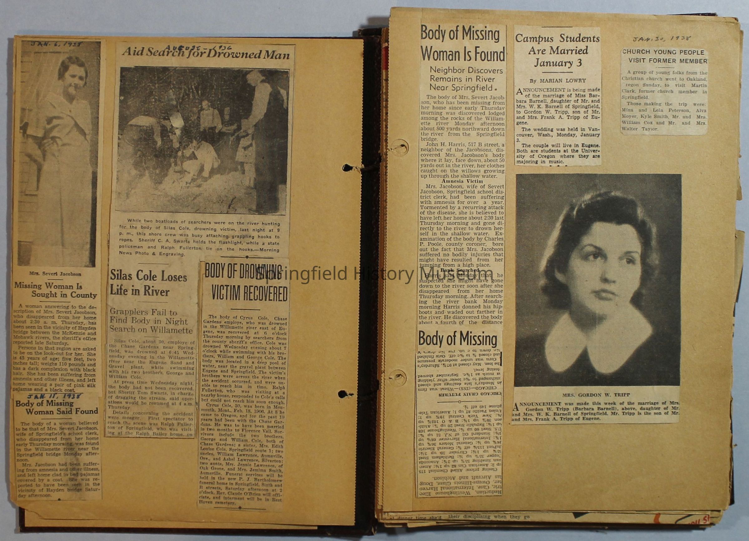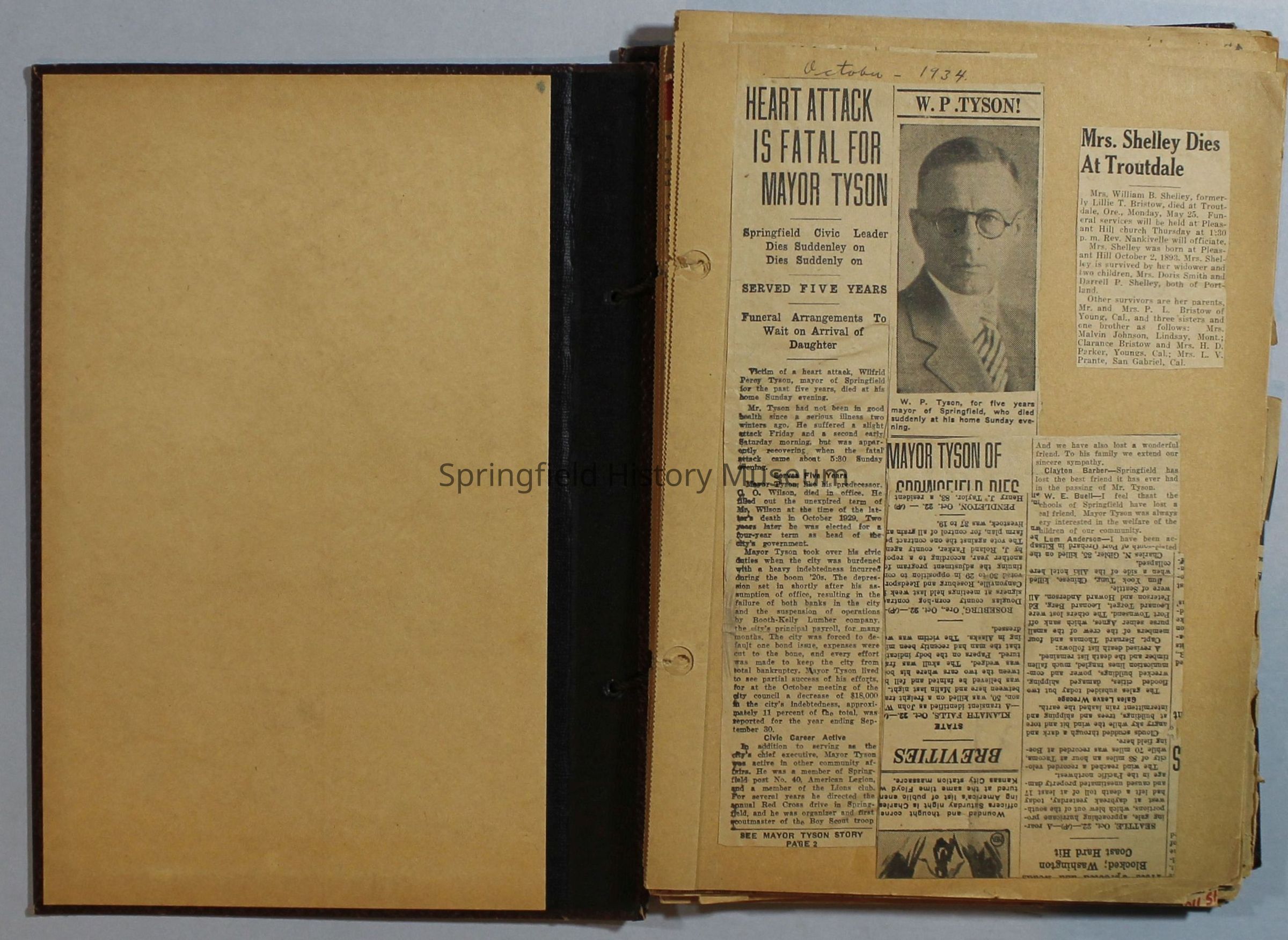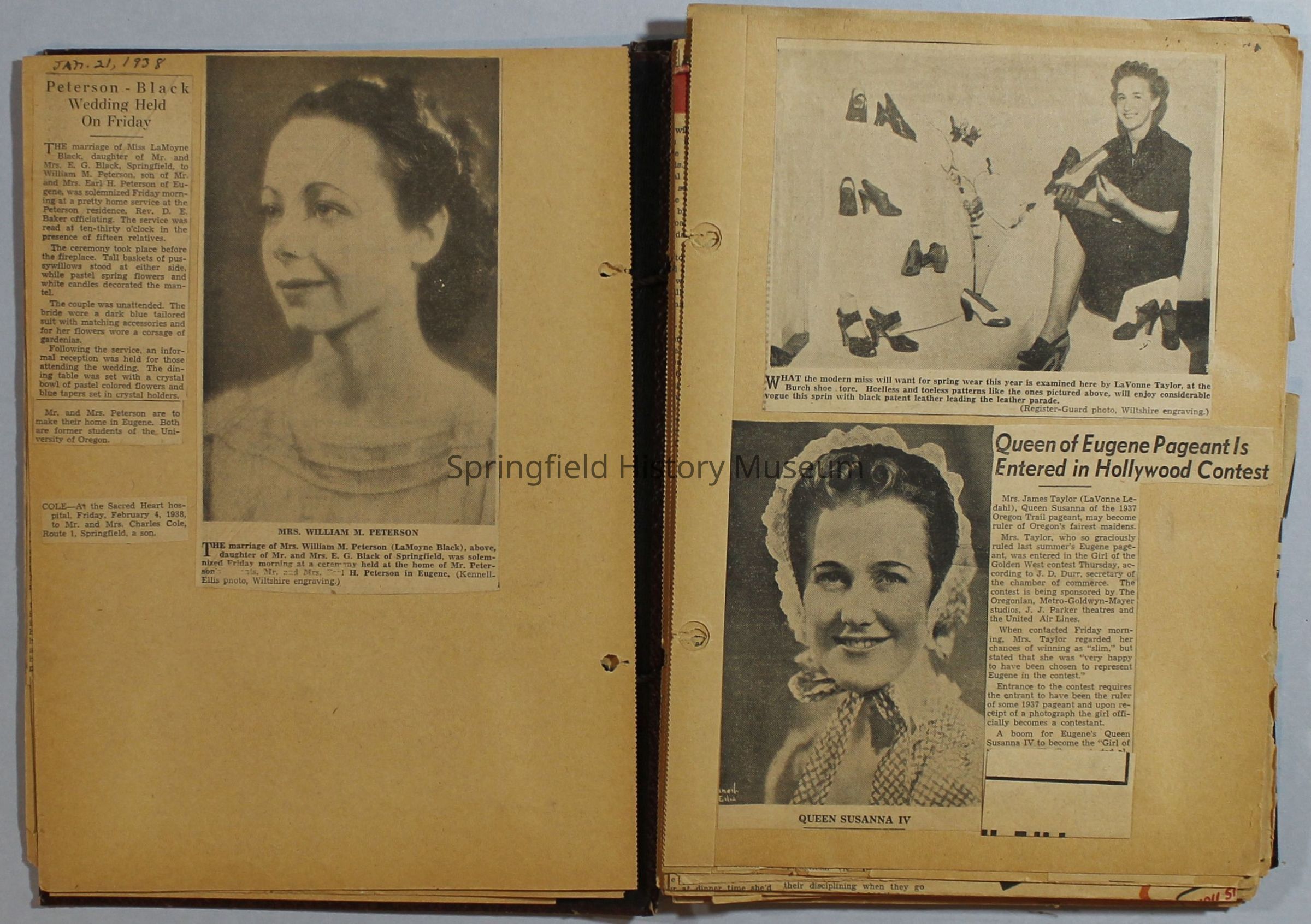 Scrapbook with newspaper clippings about Springfield area and Oregon, created by the Taylor family, circa 1934-1939. Loose pages at the end.Acquisition