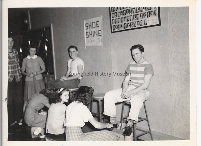 Springfield High school Girl Reserves, selling shoe shines. One student [front center] Sue Abarr, in the middle of two other female students giving shoe shines to two male students sitting on stools. Two students watching on left side of photo. Taken in school building; photo and sign above students receiving shoe shine. 1949