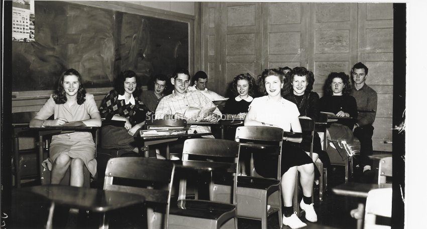Several Springfield High students sitting at desks in classroom, chalk board on left side of photo. Newspaper Staff 1946 - 1947.