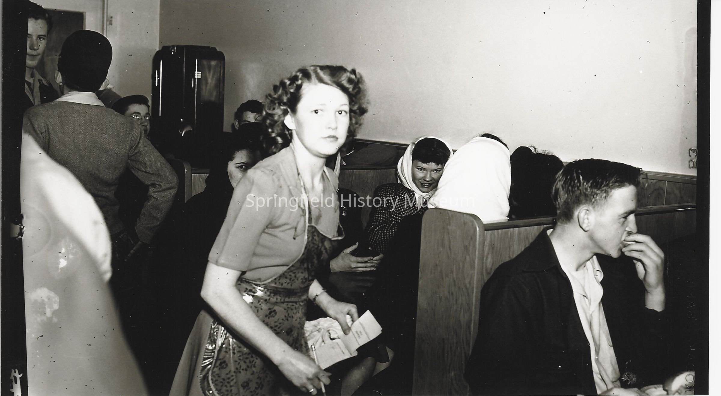 Springfield High School students at Vernes having lunch, student sitting in booths with waitress taking orders. One boy identified as Jim Todd, on the right. 1940s