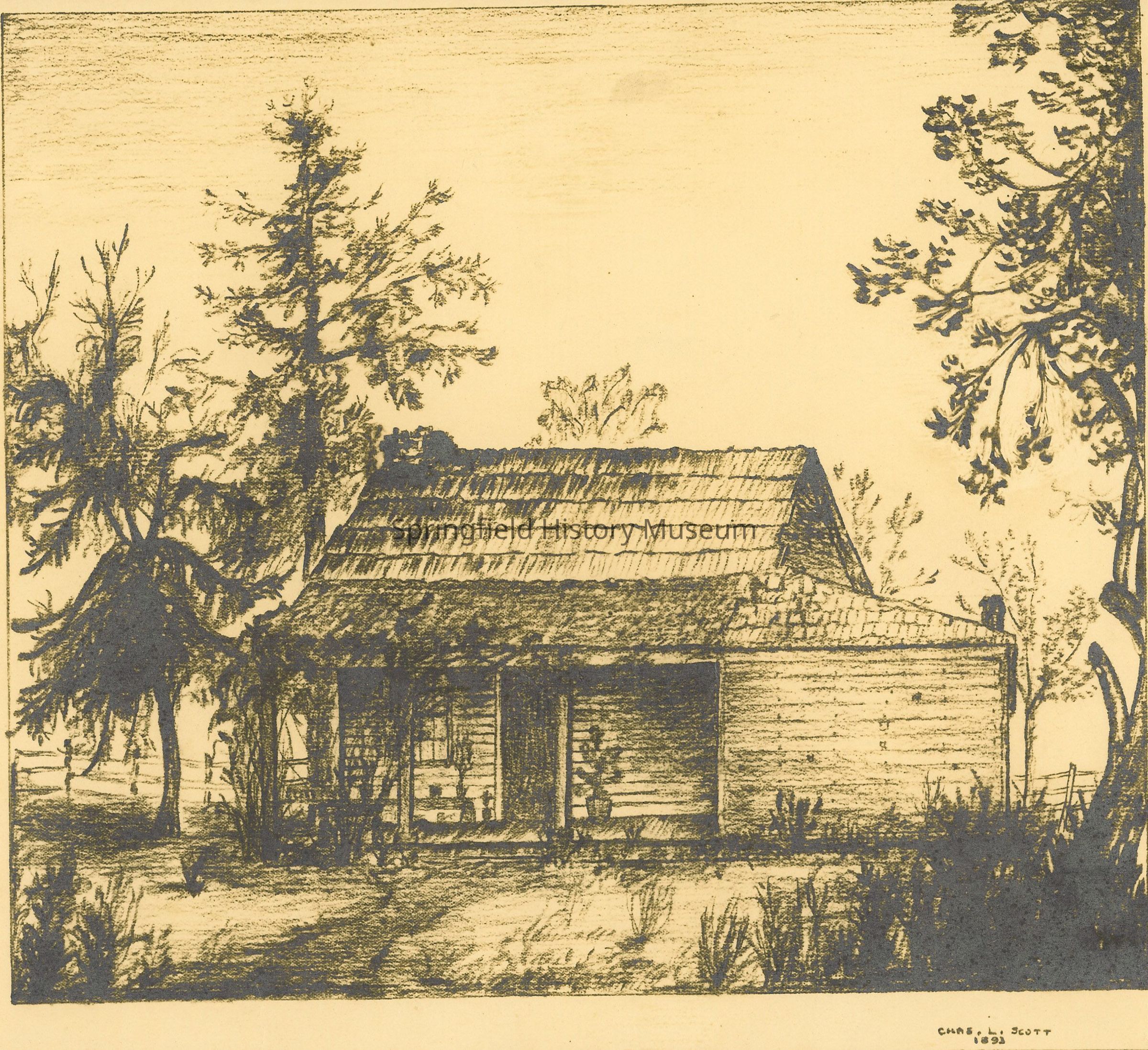 Sketch of Paul Brattain's original cabin, Springfield, 1893.Entry/Object ID