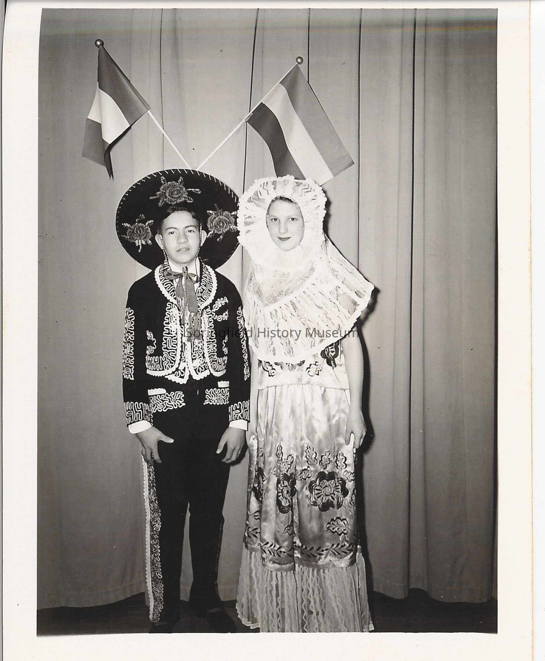 Boy and girl from Springfield High School Spanish Club dressed in Spanish outfit and flags above them.