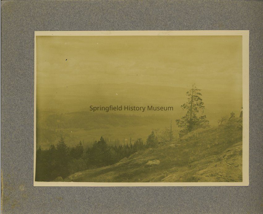 Taken from Spencer Butte. Trees, a rock down the hillside. circa 1905-1915.