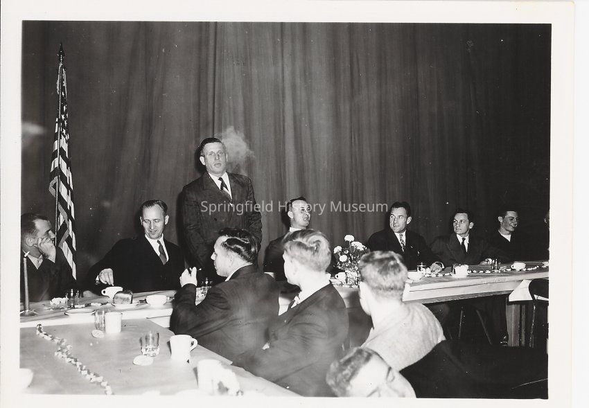 Springfield High school banquet. Eleven people sitting at large table with speaker standing. undated