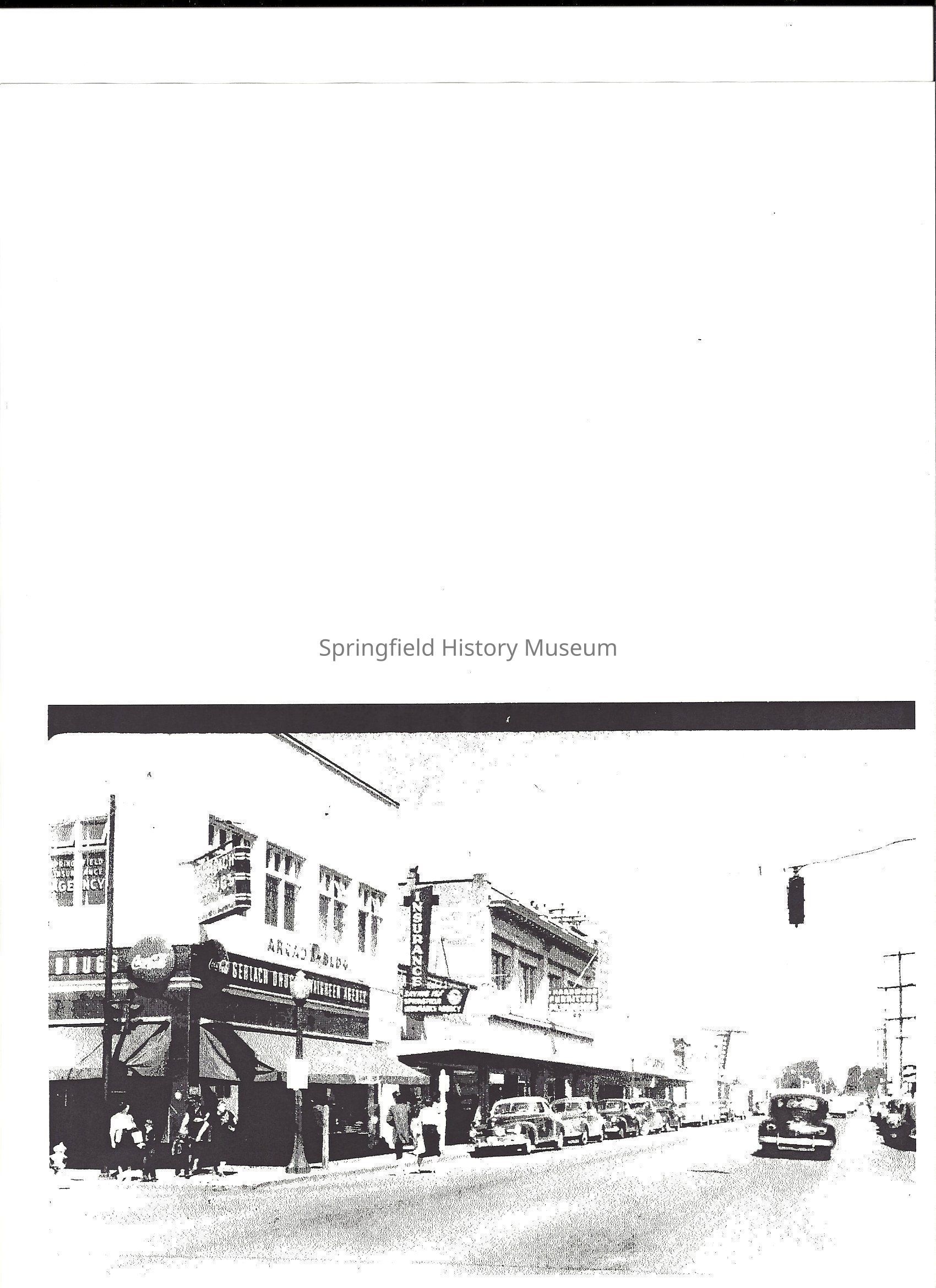 Main Street, Springfield businesses. Gerlach Pharmacy, Wright's Hardware, Furniture and Plumbing.