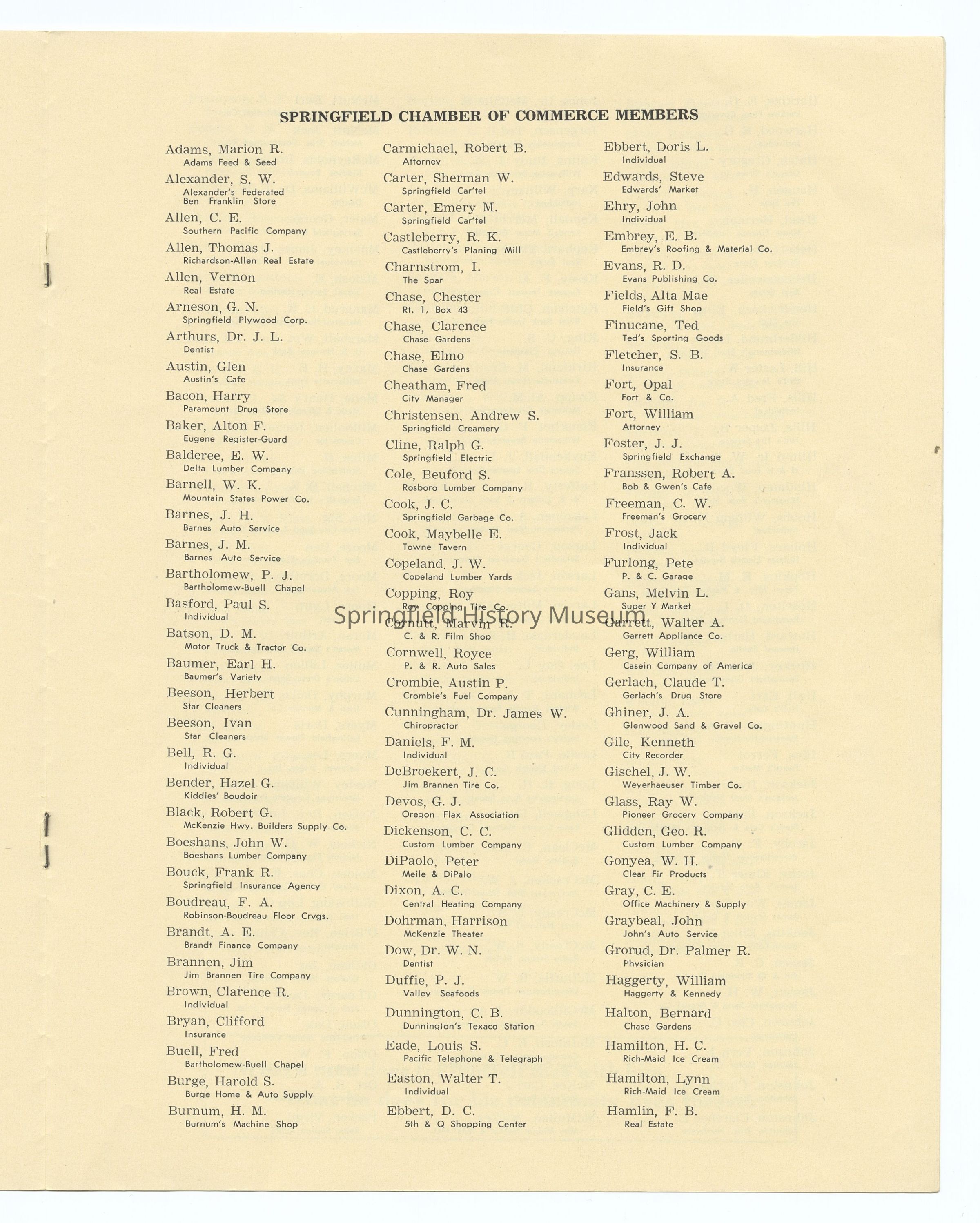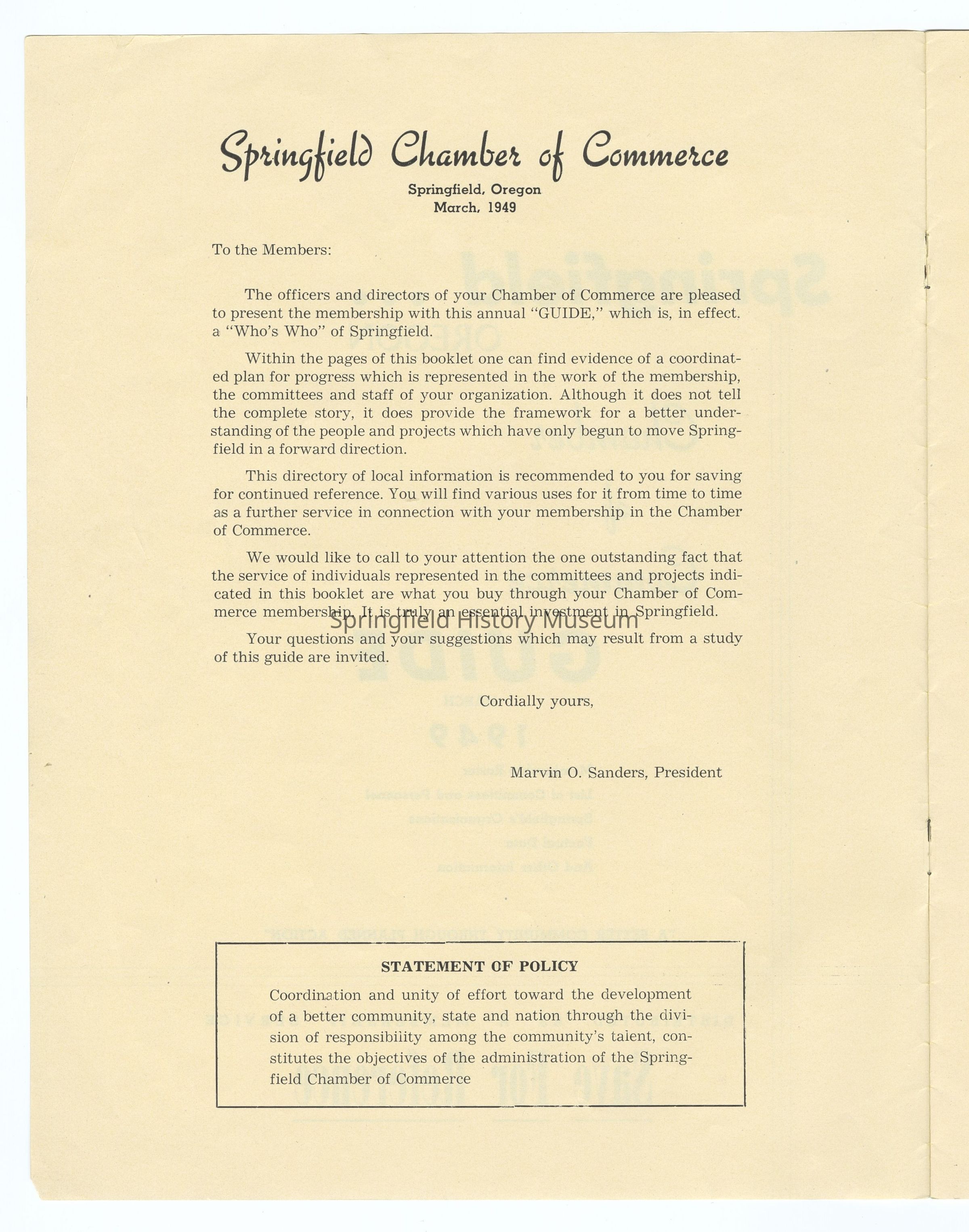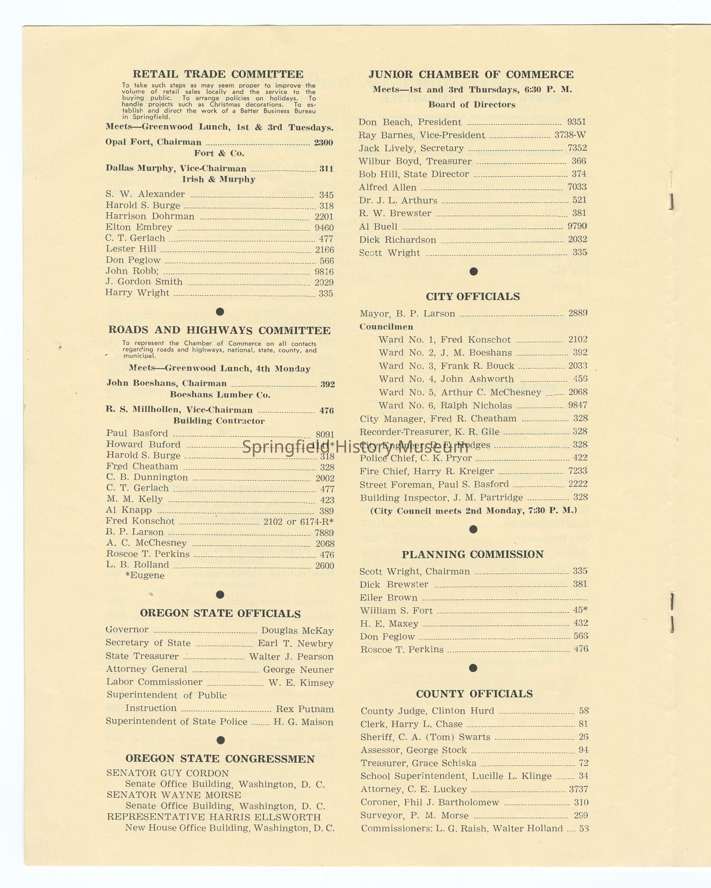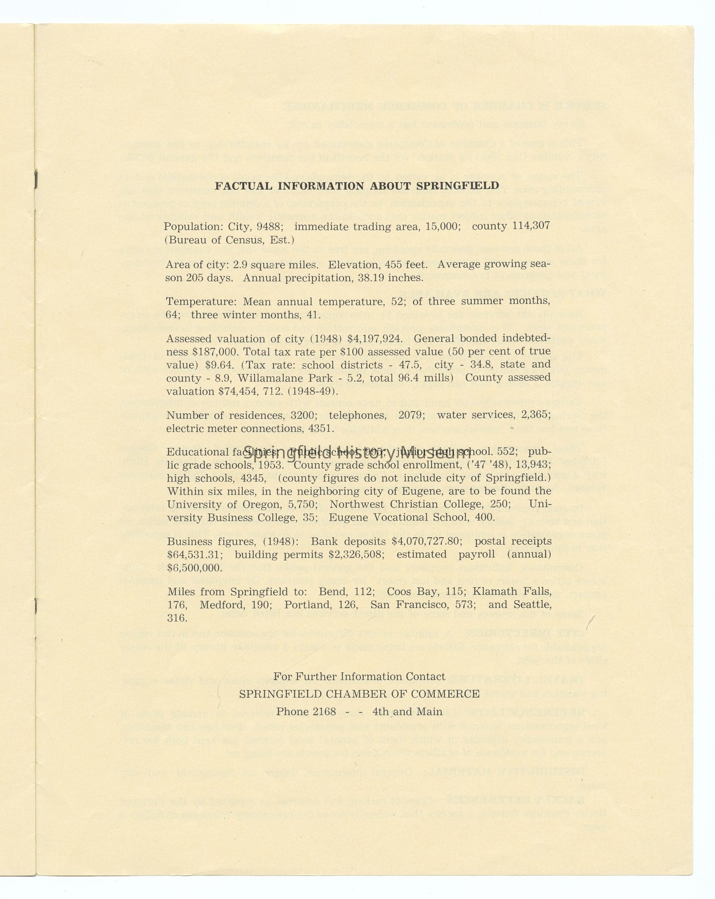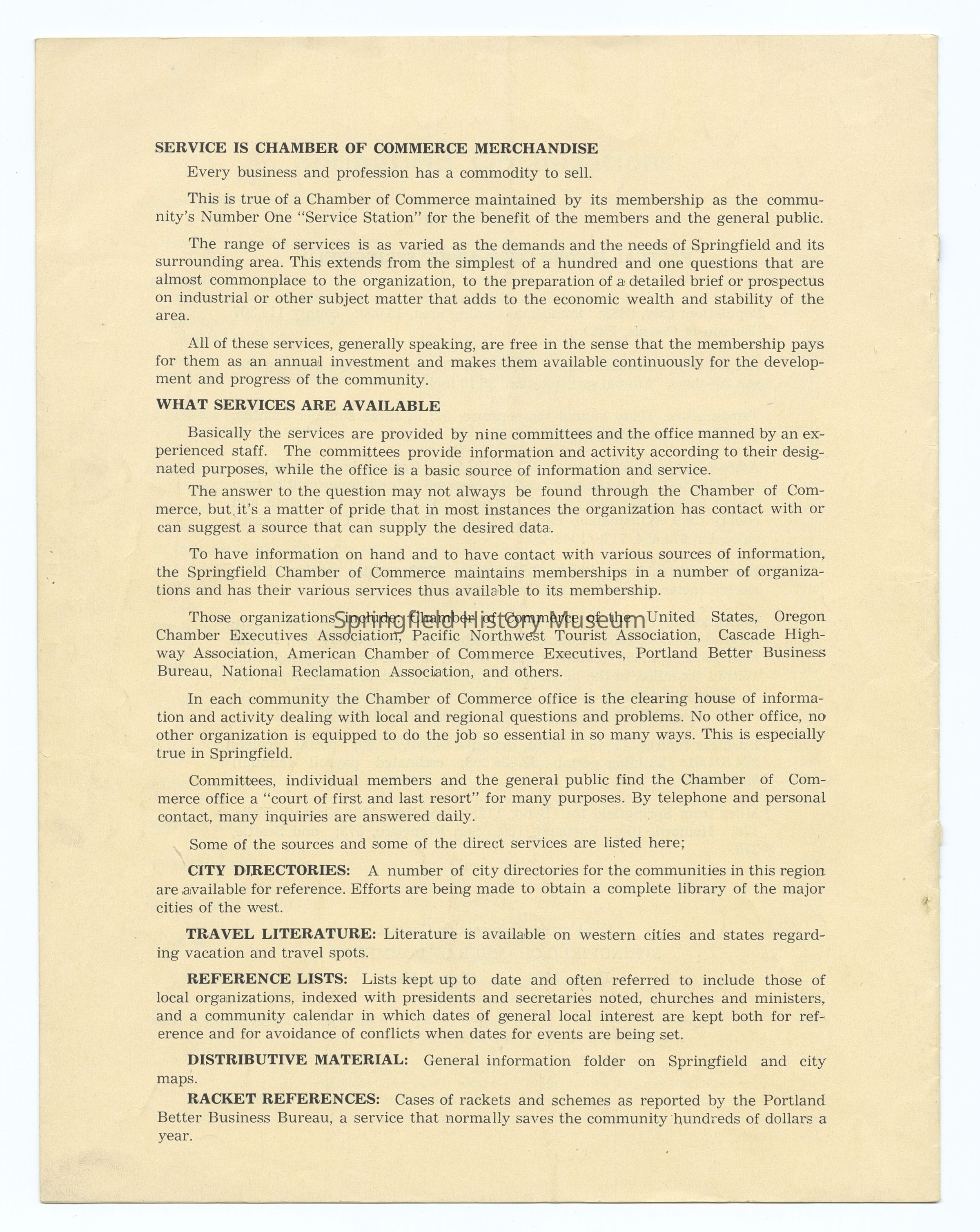 Informational Guide on the Springfield Chamber of Commerce and Springfield, Oregon, 1949. Compiled by the Springfield Chamber of Commerce. Contains: Membership roster, List of Committees and Personnel, Springfield's Organizations, Factual Data, and other information. Appr. 6 pages.Context