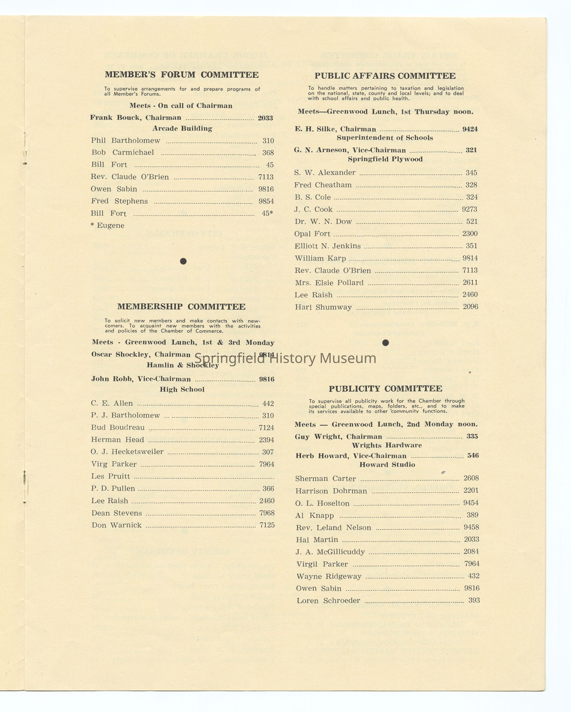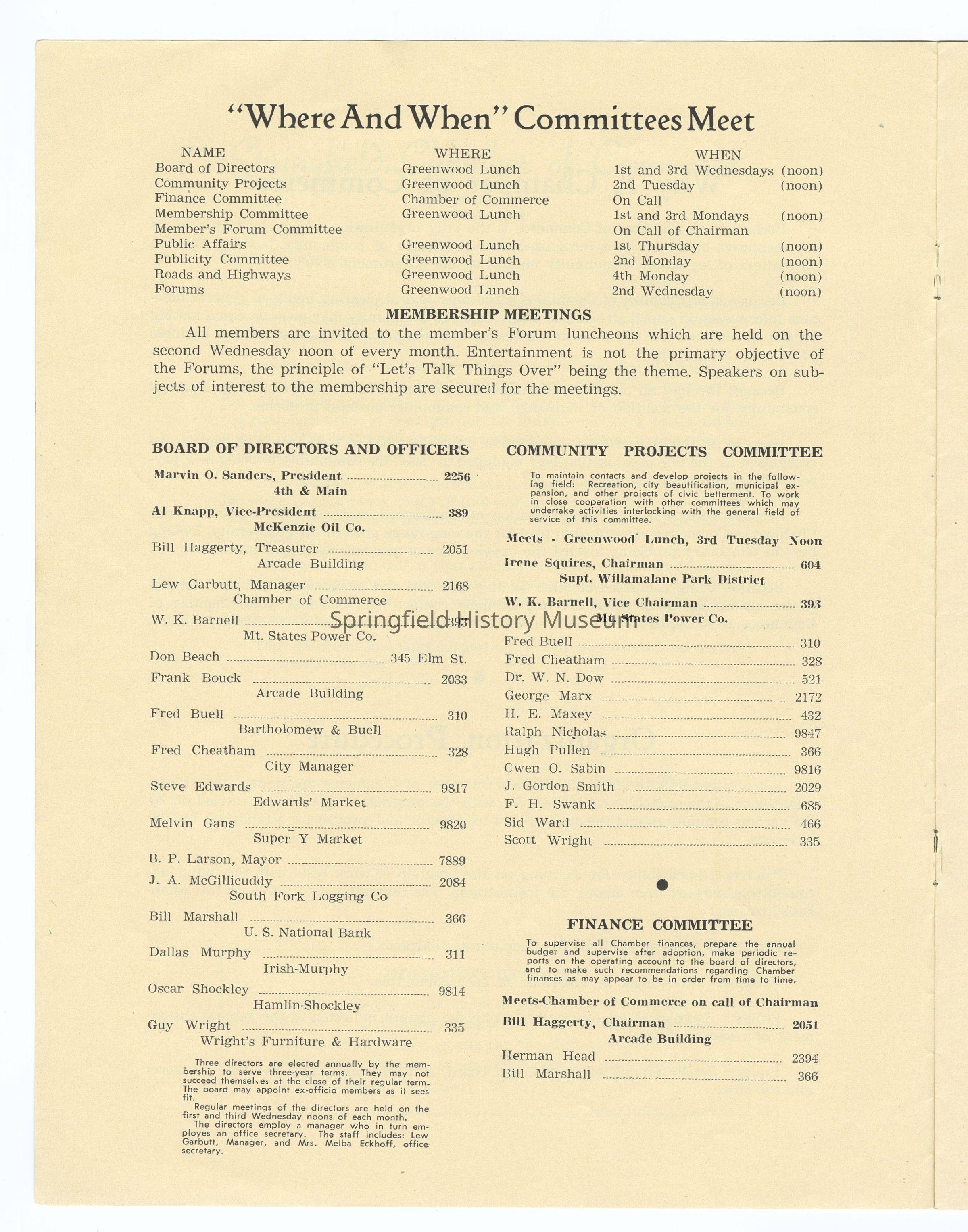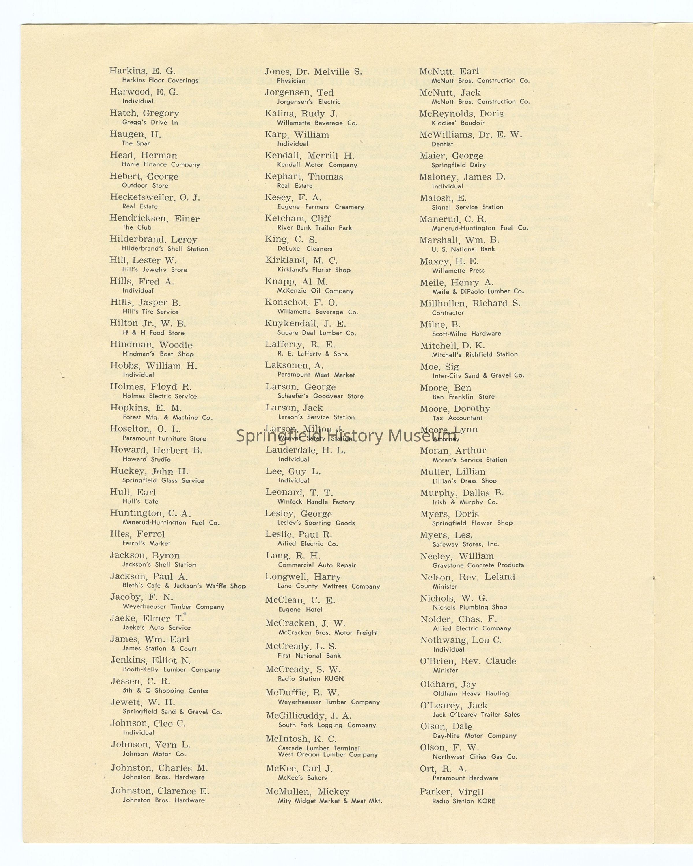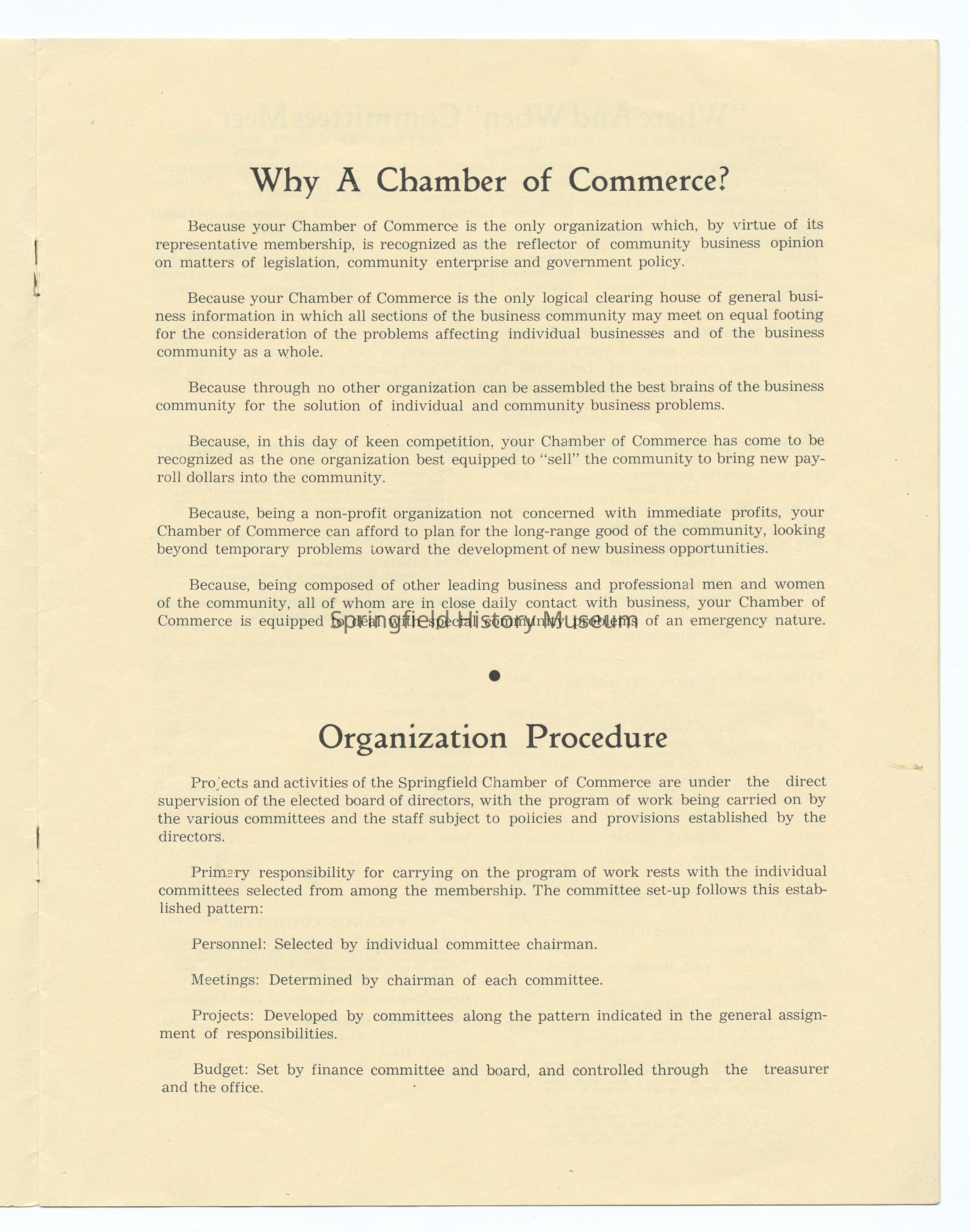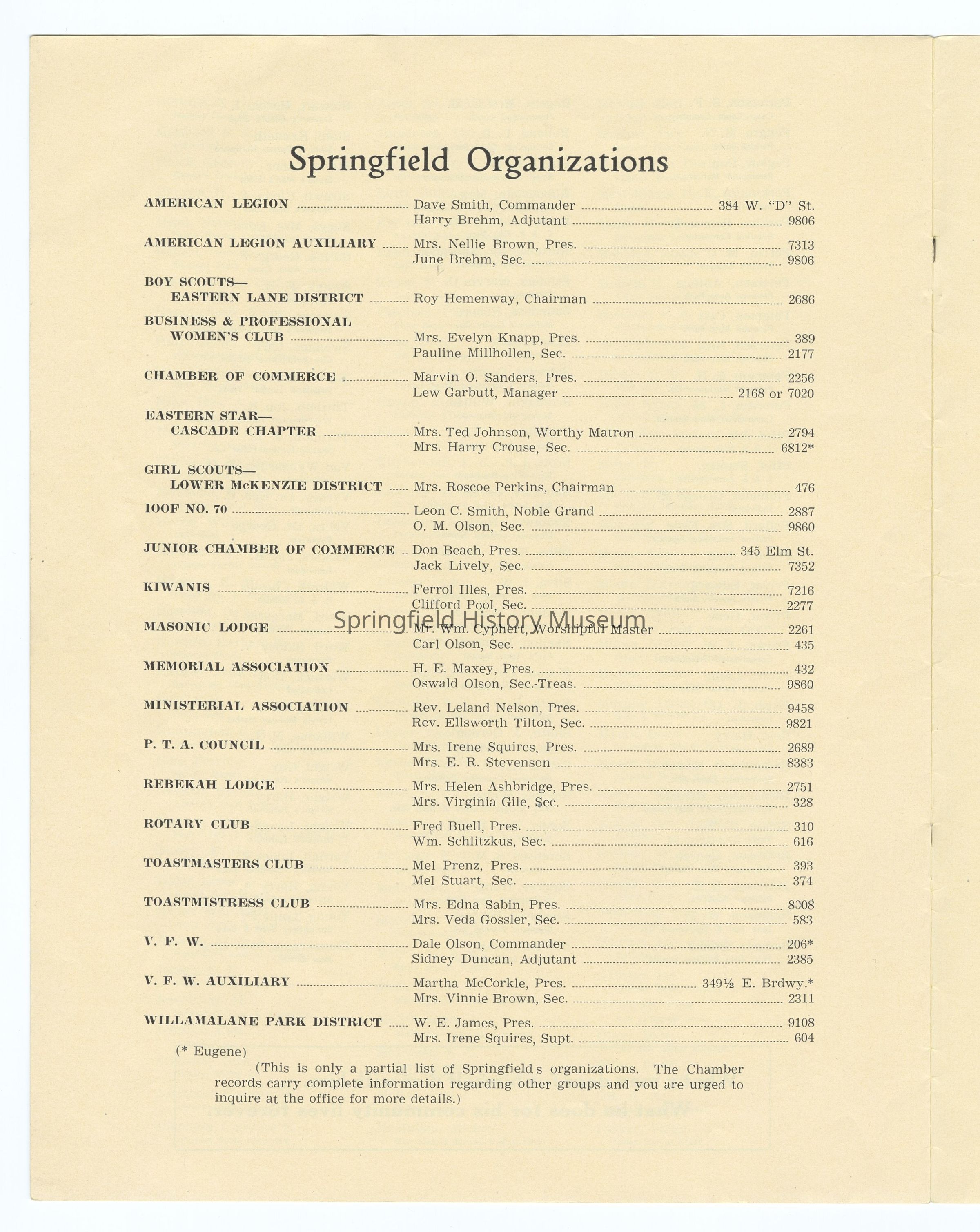 Informational Guide on the Springfield Chamber of Commerce and Springfield, Oregon, 1949. Compiled by the Springfield Chamber of Commerce. Contains: Membership roster, List of Committees and Personnel, Springfield's Organizations, Factual Data, and other information. Appr. 6 pages.Context