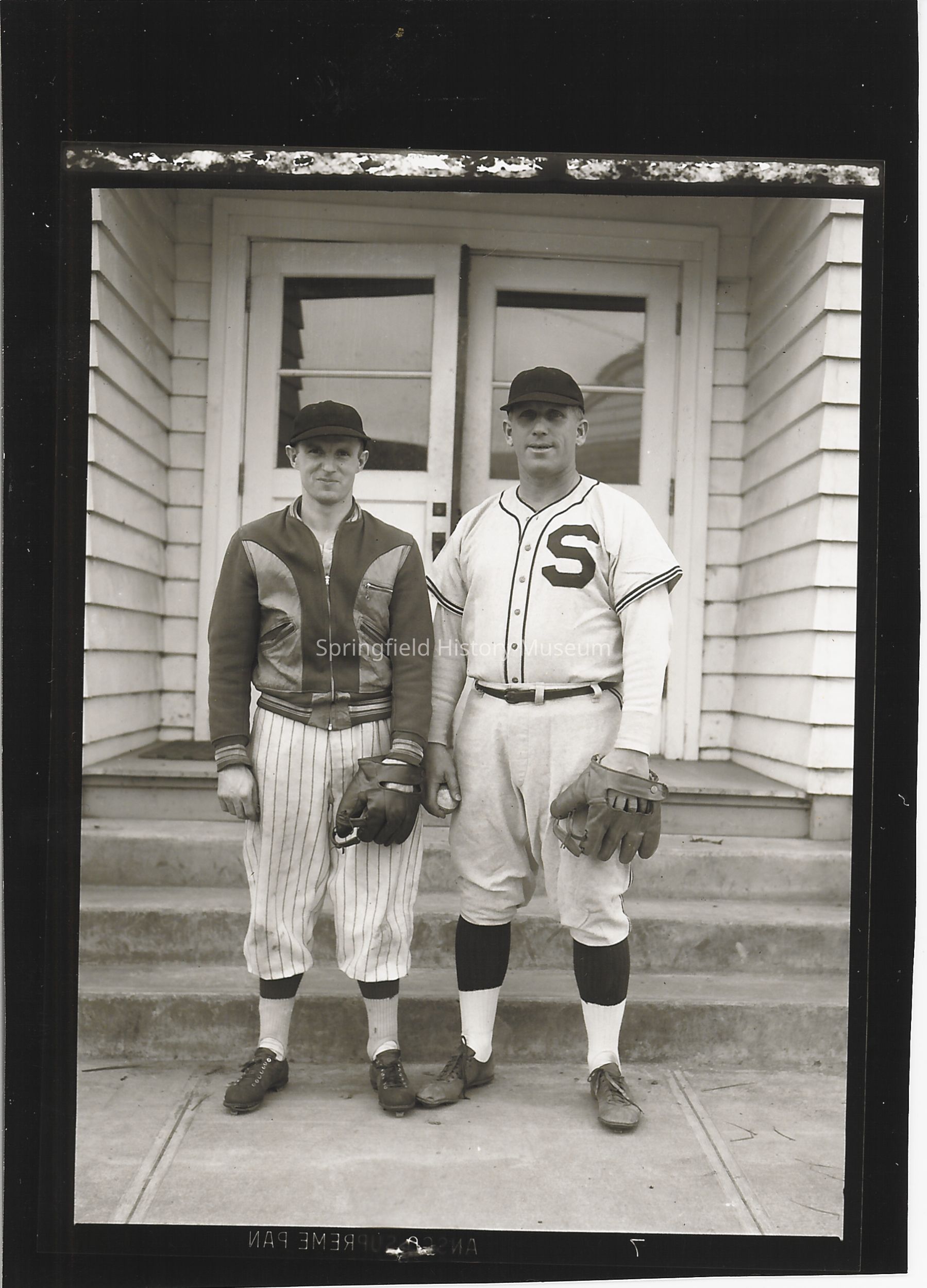 Springfield High Baseball coachs, Paul Johnston and John Young, outside school building, dressed in uniforms.