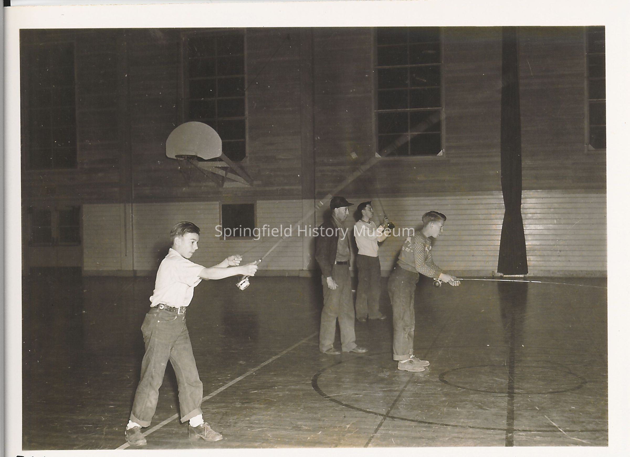 Springfield High School Rod and Reel club practicing in gym, basketball hoop in top right corner. circa 1948