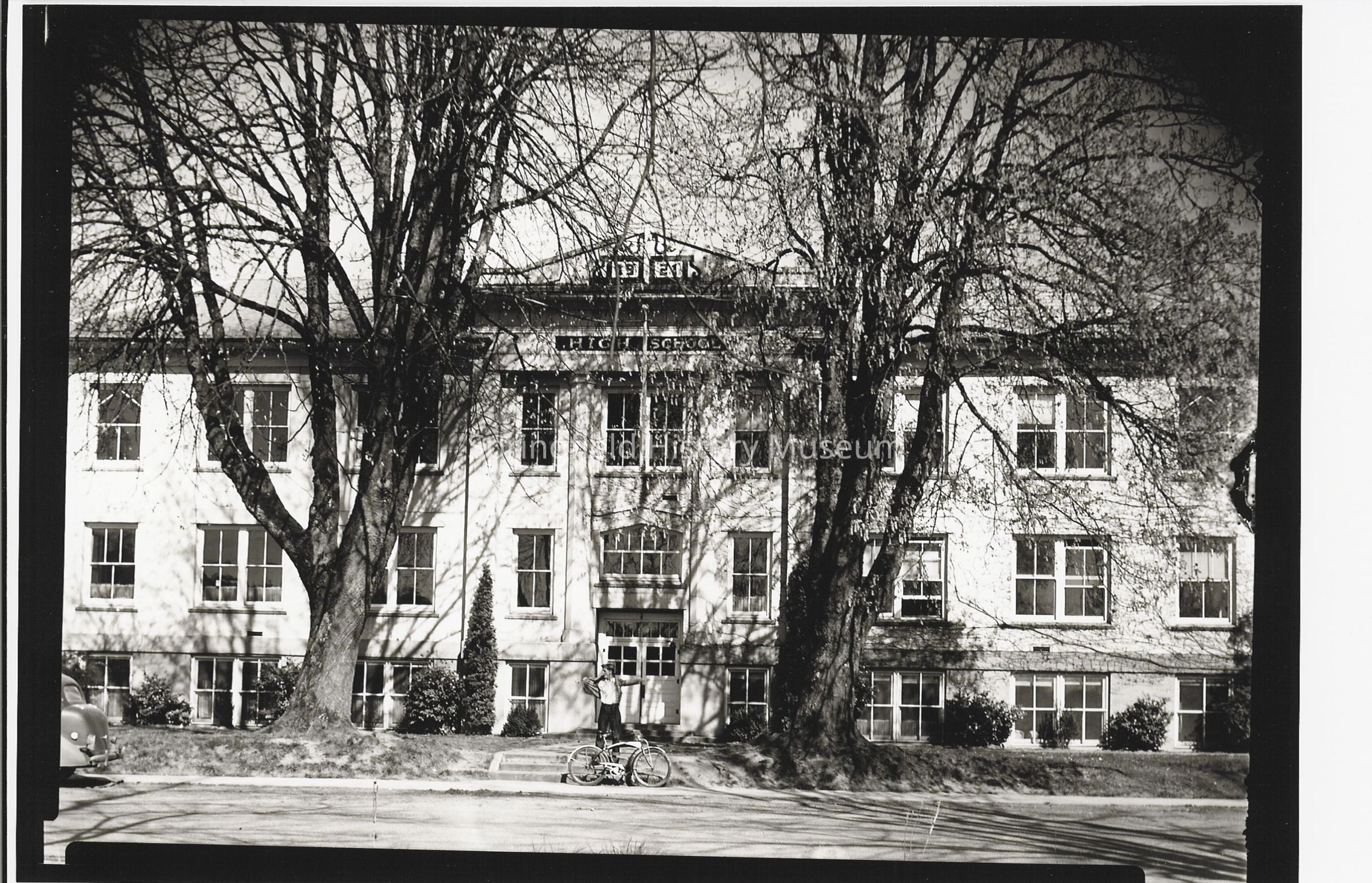 Springfield High School building, behind trees and a boy with a bike. School building built in 1921