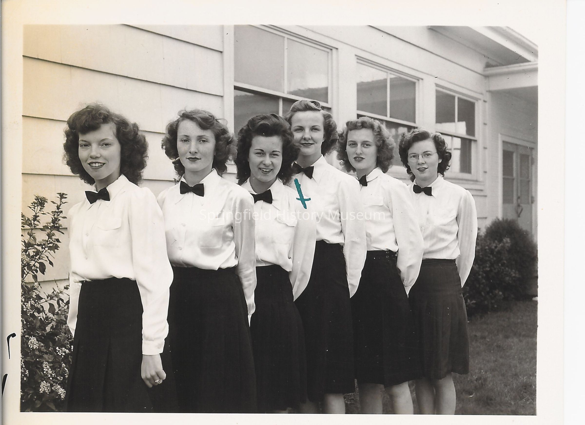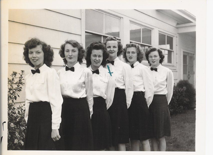 Springfield High School Usherettes, in uniforms and posing outside of school building. 1948