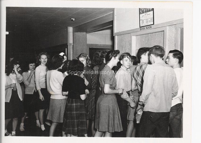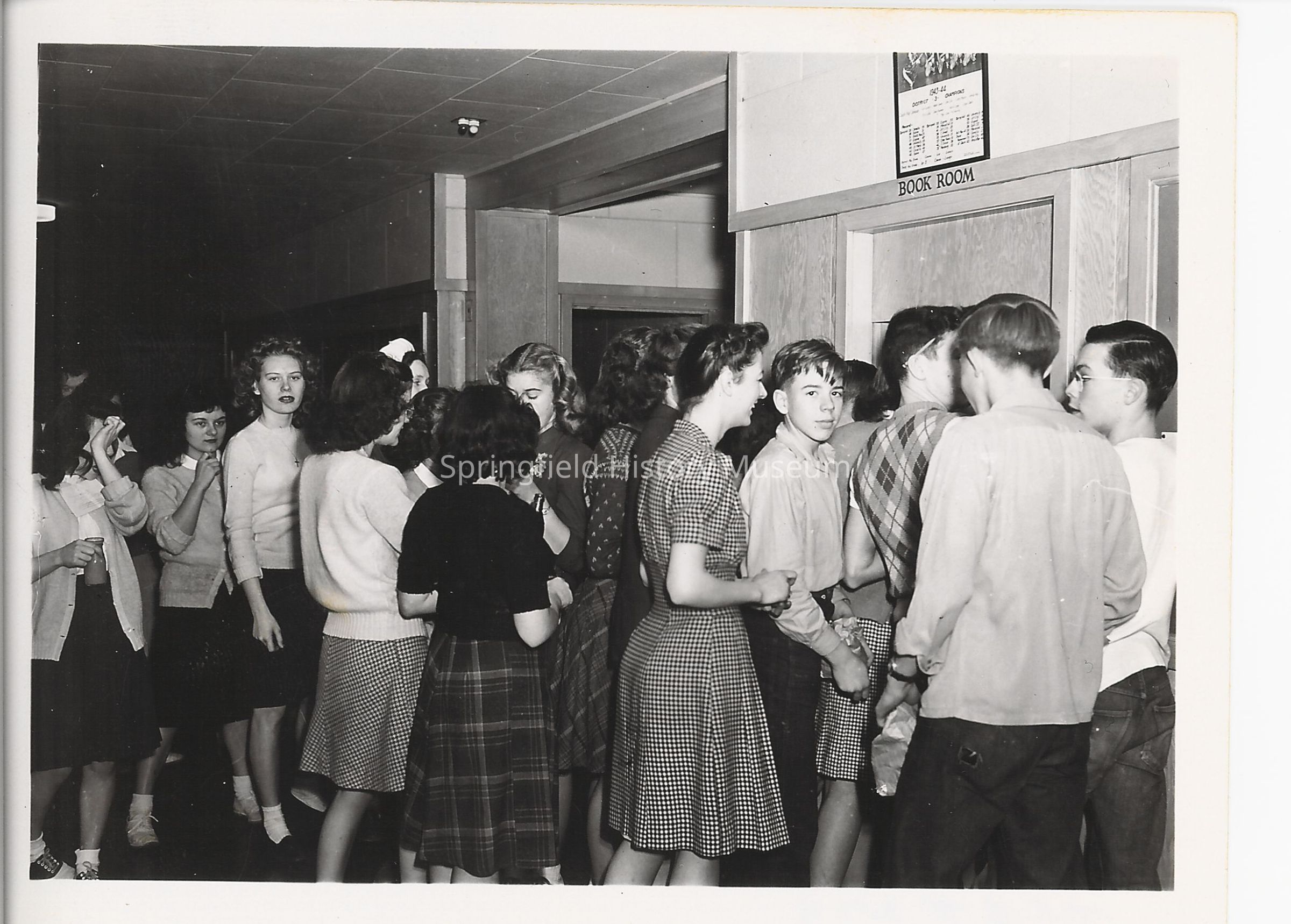 Springfield High School students, waiting for student store to open, inside building. 1950s