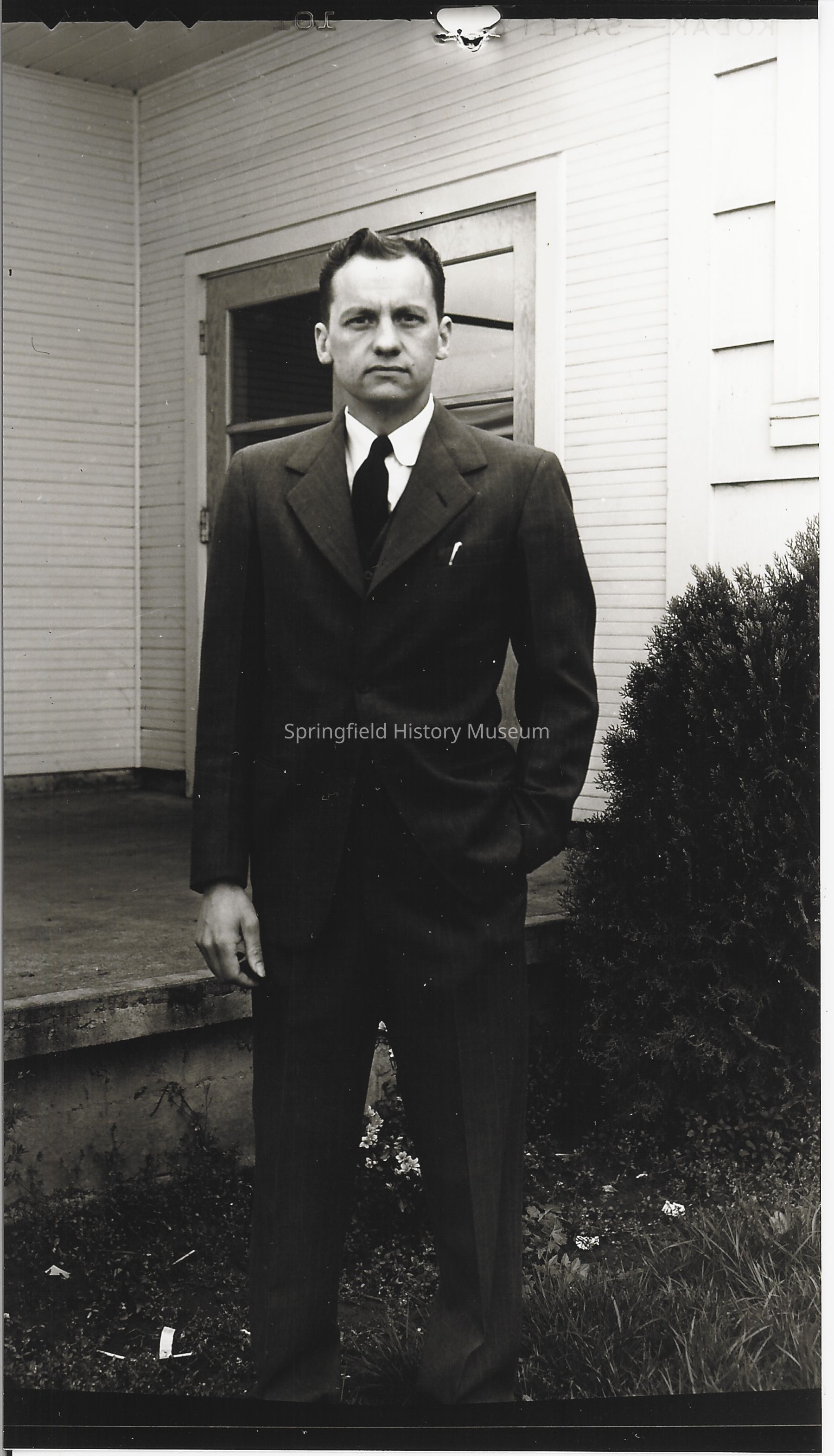 Springfield High Track Coach Kernel Buhler, posing outside, in a black suit and tie. 1940s
