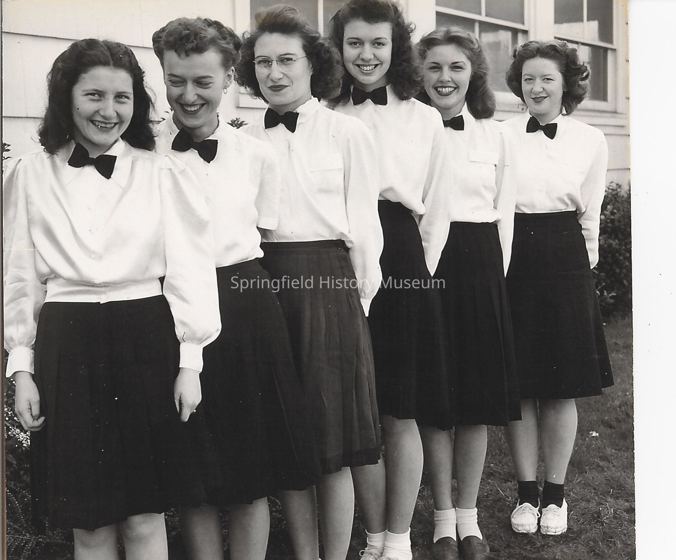 Springfield High School Usherettes, posing outside infront of school building. 1948