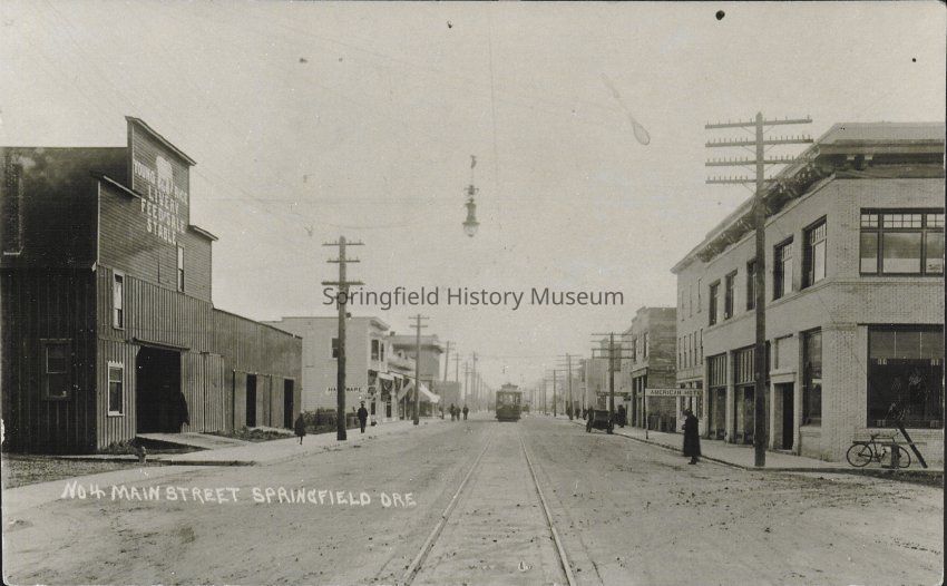 Marked 'No. 4 Main Street Springfield Ore". Circa 1910 [notice streetcar is in] Accession Book says "Negative #10".