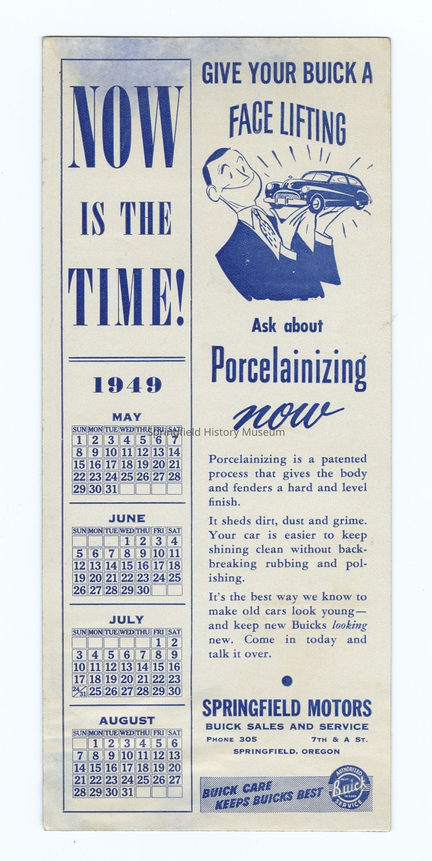 Springfield Motors Buick Service Advertisement and Calendar, 1949 "Give your Buick a Face Lifting, Ask about porcelainizing now"Context