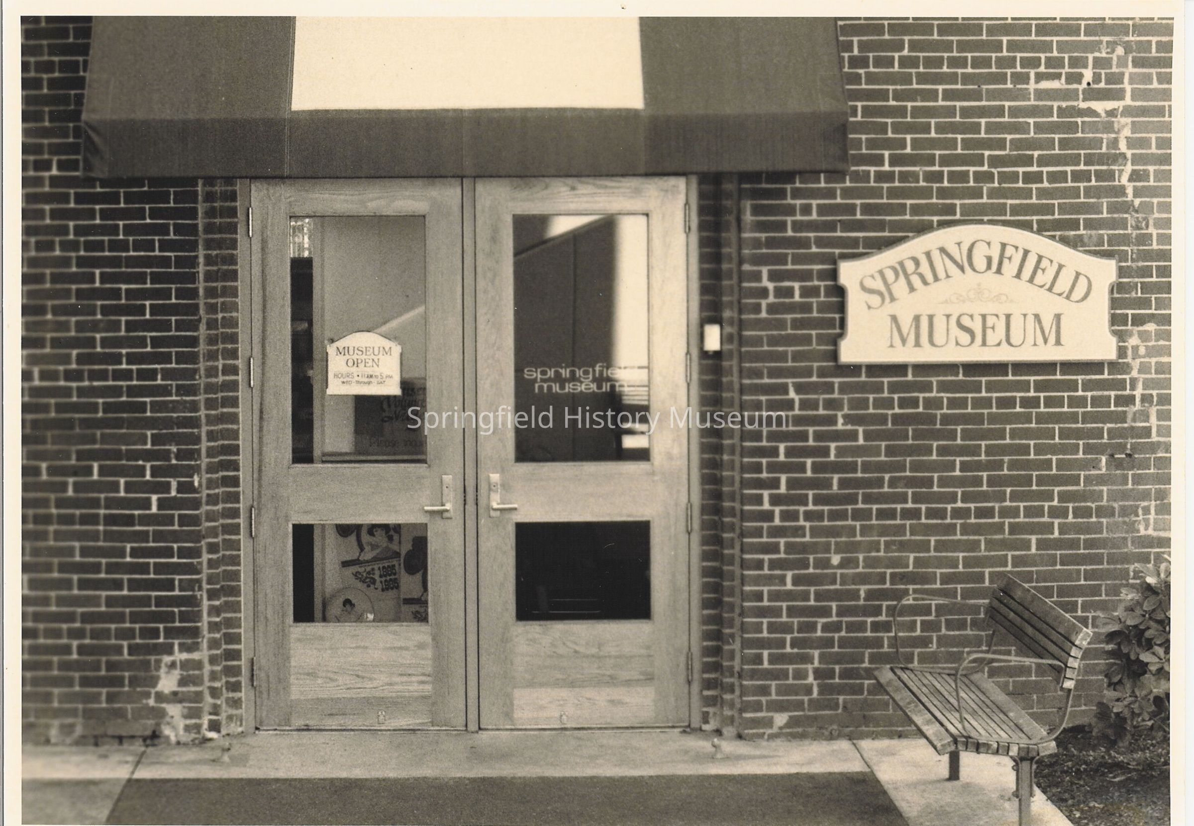 Entrance of Springfield Museum with bench on right side of double door entrance. Museum is the old Pacific Power Building. Photo dated 1980s