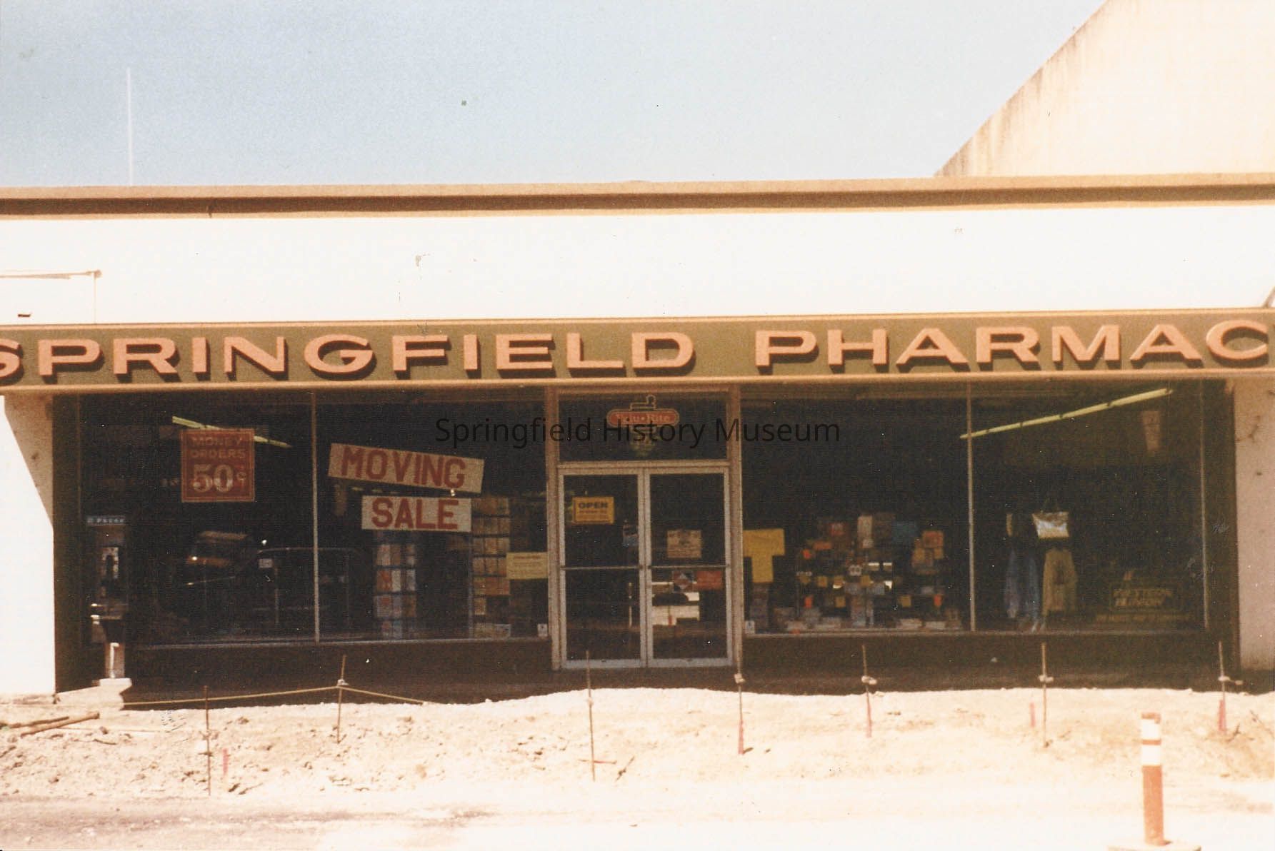 Springfield Pharmacy at 6th and Main Street, front entrance. During reconstruction of Main by state highway department, 1988.