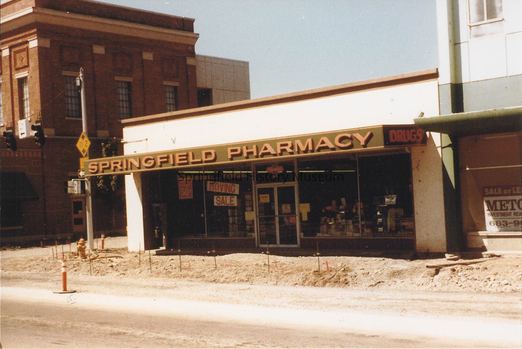 Springfield Pharmacy at 6th and Main Street, front entrance. During reconstruction of Main by state highway department, 1988.