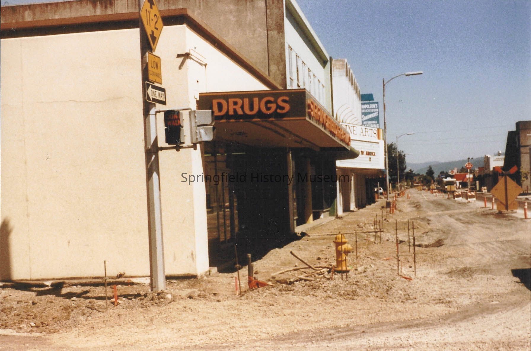 Springfield Pharmacy at 6th and Main Street, looking east. During reconstruction of Main by state highway department, 1988.
