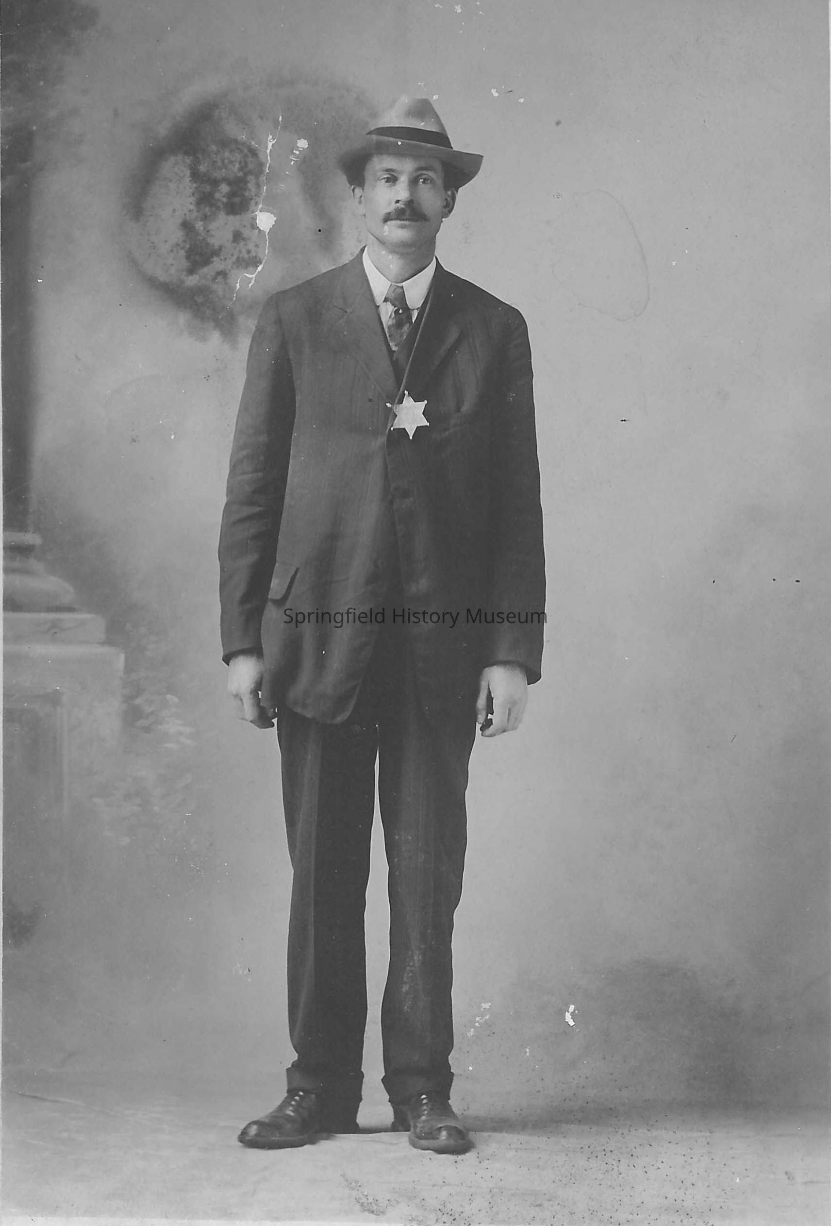 Springfield Town Marshall, Roy Love. Portrait of standing man with star-badge on coat. Undated. circa 1900.